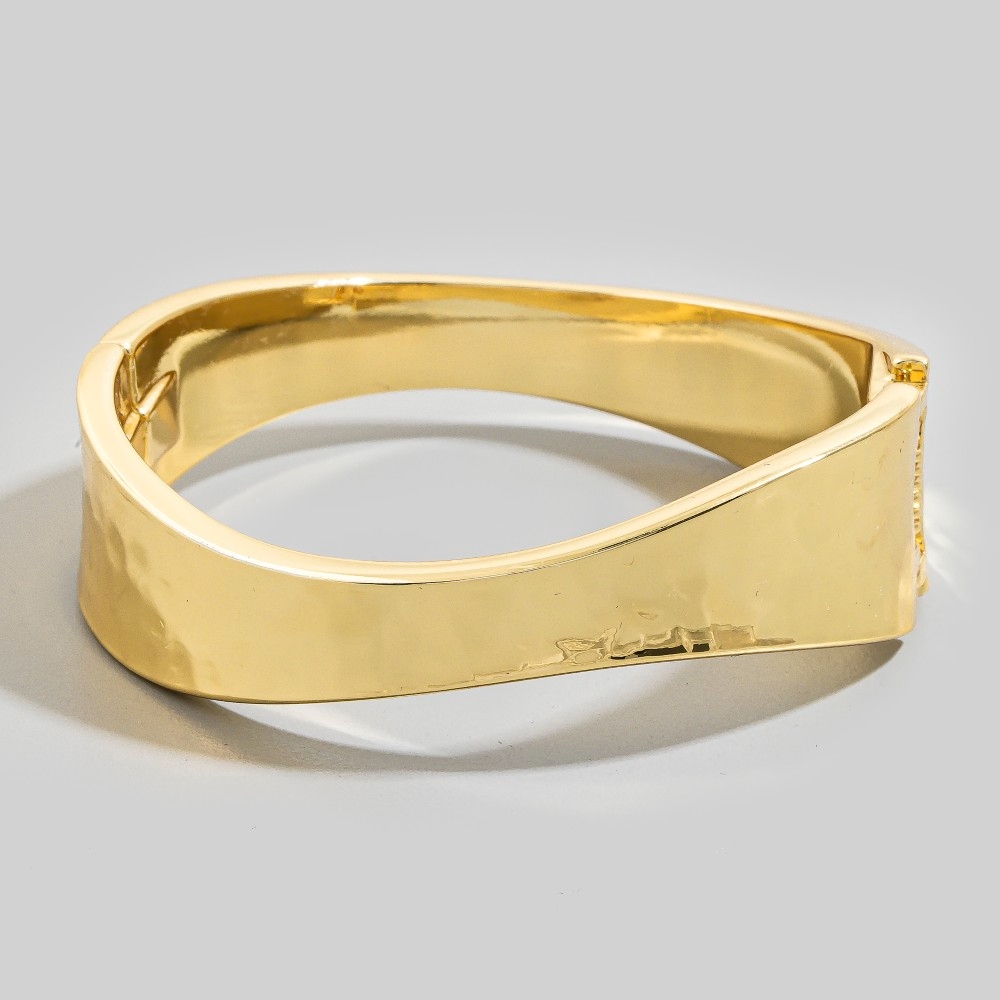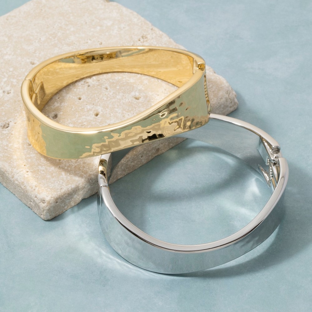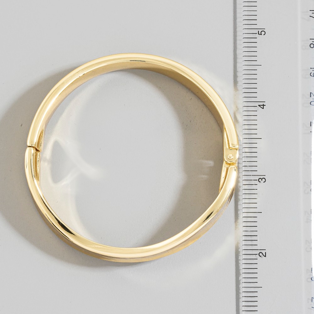 • Add a touch of luxury to any outfit, this bangle bracelet features a distinct sleek sculptural hinged design. Elevate your fashion game with this versatile bangle bracelet, seamlessly integrating into your signature style. Available in 2. This item is sold in packs of 1.