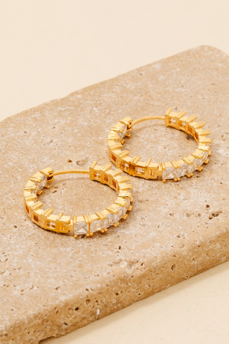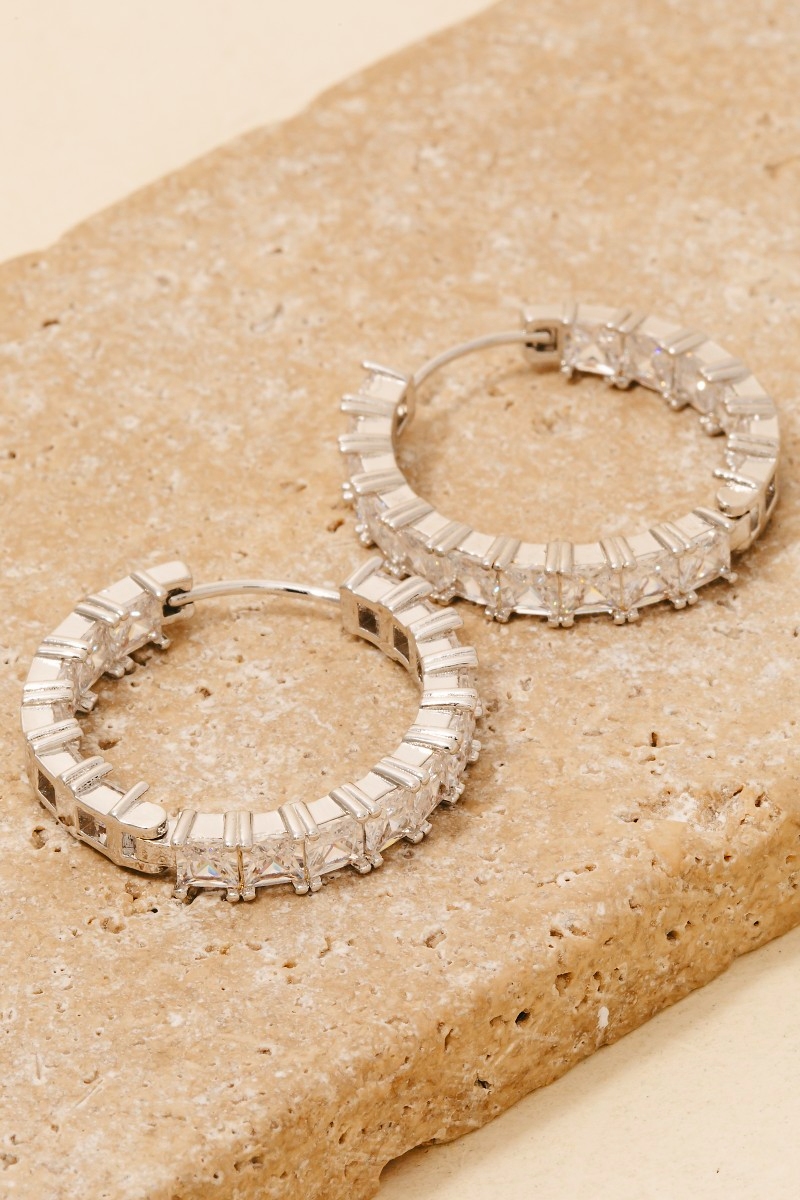 - This pair of hoop earrings introduces a stunning square cubic zirconia studded large style. Immerse yourself in the world of understated glamour as this pair of hoop earrings effortlessly exudes timeless appeal.