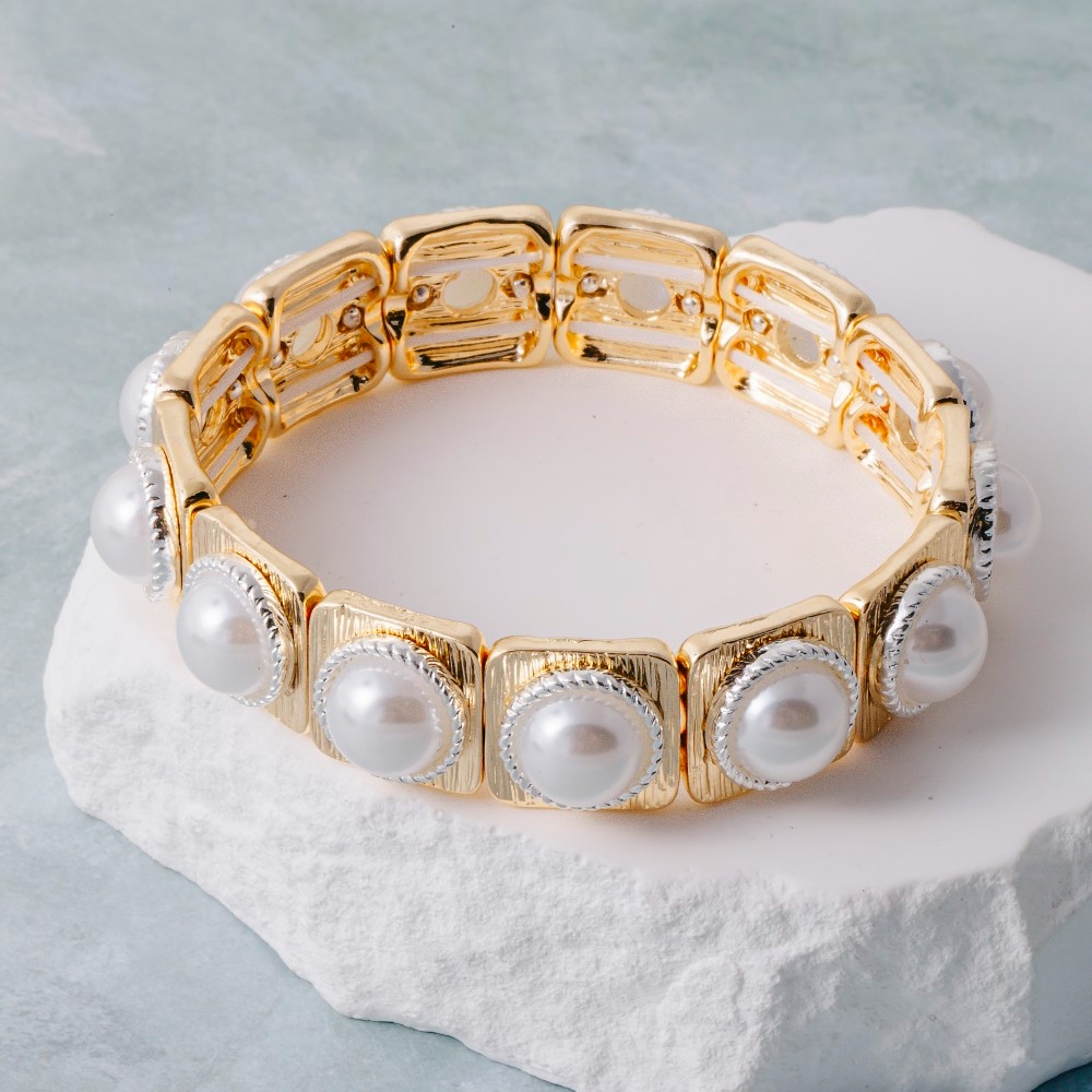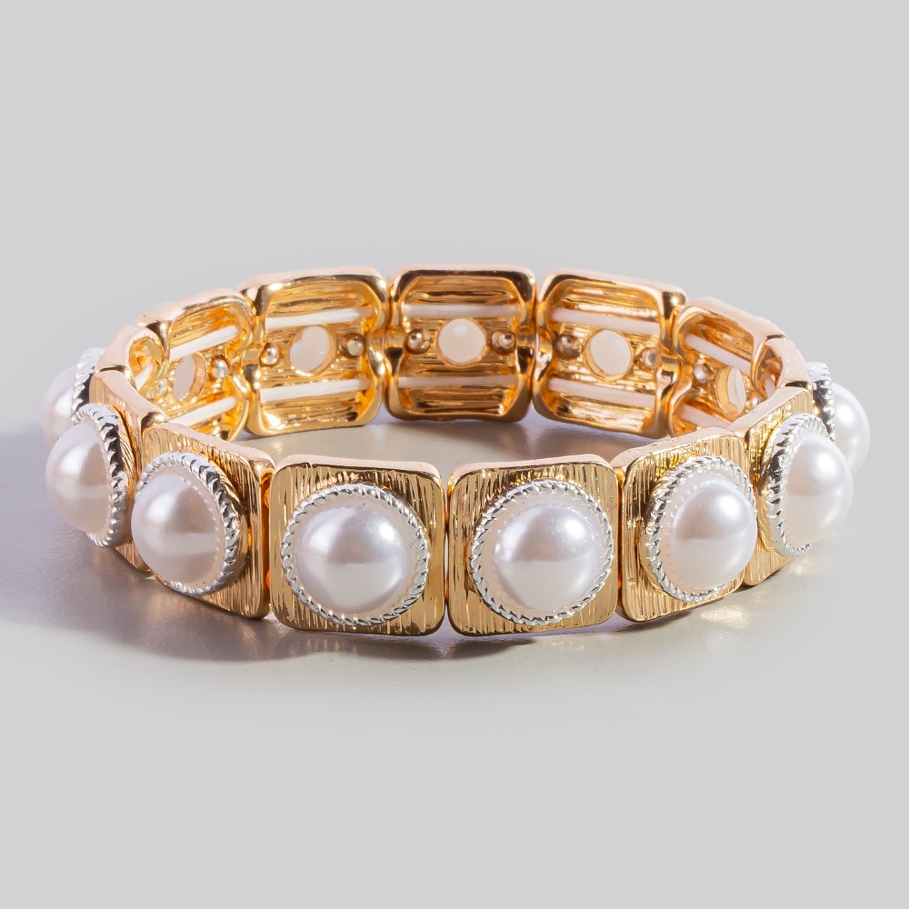 • This is the perfect stretch bracelet for any occasion stretch bracelet presents a striking square tile pearl design. This item is the perfect finishing touch to any outfit, adding a touch of glamour and sophistication. Available in CRMGD. This item is sold in packs of 1.
