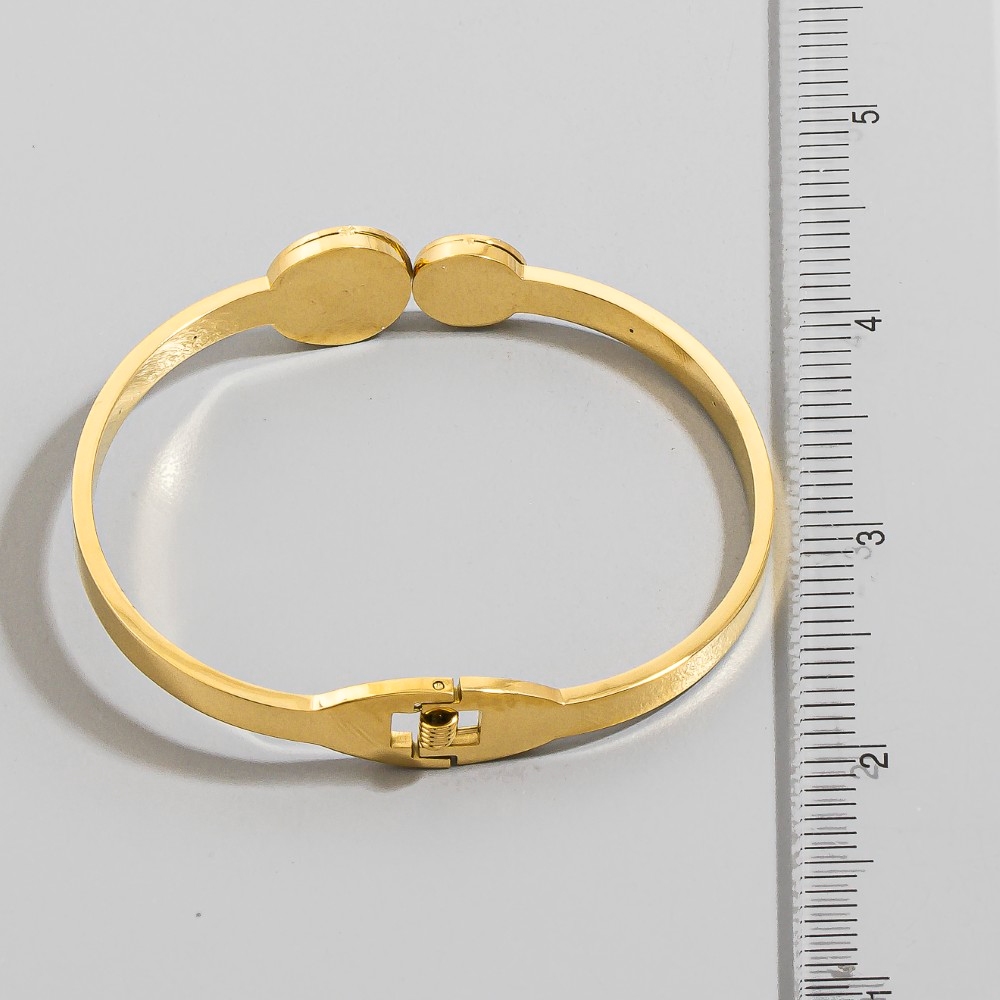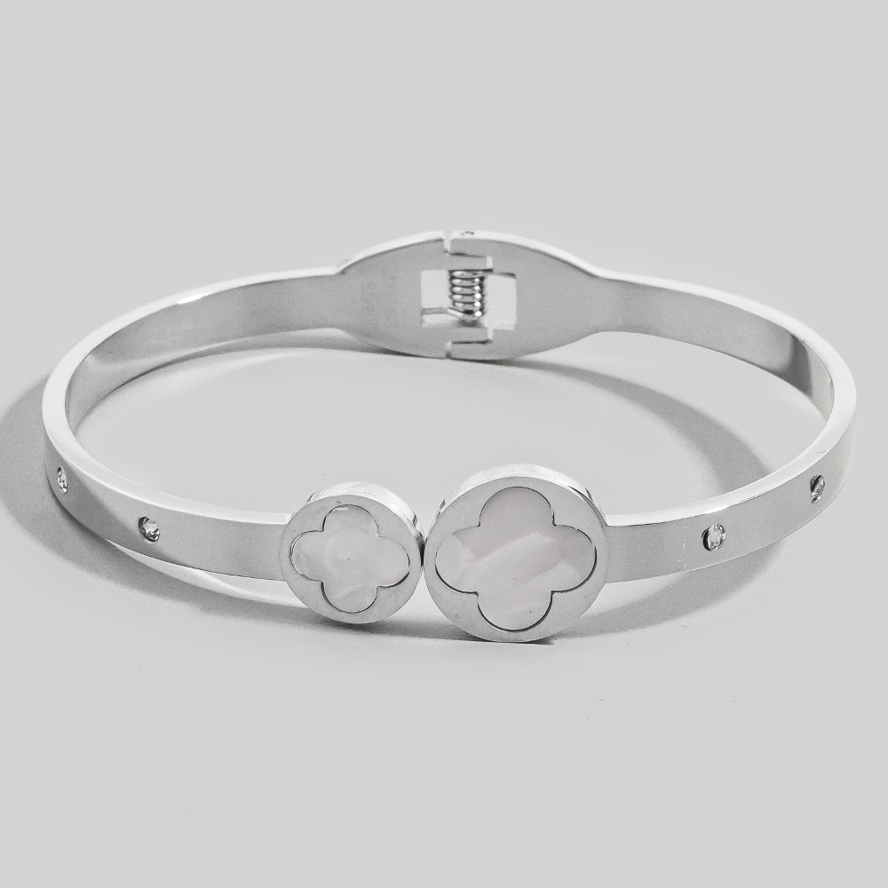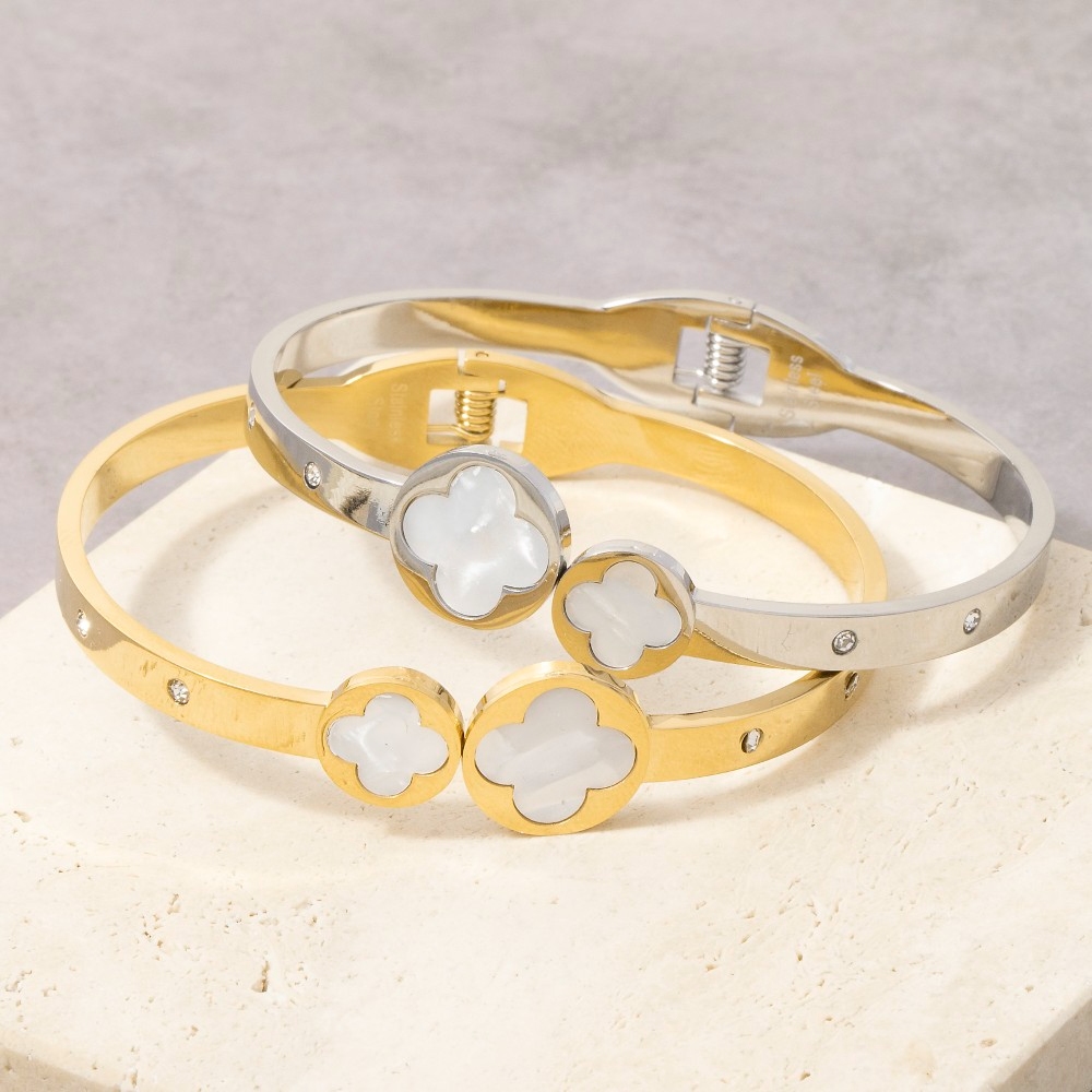 • Bold, daring, and endlessly stylish, this bangle bracelet showcases a breathtaking stainless steel mother of pearl clover ends hinge design. Perfect for dressing up your favorite outfit, this bangle bracelet is a must-have. This item is sold in packs of 1.