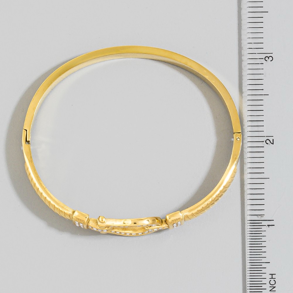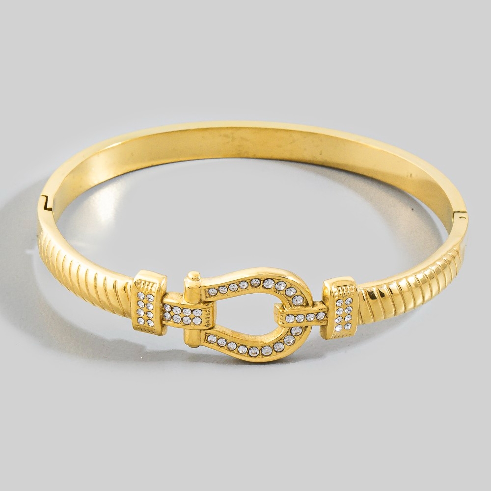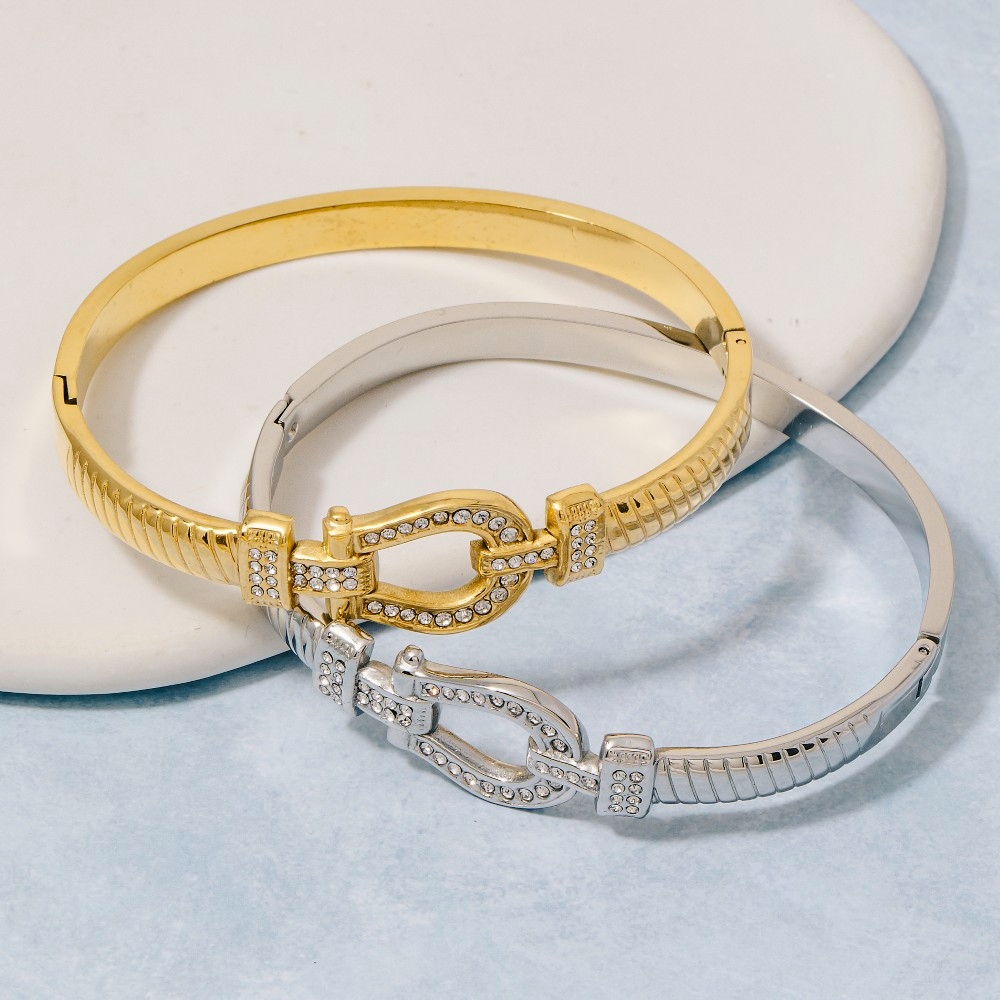 • The epitome of sophistication and style, this bangle bracelet contains a special stainless steel pave horseshoe design. The perfect bangle bracelet for completing any outfit, whether you're dressing up or keeping it casual. Available in G and S. This item is sold in packs of 1.