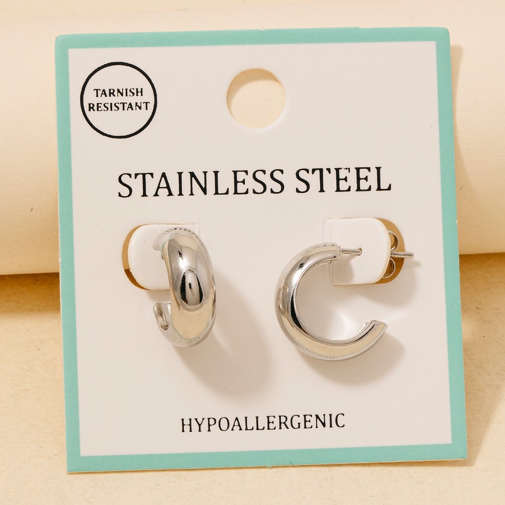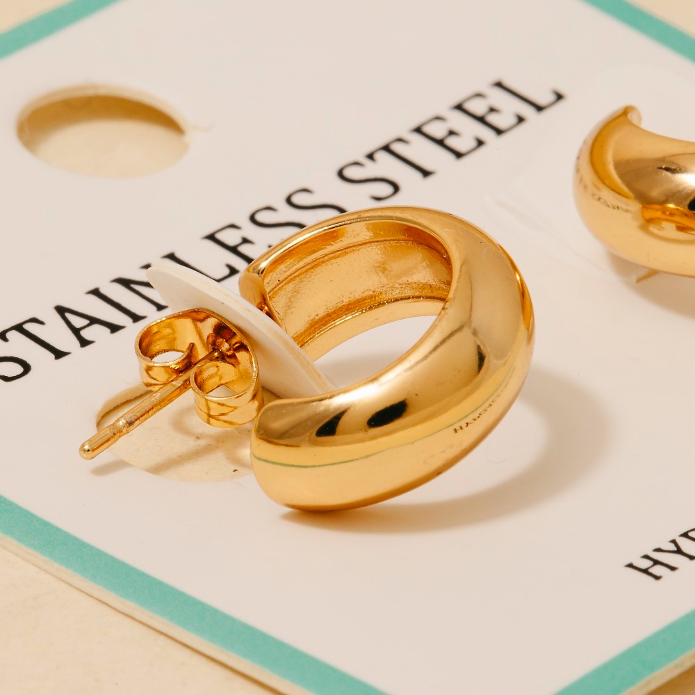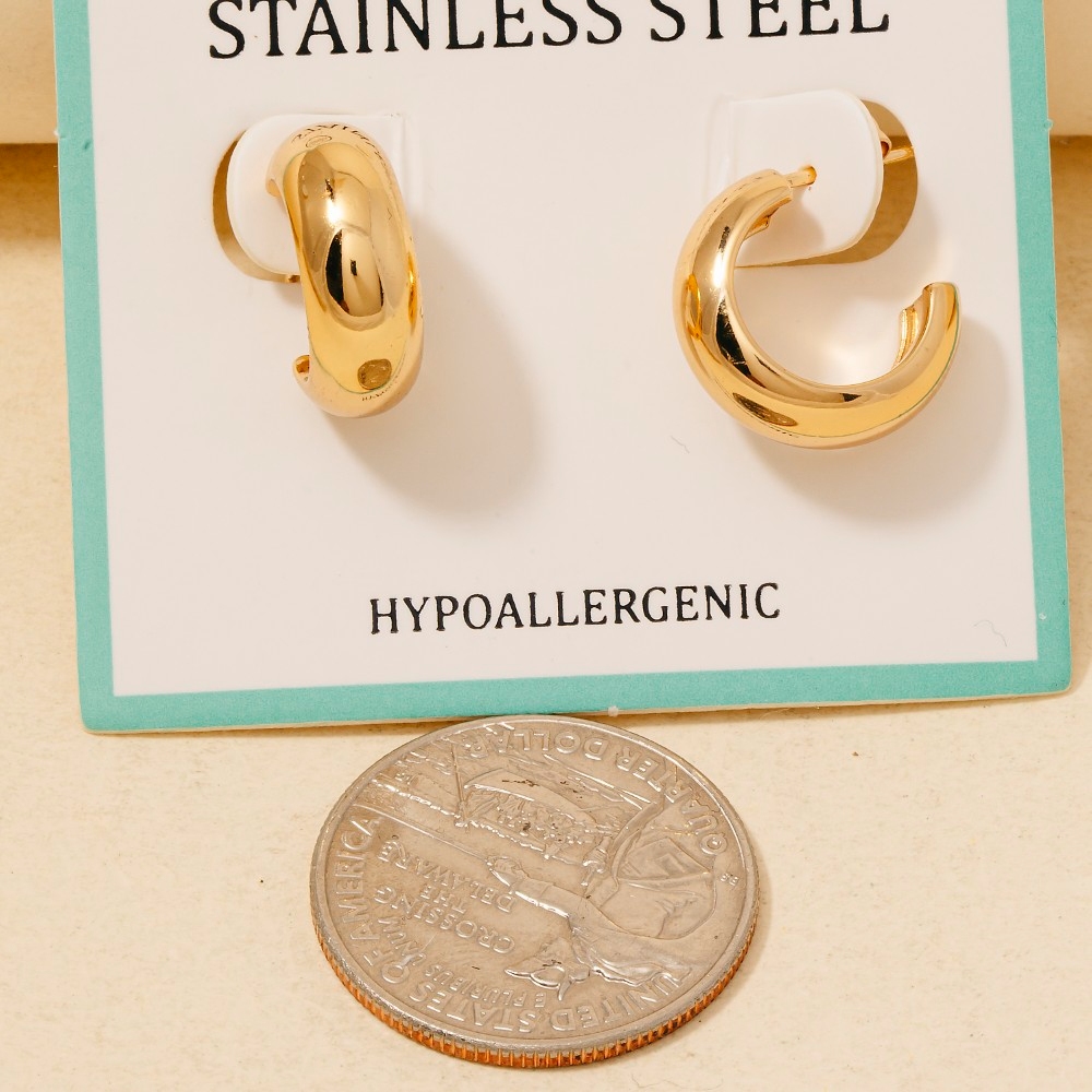This piece is a true showstopper, this pair of hoop earrings possesses a fine stainless steel small rounded design. Infuse elegance into your daily wardrobe with the versatile charm of this must-have pair of hoop earrings. Available in GD, RD. This item is sold in packs of 1.