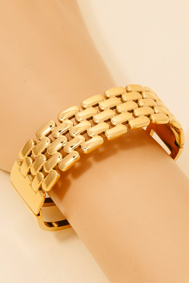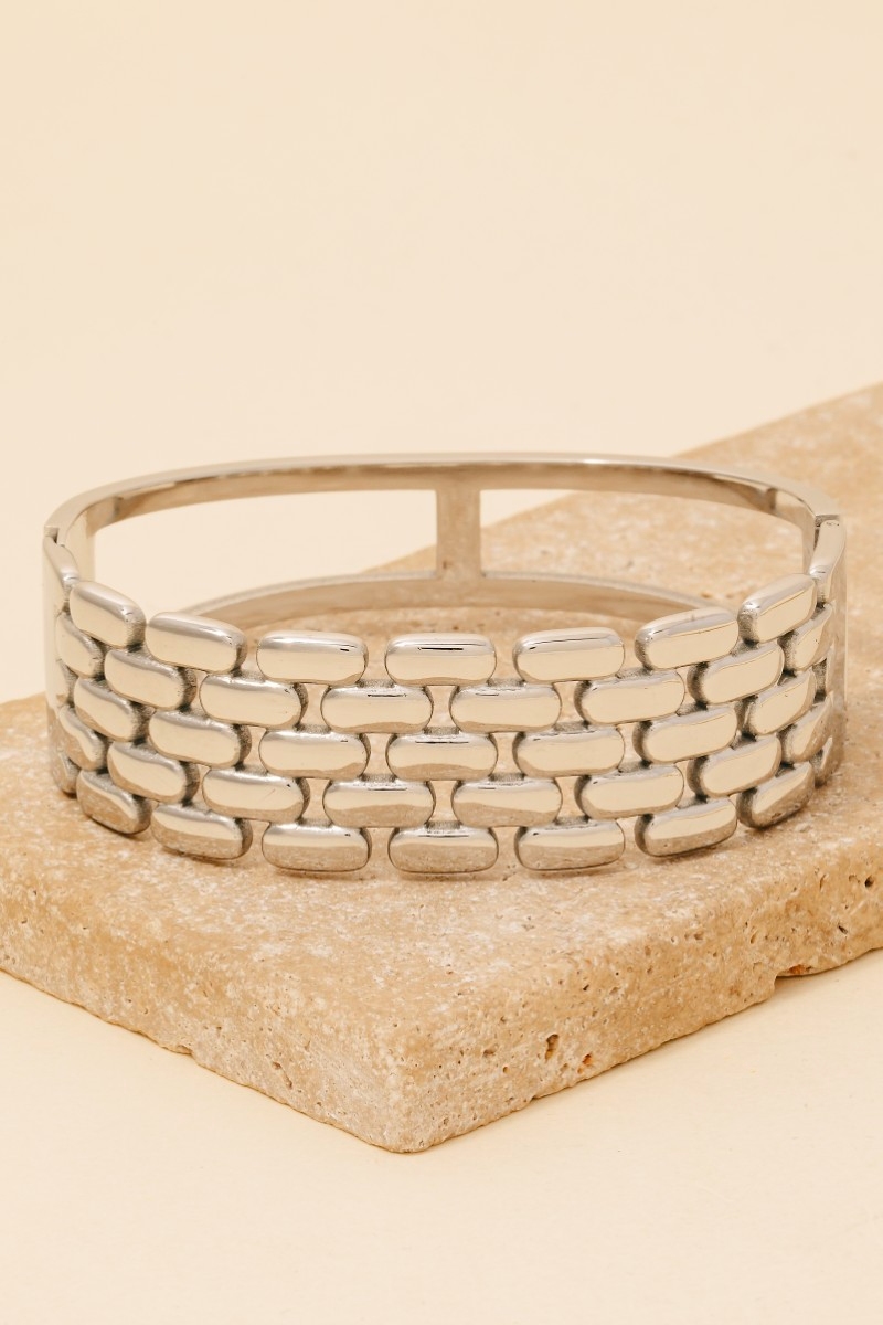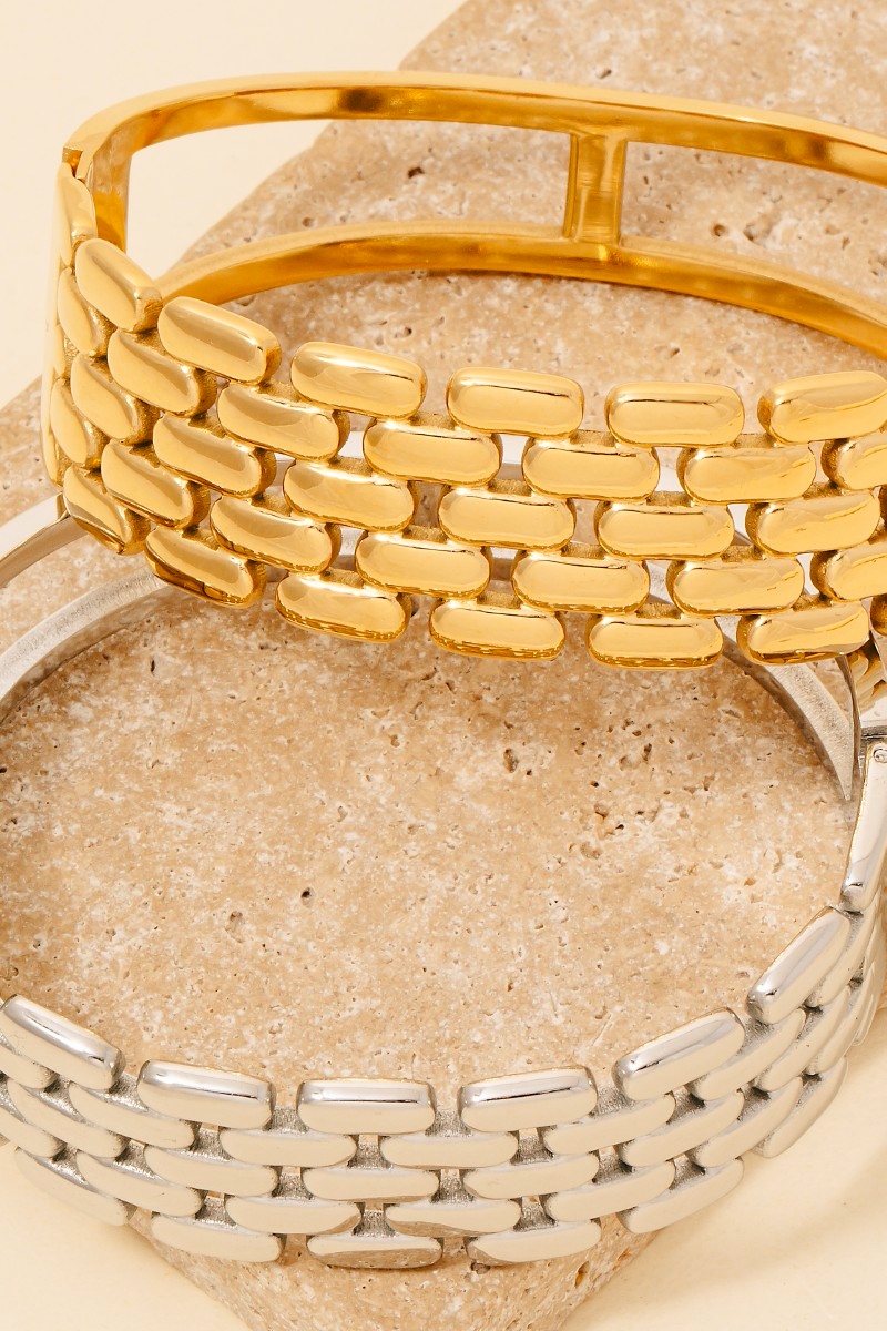 • This bangle bracelet showcases a timeless stainless steel solid watch link hinge style. Delight in the intricate details that make this bangle bracelet an essential element in expressing your fashion identity.