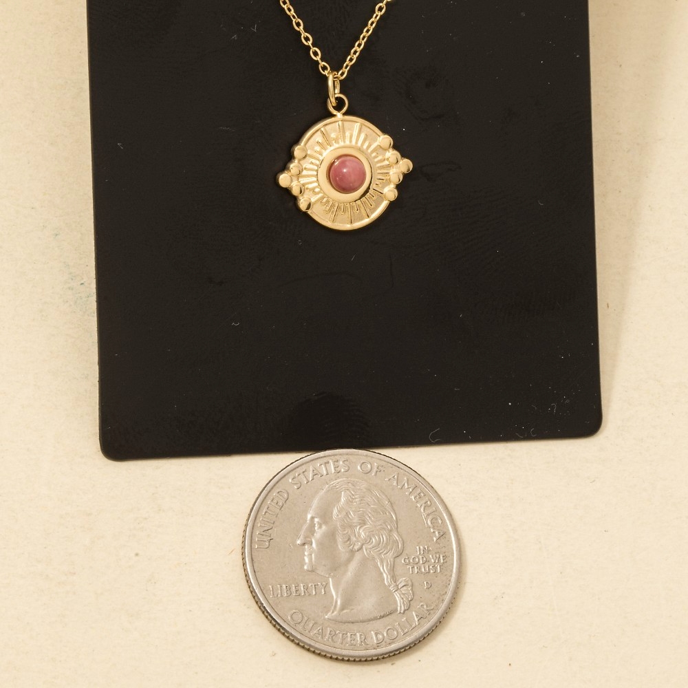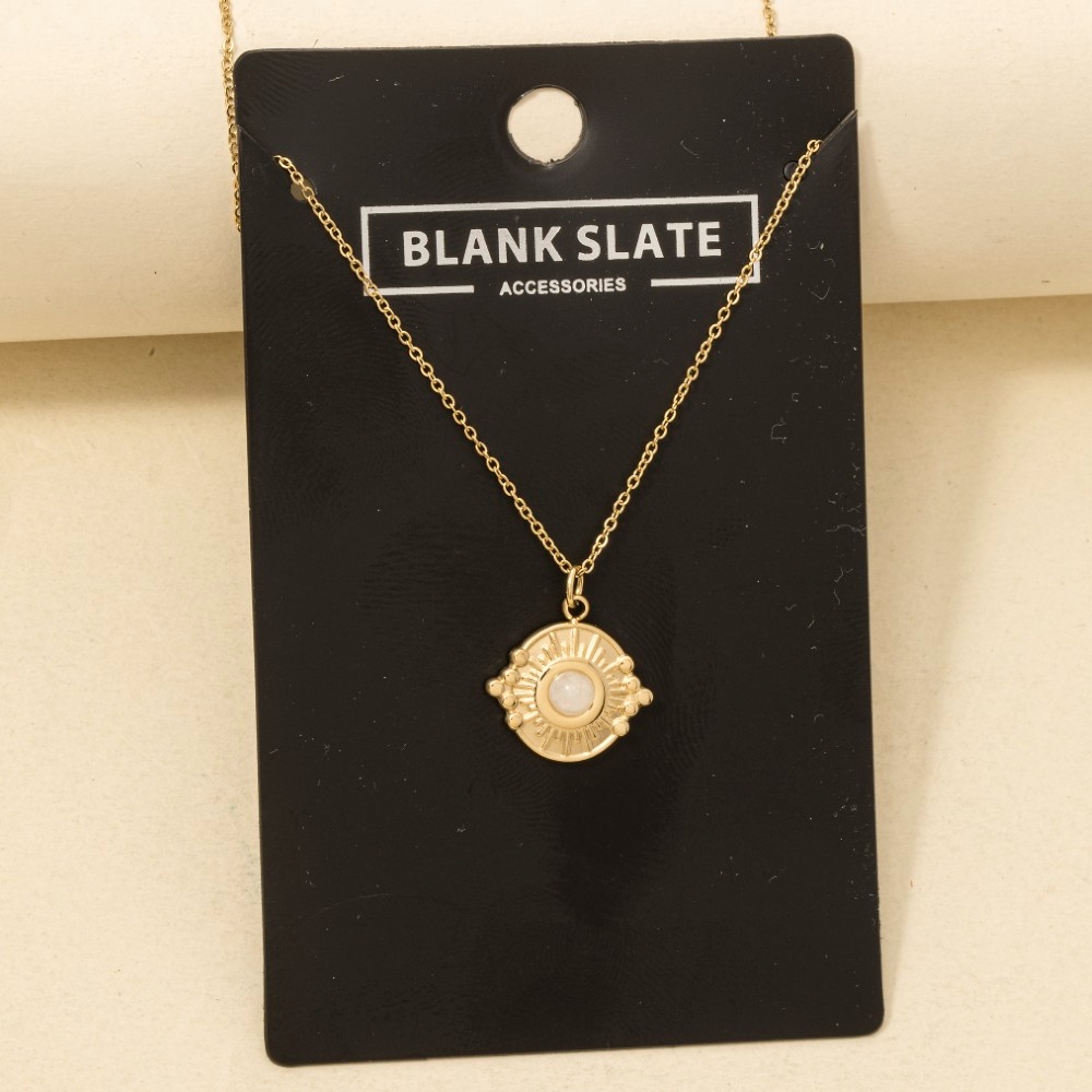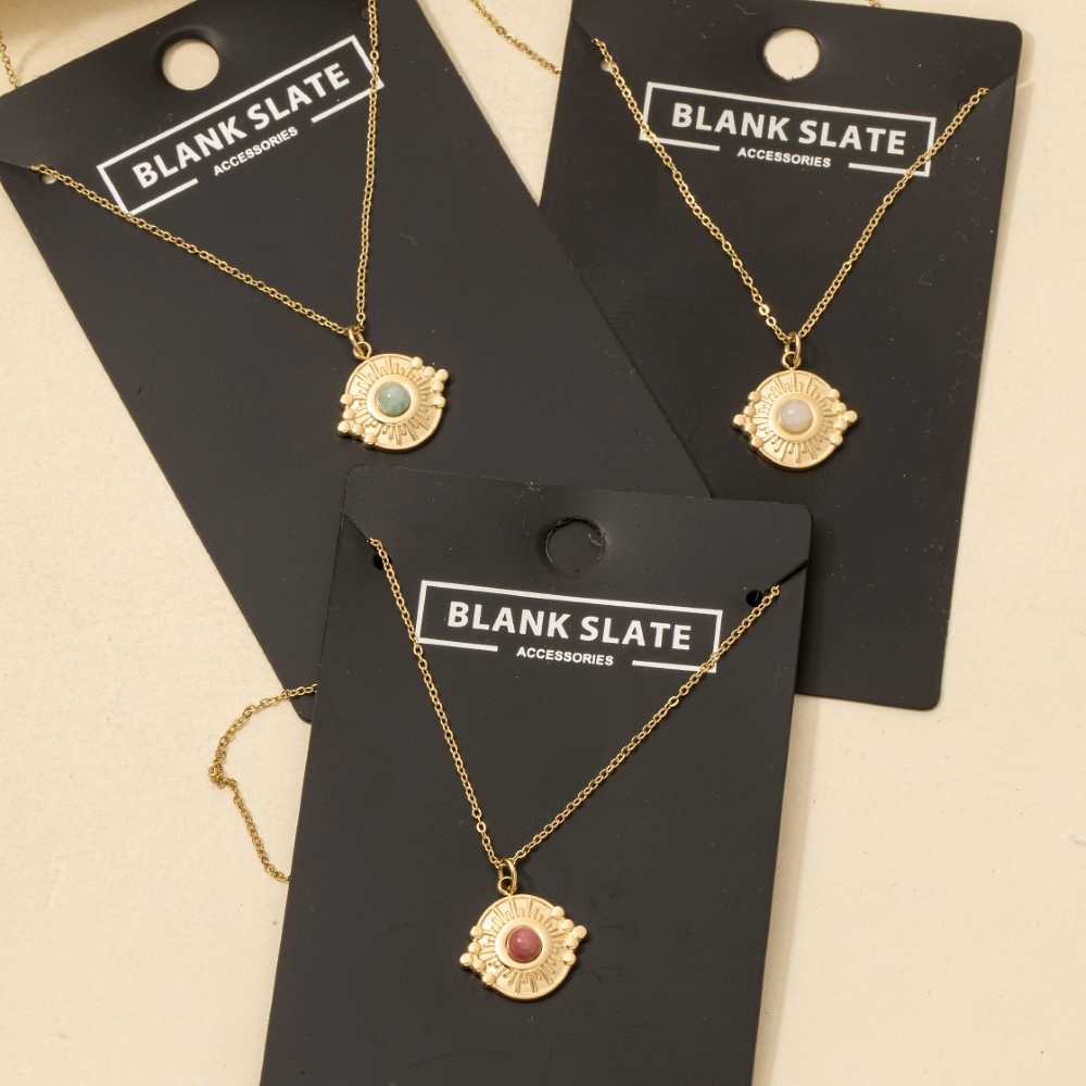 • Make a statement, this necklace brings a one-of-a-kind stainless steel stone stud coin pendant design. The perfect necklace for completing any outfit, whether you're dressing up or keeping it casual. Available in BL, IV, RD. This item is sold in packs of 1.