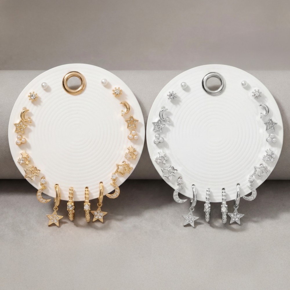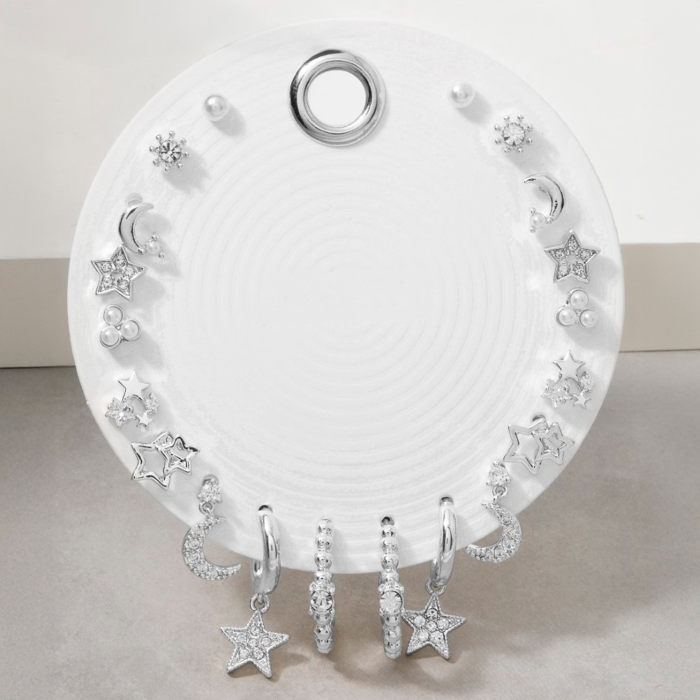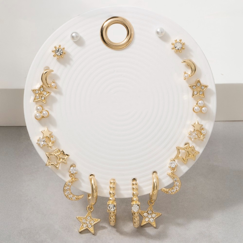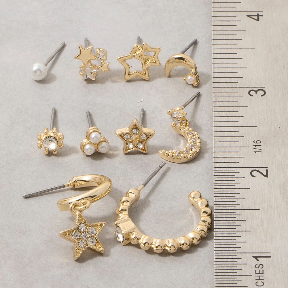 A versatile and stylish addition to any wardrobe, this pair of earrings contains a special star moon crystal 9 pair earring set design. Unleash the potential of your wardrobe with this versatile pair of earrings, ensuring a touch of elegance in every ensemble. Available in GCL, SCL. This item is sold in packs of 1.