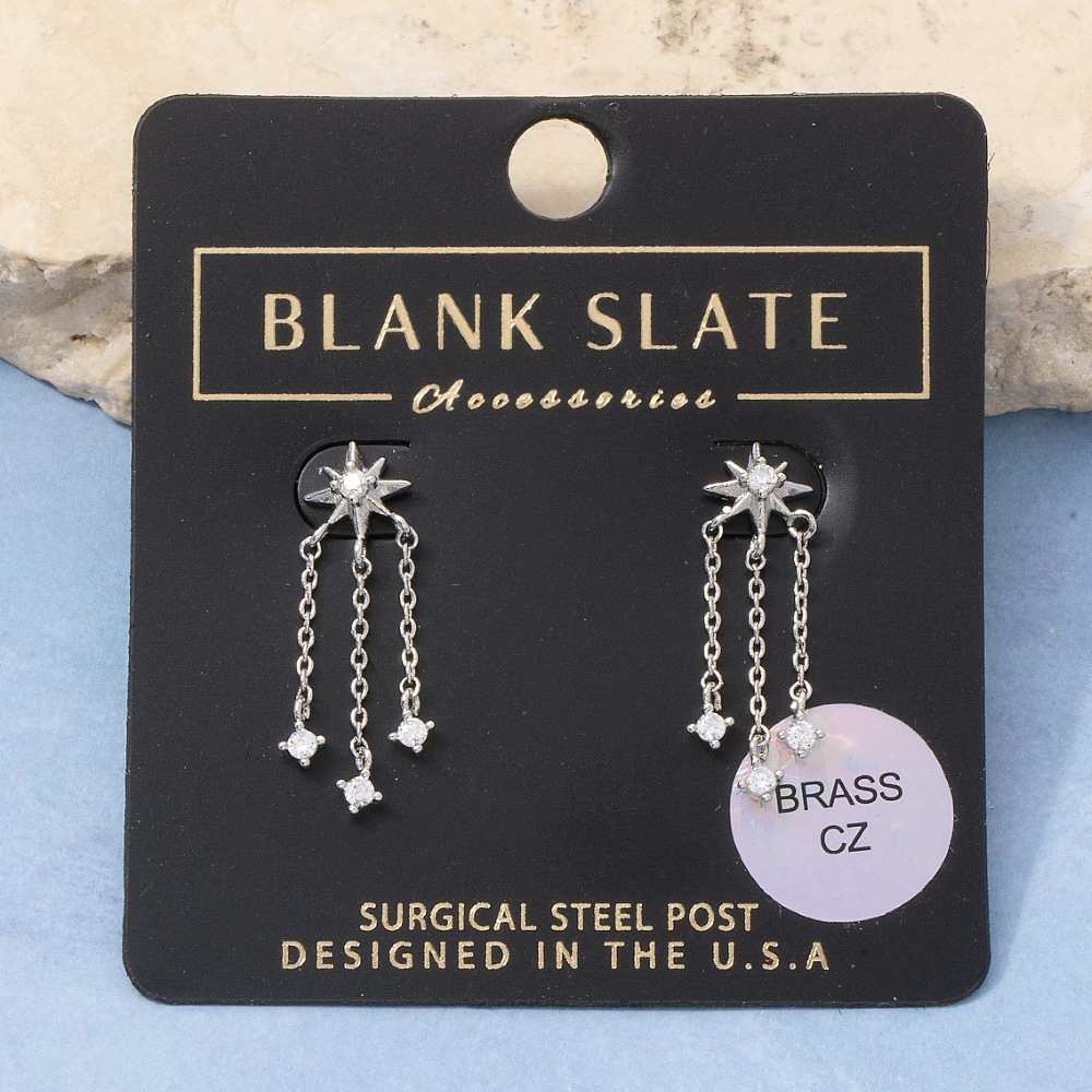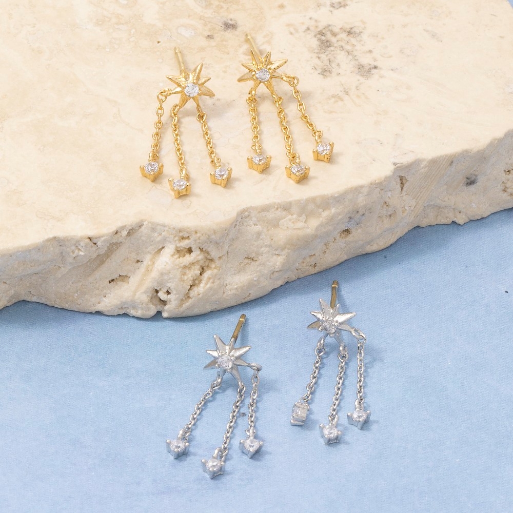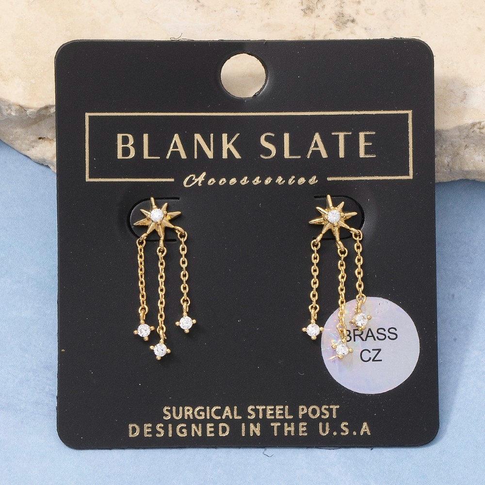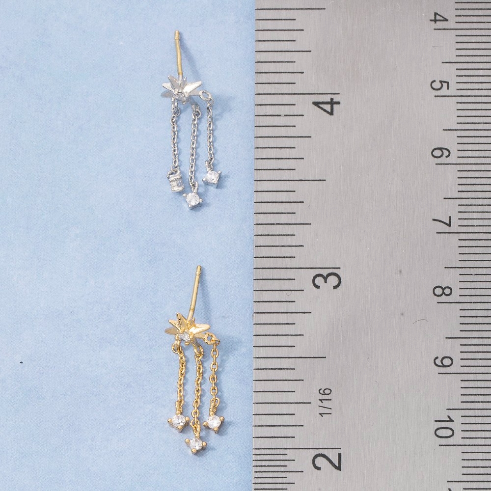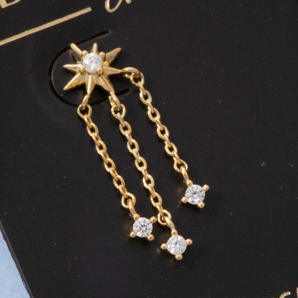 Elevate your style with something unique and daring, this pair of drop earrings carries a charming starburst cubic zirconia stud triple chain design. Infuse elegance into your daily wardrobe with the versatile charm of this must-have pair of drop earrings. Available in G, S. This item is sold in packs of 1.