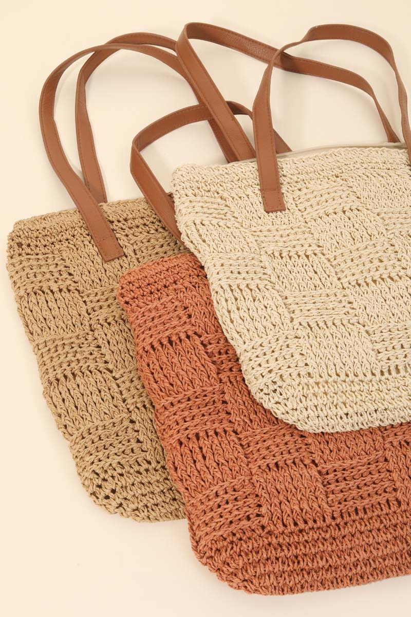 Effortlessly chic and always on-trend, this tote bag includes a stunning straw braided basket weave design. Achieve a perfect balance of style and sophistication with this versatile tote bag, the ultimate choice for the fashion-savvy individual. Available in OR, IV and KA. This item is sold in packs of 1.