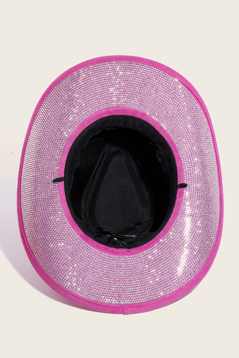 Elevate any look, this cowboy hat features a distinct studded rhinestone brim design. This cowboy hat is ideal for both casual and formal events, adding a touch of sophistication to any outfit. Available in AB, BK, FU, IV. This item is sold in packs of 1.