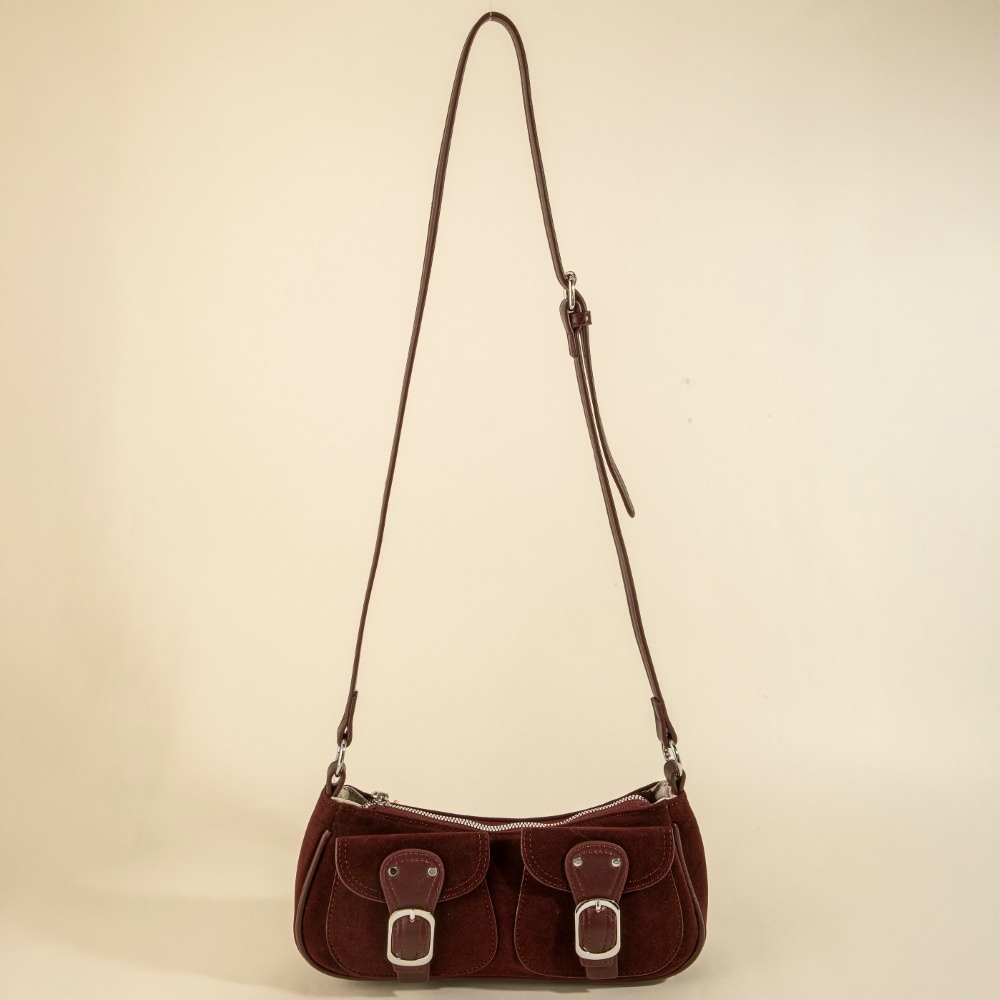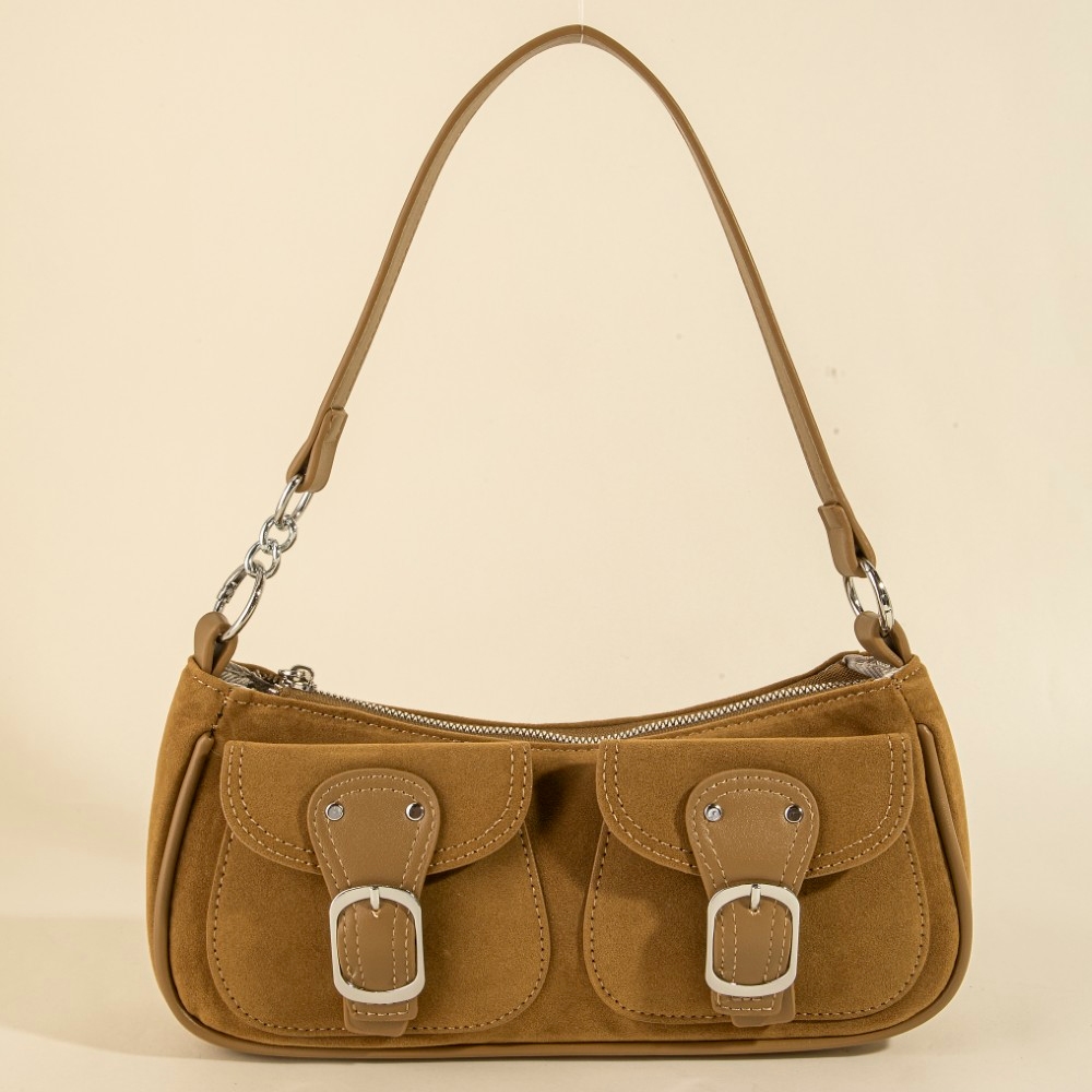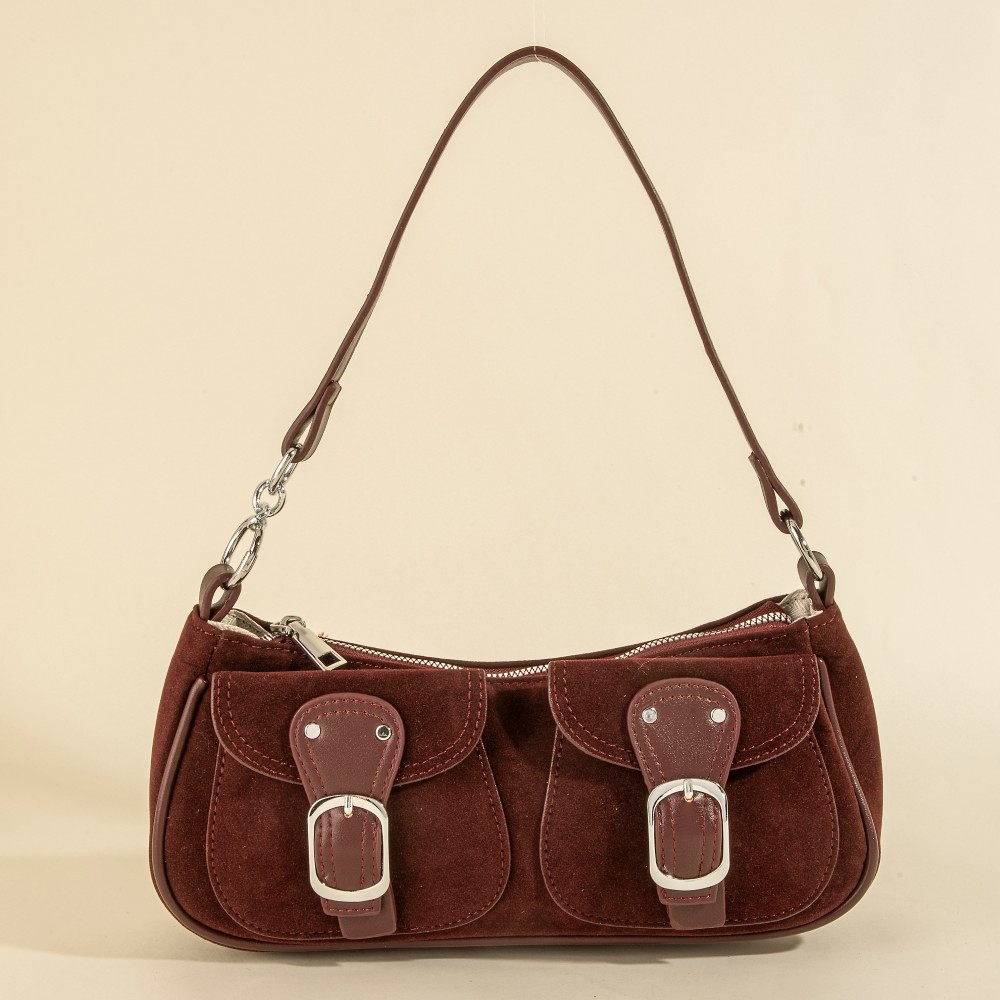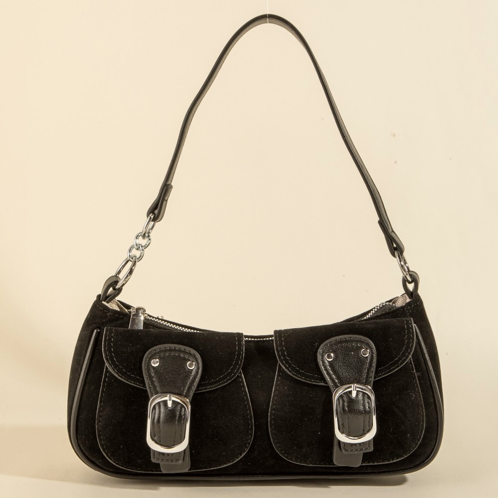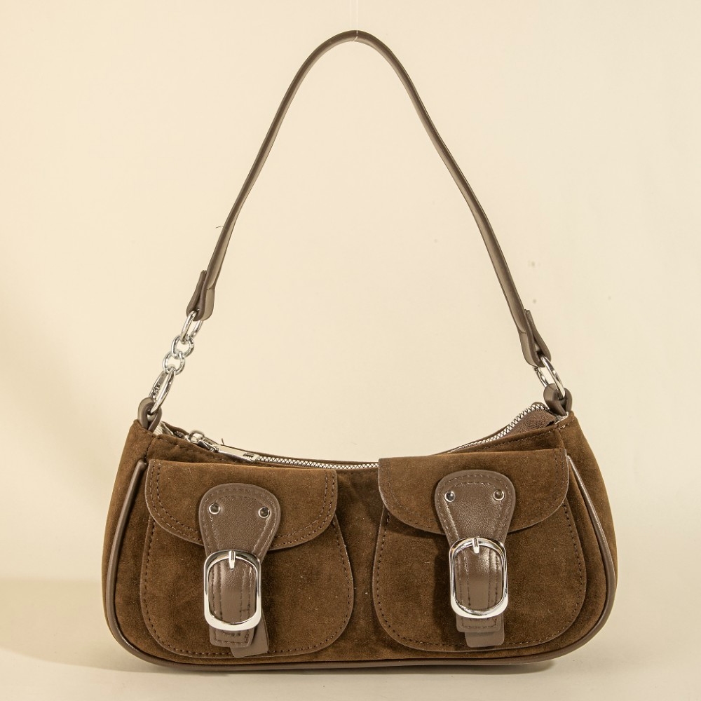Perfectly polished and endlessly versatile, this hand bag offers a remarkable suede double belted front pockets design. This hand bag is a great way to add some glamour and sophistication to your outfit. Available in BK, BU, DBR, LBR. This item is sold in packs of 12.