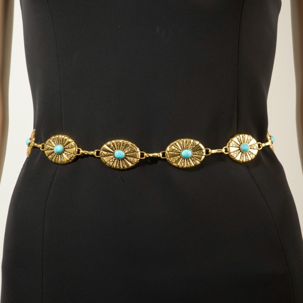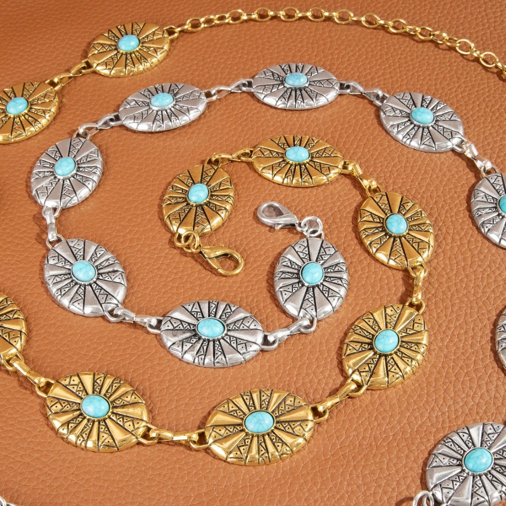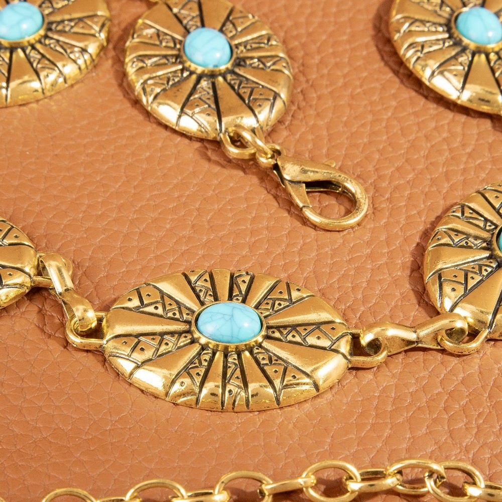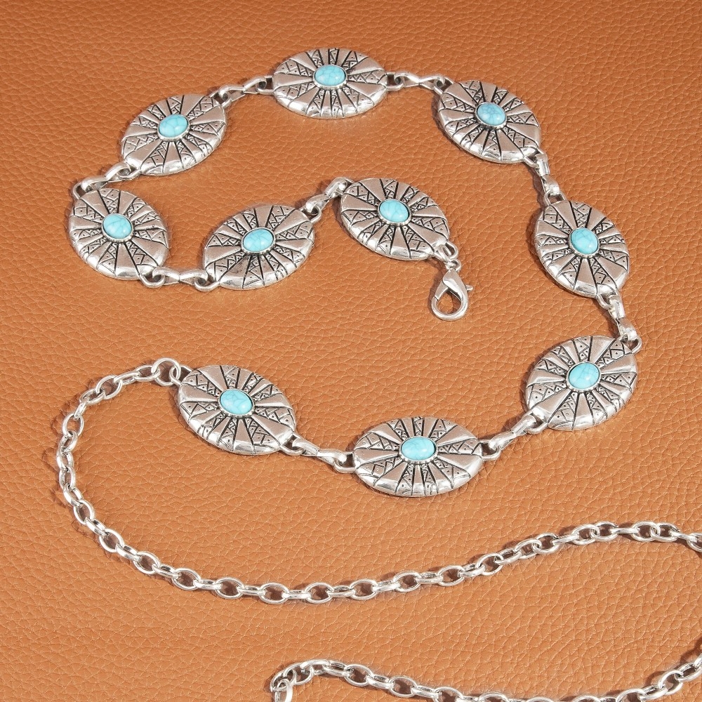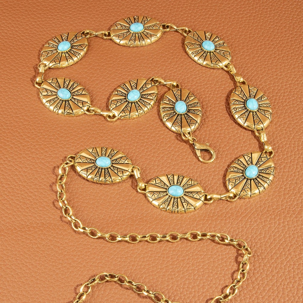 • A stunning piece that is sure to turn heads, this chain belt showcases an alluring sunburst concho turquoise stone design. Add a dash of sophistication to your look with this versatile chain belt, a must-have for fashion enthusiasts. Available in G, S. This item is sold in packs of 1.