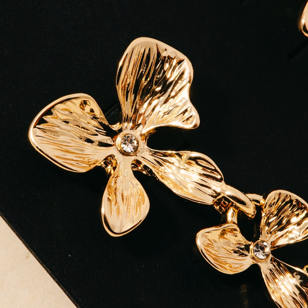 - Make a statement, this pair of dangle earrings carries a charming textured double flower design. Perfect for dressing up your favorite outfit, this pair of dangle earrings is a must-have. Available in S and G. This item is sold in packs of 1.