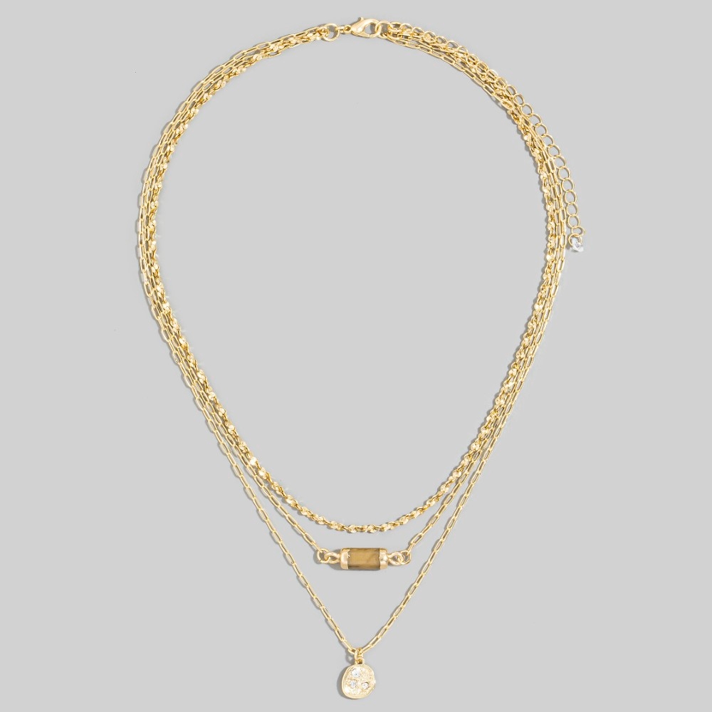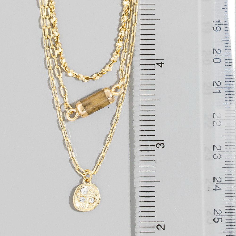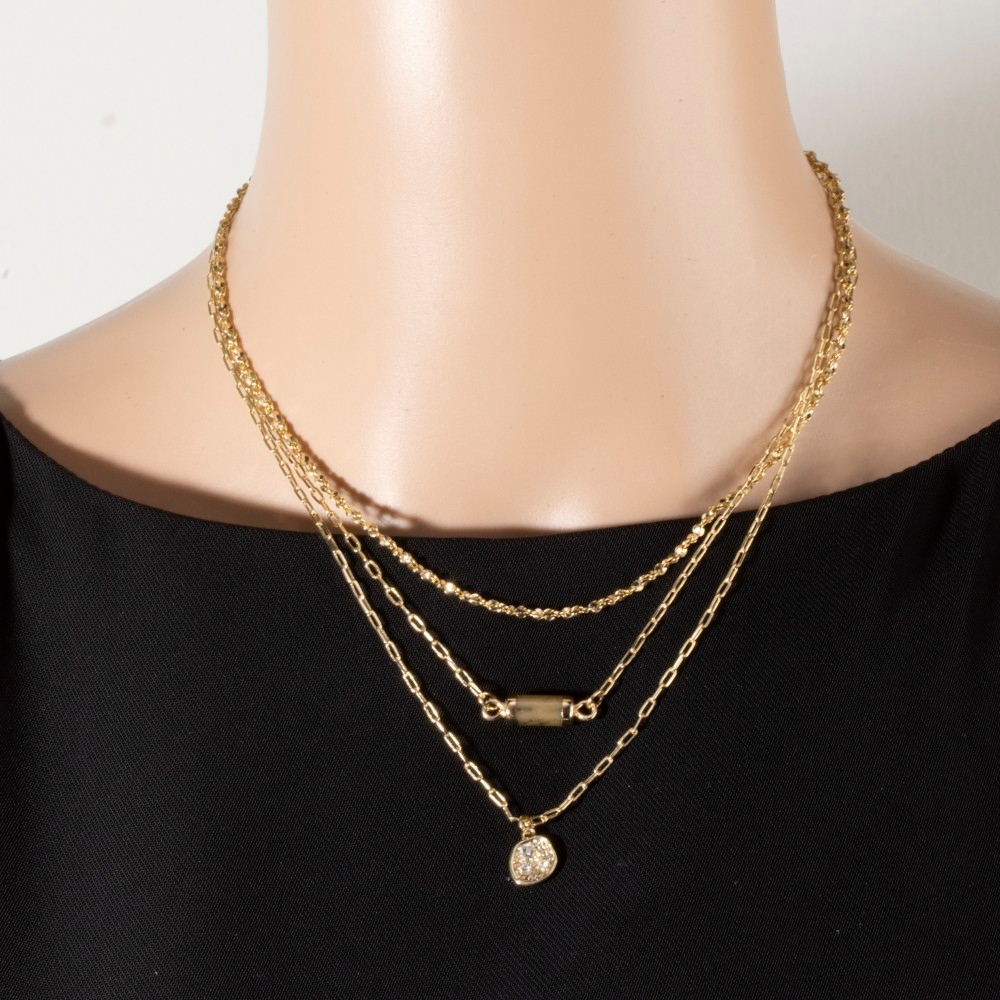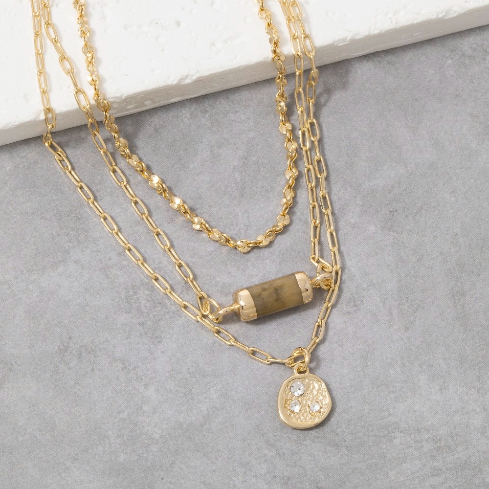 Uniquely designed and endlessly stylish, this pendant necklace presents a striking triple layer gold stone design. Unleash the potential of your wardrobe with this versatile pendant necklace, ensuring a touch of elegance in every ensemble. Available in G. This item is sold in packs of 1.
