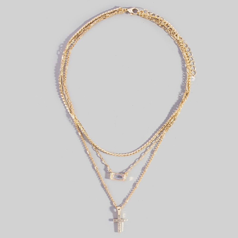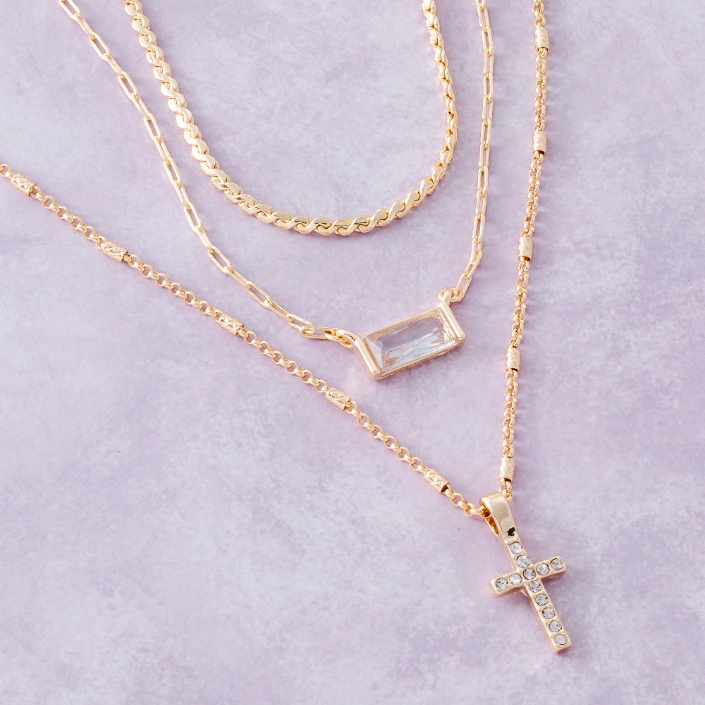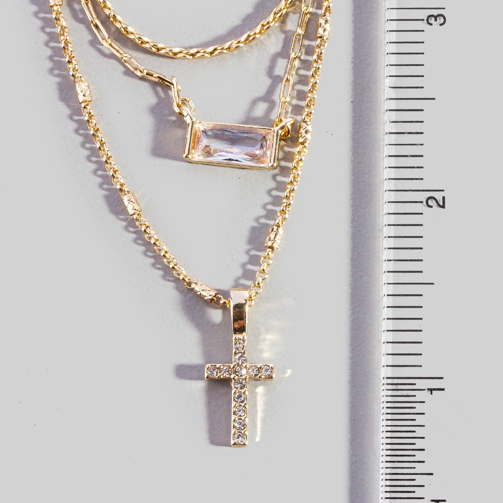 Stay ahead of the fashion curve, this pendant necklace displays a unique triple layered chain pave cross design. Redefine your wardrobe with this versatile pendant necklace, a timeless addition that brings an air of sophistication to any look. Available in G. This item is sold in packs of 1.