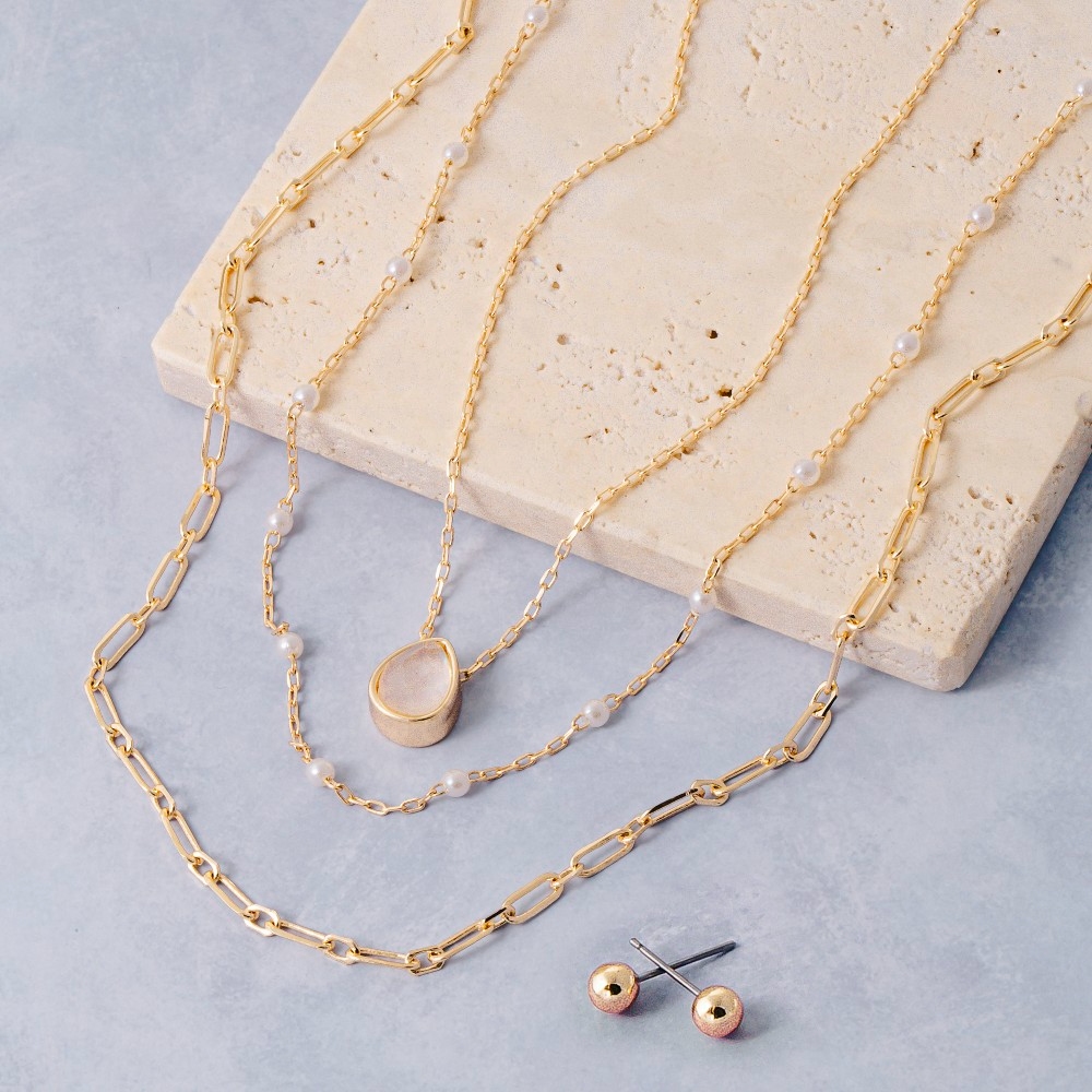 • Make a statement, this chain necklace features a distinct triple layered pearl and paperclip set design. The perfect way to elevate any outfit, this chain necklace adds a touch of elegance and style. Available in CLRGD. This item is sold in packs of 1.