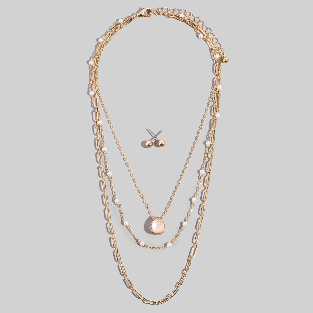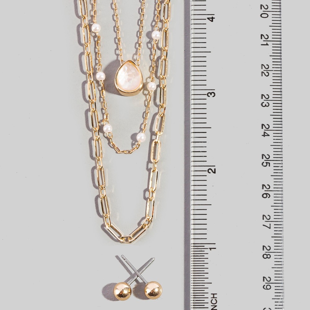 Layered Pearl Bead Chain Flower Pendant Necklace Set