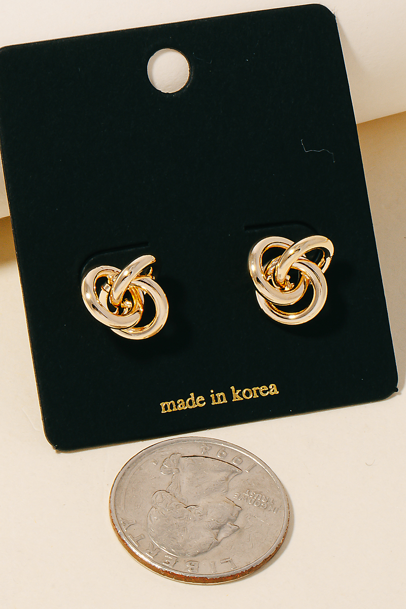 This pair of stud earrings showcases a unique triple metallic knot style. Celebrate individuality with this pair of stud earrings that effortlessly expresses your unique sense of style.