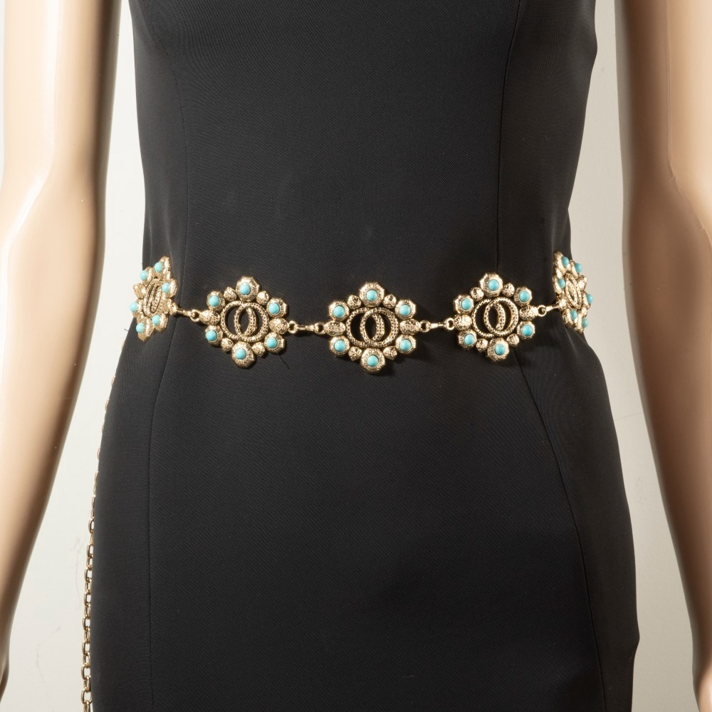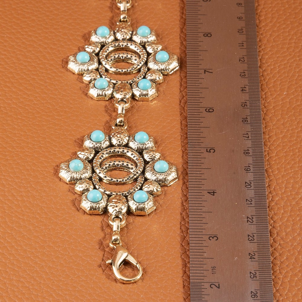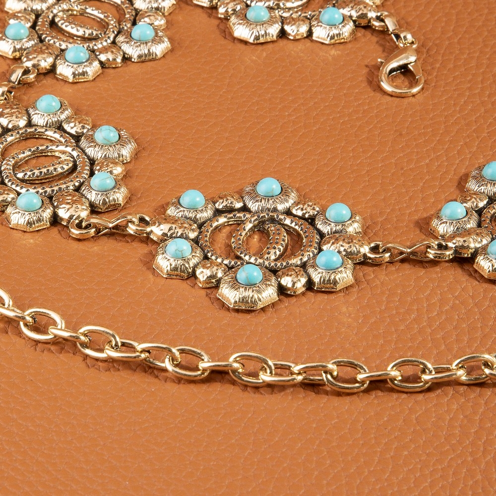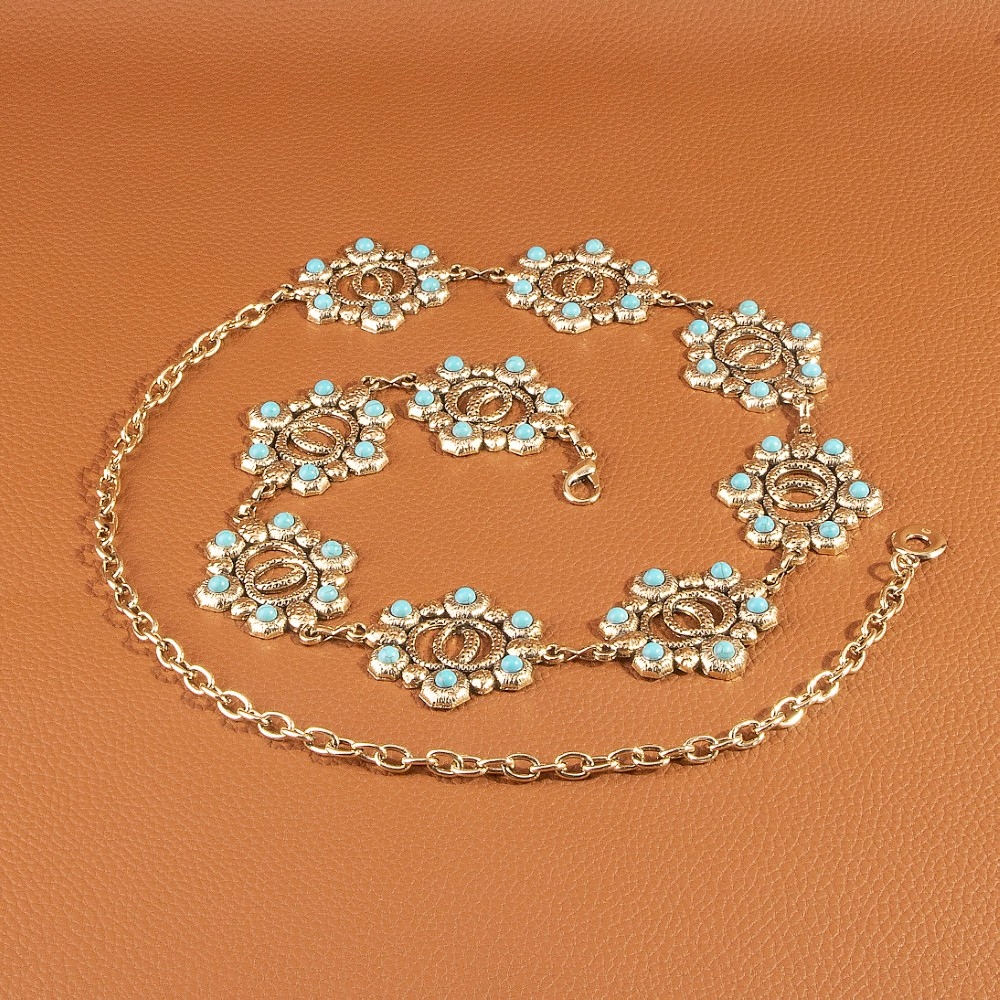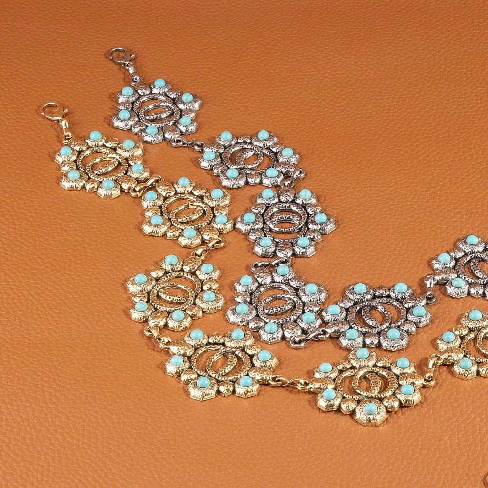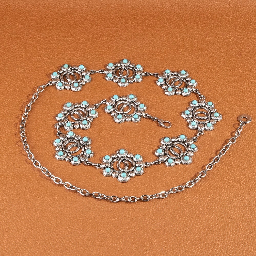 Add some edge to your wardrobe, this chain belt incorporates a flawless turquoise floral concho design. This chain belt is ideal for both casual and formal events, adding a touch of sophistication to any outfit. Available in G, S. This item is sold in packs of 1.