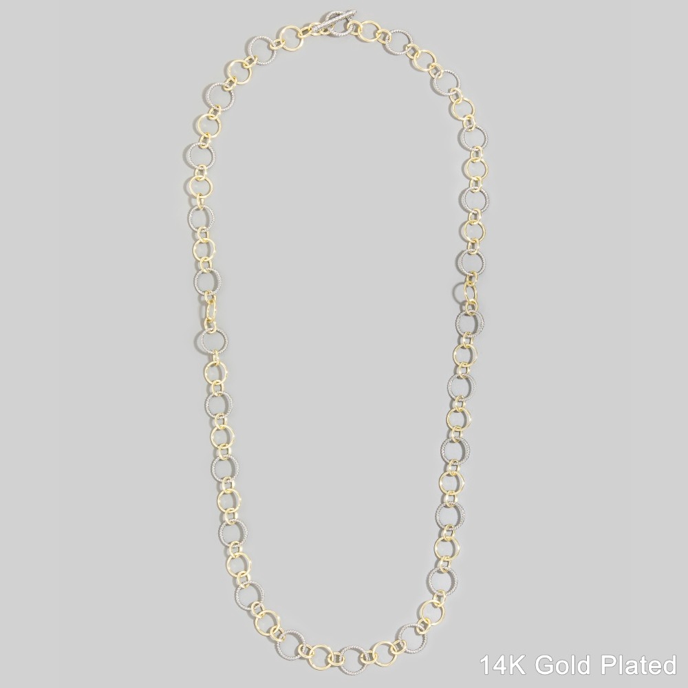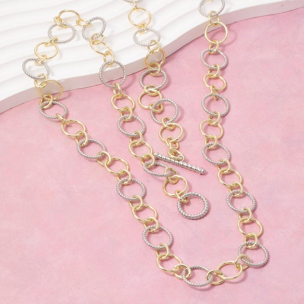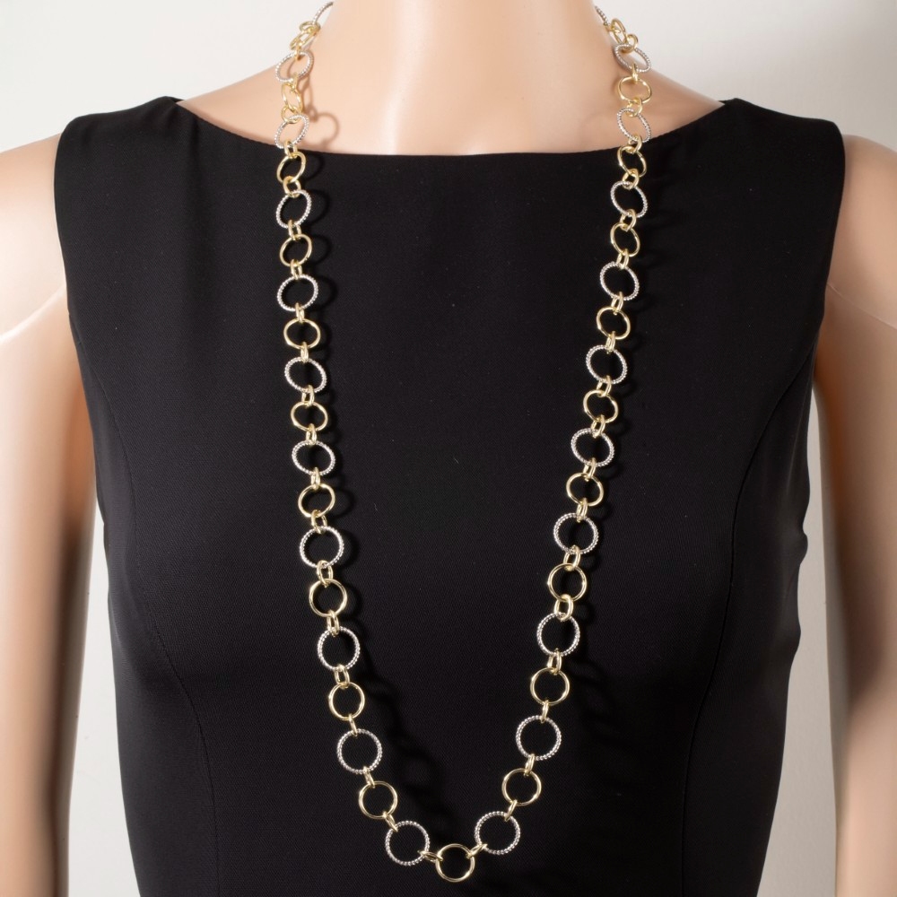 This piece is the perfect way to add some glamour to your look, this long necklace presents a striking two-tone alternating round link design. This long necklace is a great way to add some flair to your outfit without going over the top. Available in T. This item is sold in packs of 1.