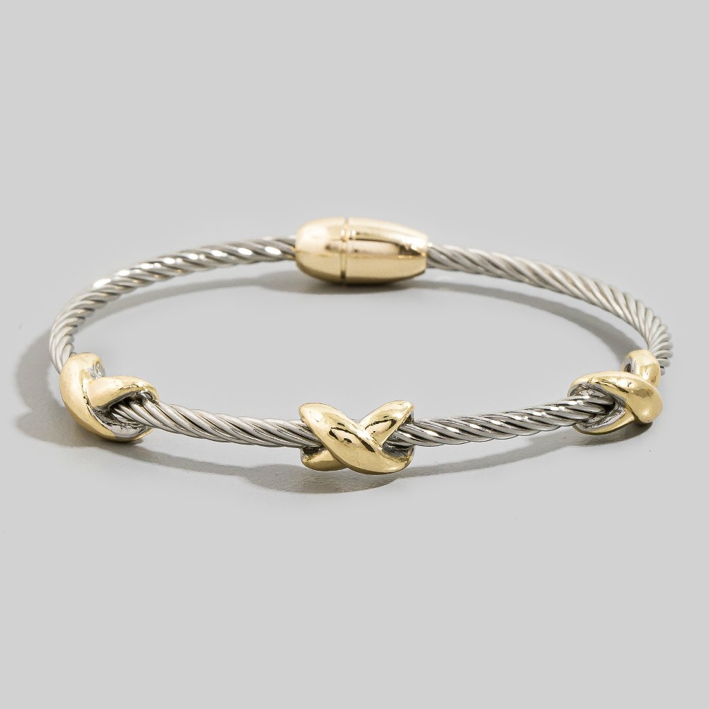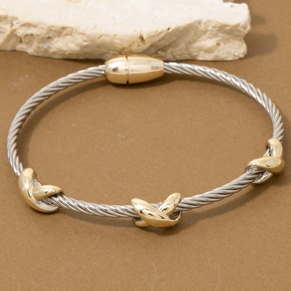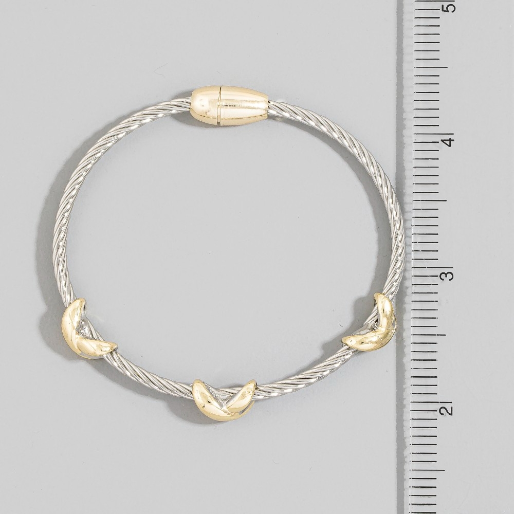 This piece is perfect for those who want to showcase their unique style, this bangle bracelet exudes a refined two-tone cable wire gold x-station design. Embrace fashion flexibility with this versatile bangle bracelet, designed to effortlessly enhance the sophistication of any outfit. This item is sold in packs of 1.