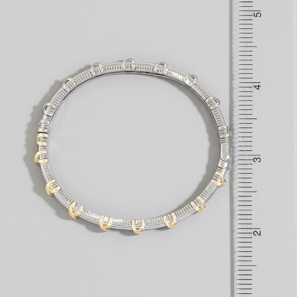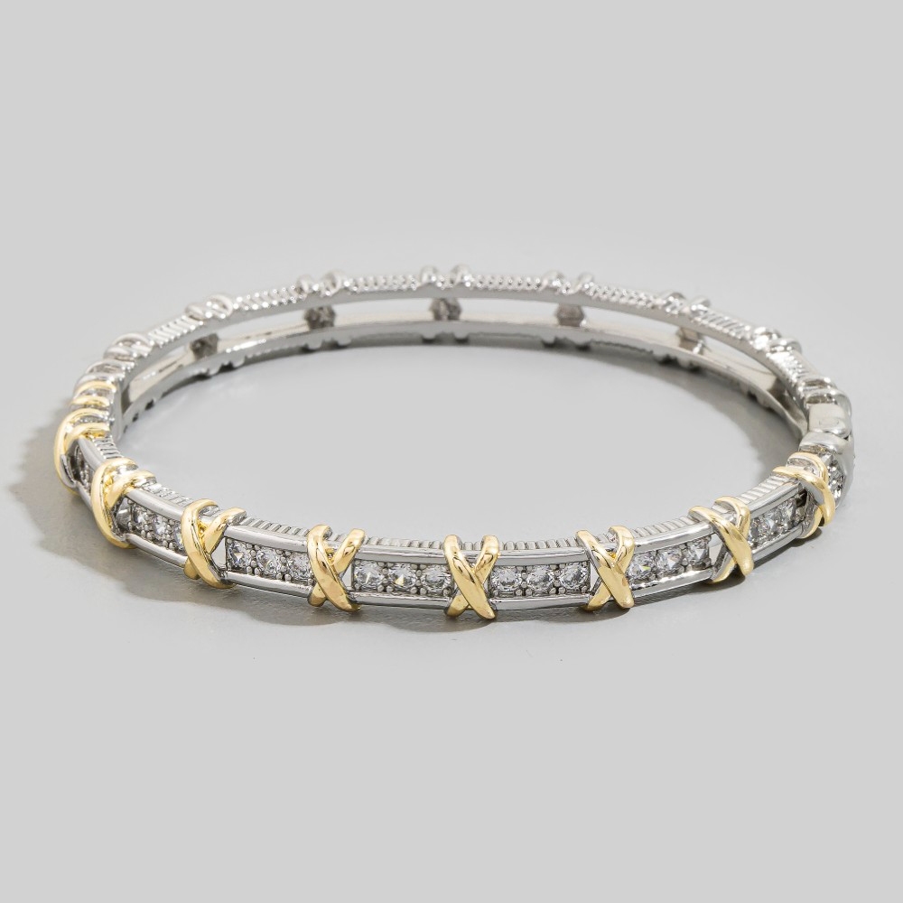 A must-have addition to any bangle bracelet collection, this bangle bracelet showcases an alluring two-tone cubic zirconia x-bar design. Add some personality to your outfit with this stylish bangle bracelet. This item is sold in packs of 1.