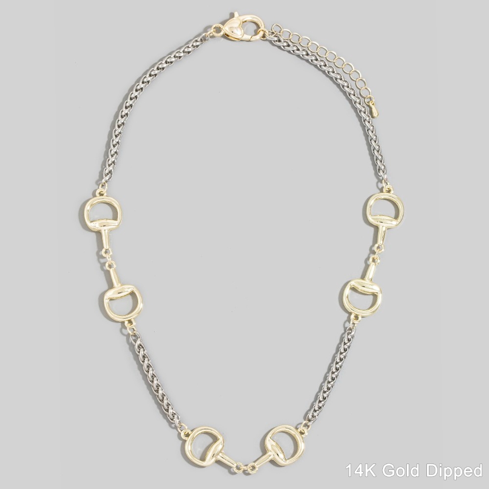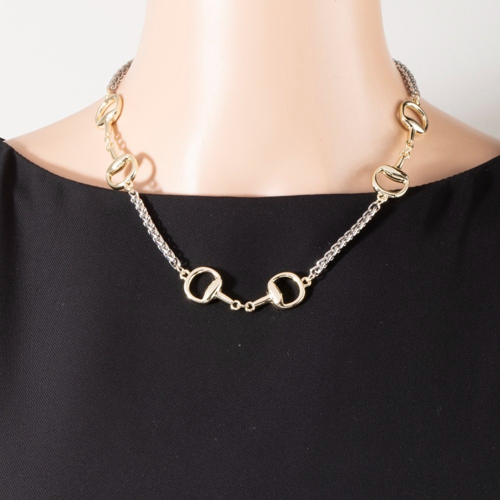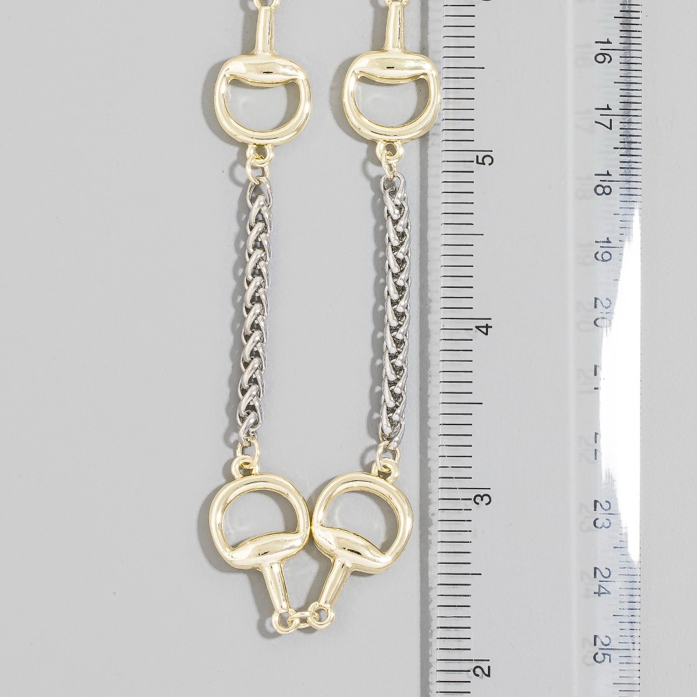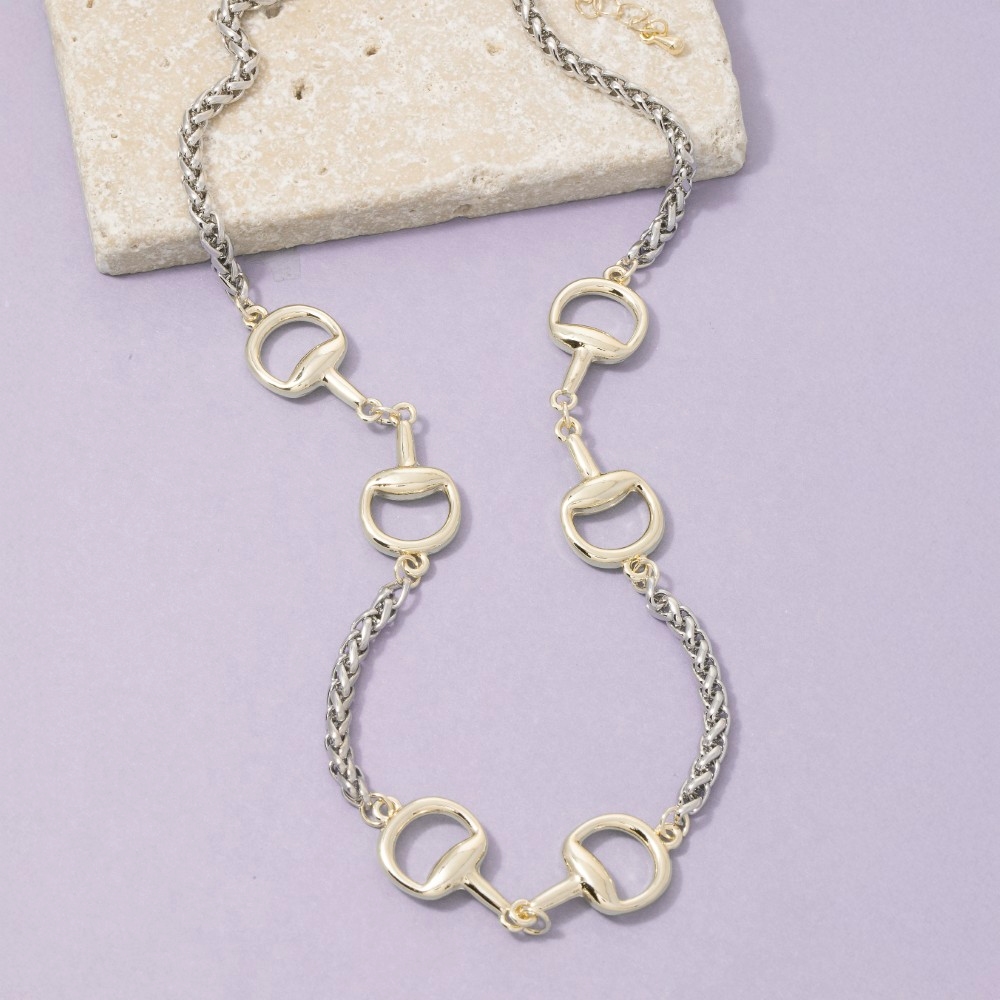 This piece is designed to make a statement, this chain necklace incorporates a remarkable two-tone horsebit station wheat design. Add a touch of glamour to your wardrobe with this versatile chain necklace, perfect for enhancing the elegance of any look. This item is sold in packs of 1.