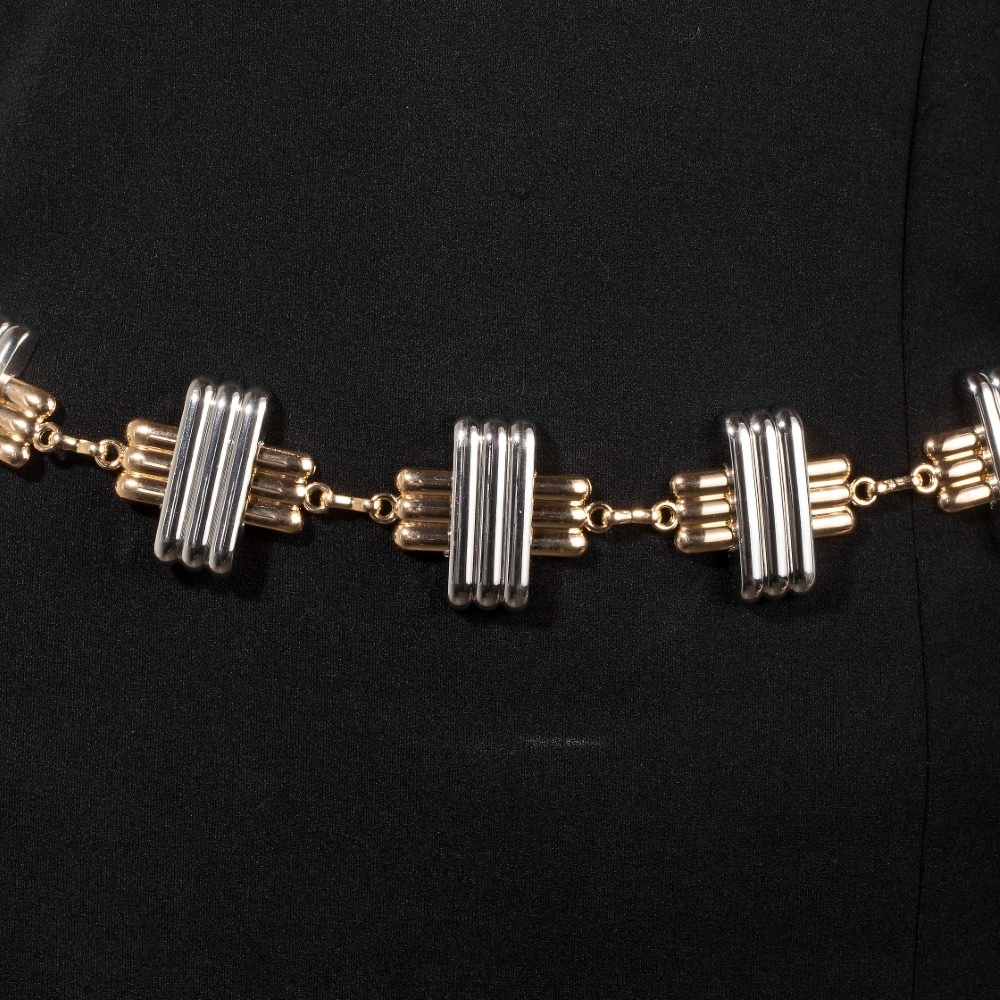 - Stay ahead of the fashion curve, this chain belt contains a special two tone layered bars design. Unleash the potential of your wardrobe with this versatile chain belt, ensuring a touch of elegance in every ensemble. Available in G, S. This item is sold in packs of 1.
