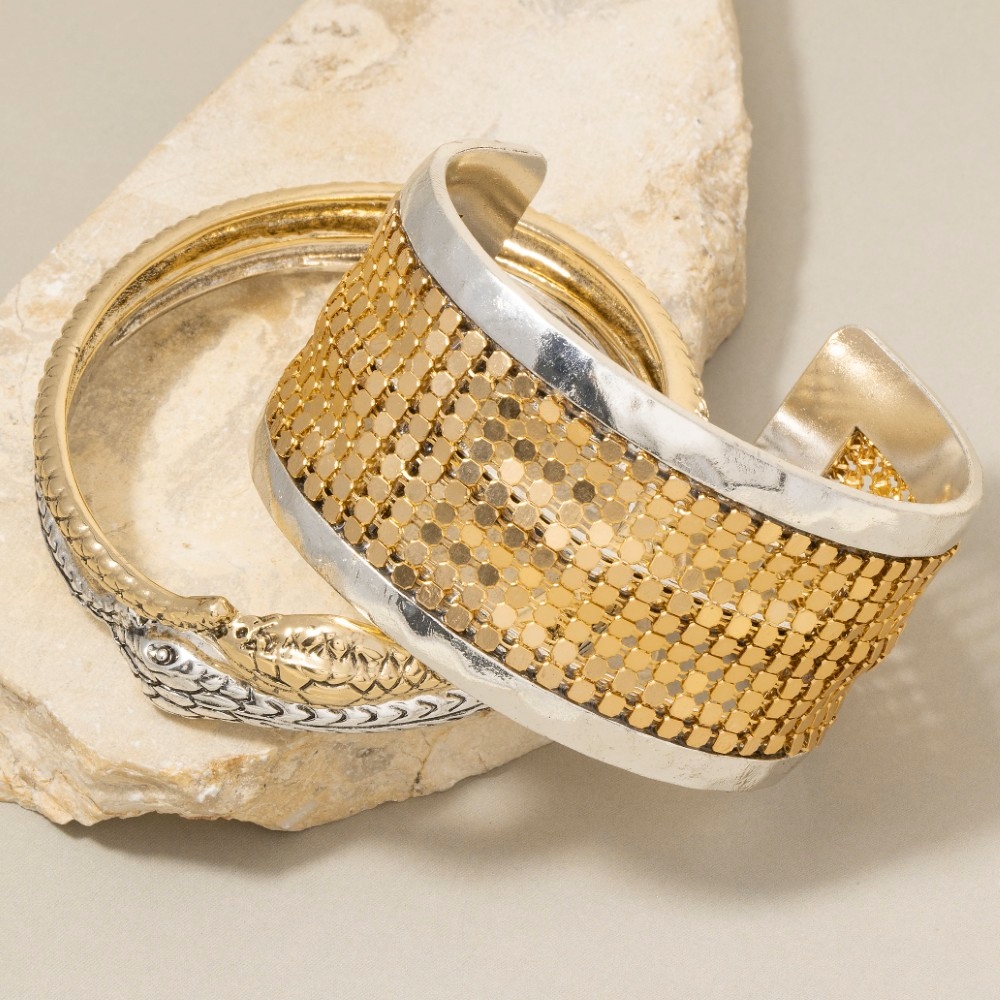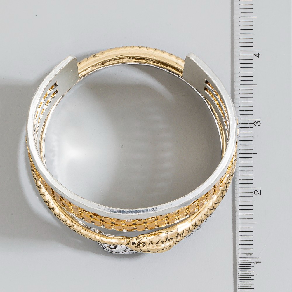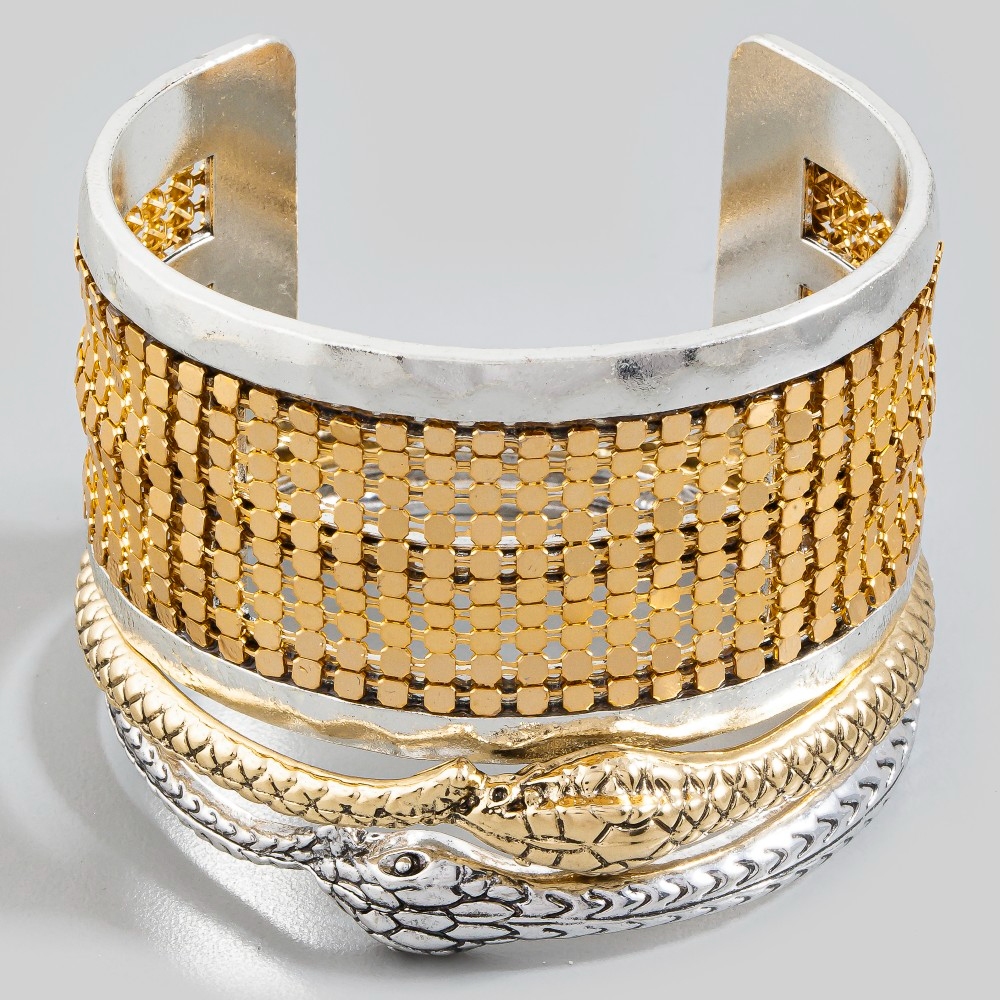 Chic, sophisticated, and always in style, this cuff bracelet incorporates a flawless two tone snake design. Discover a new level of fashion versatility as this cuff bracelet effortlessly elevates the allure of your attire. This item is sold in packs of 1.
