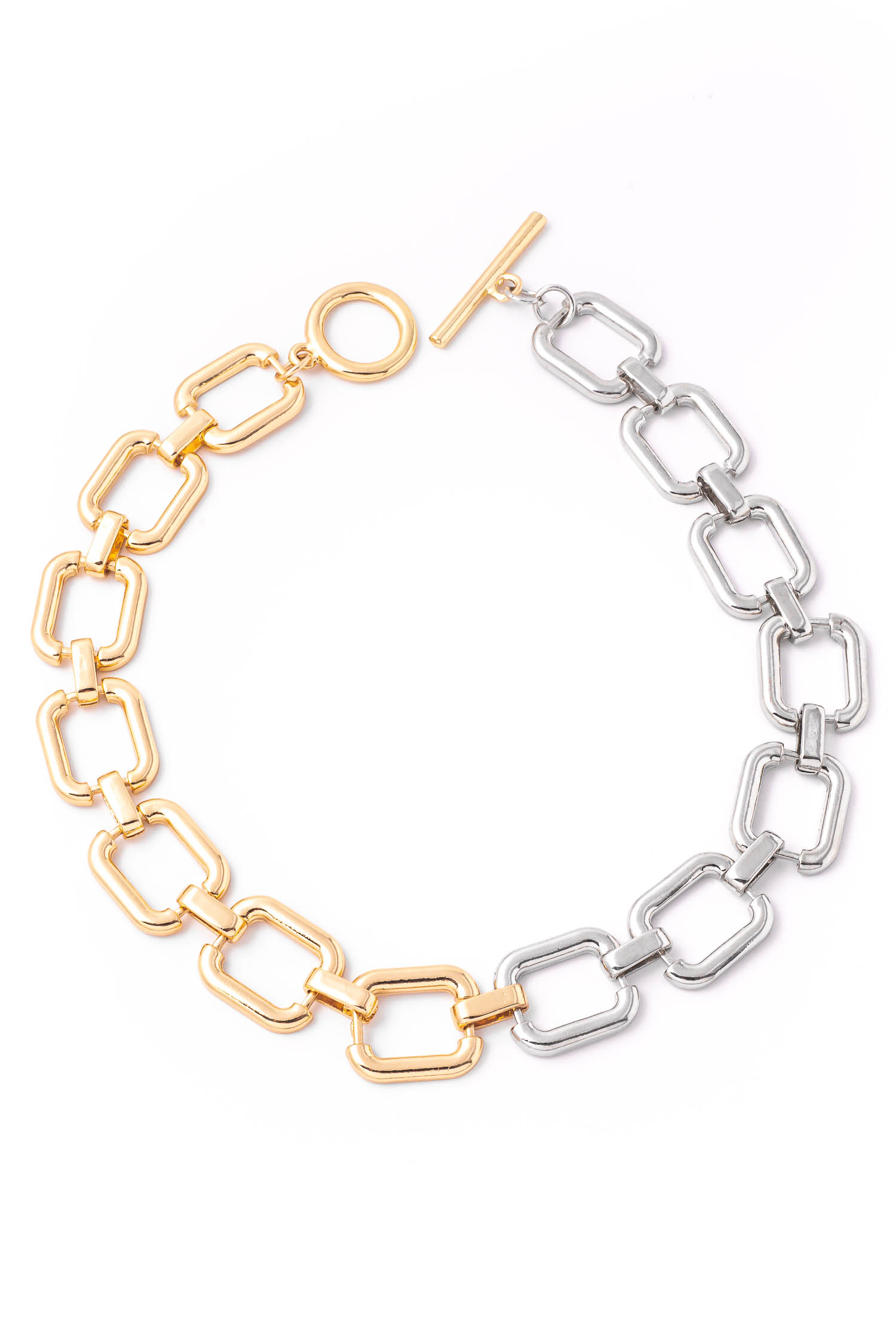 Hot chic and trending in season must have necklace that features a two tone square chain link necklace design. An absolutely gorgeous stunning must have. Available in Goldsilver. ETA 12/23/2020