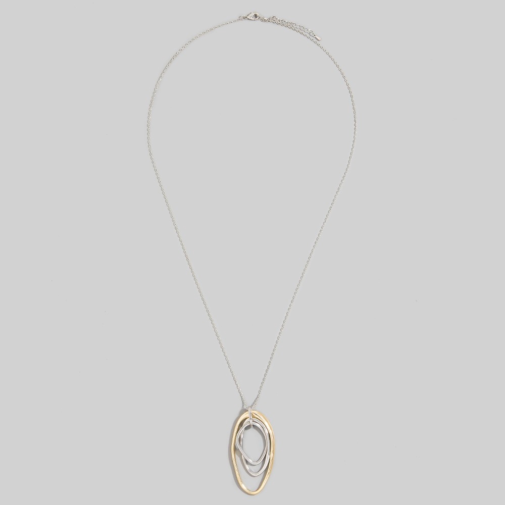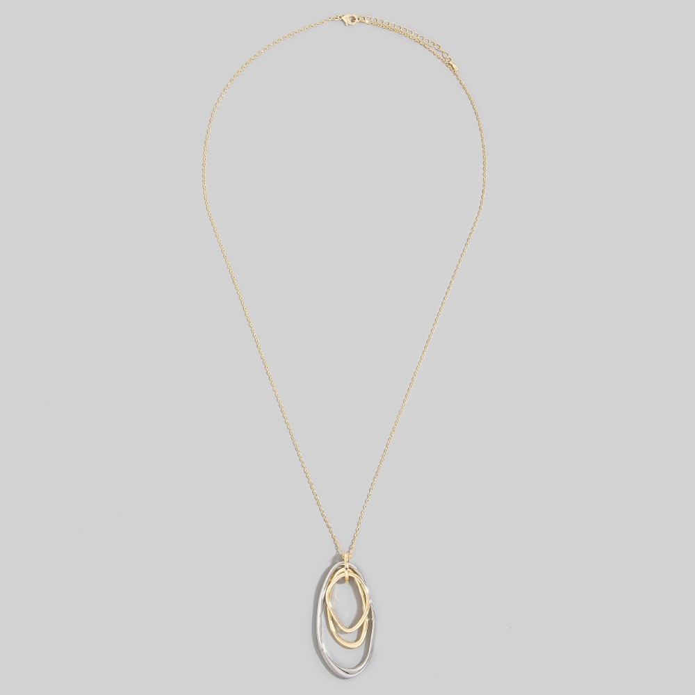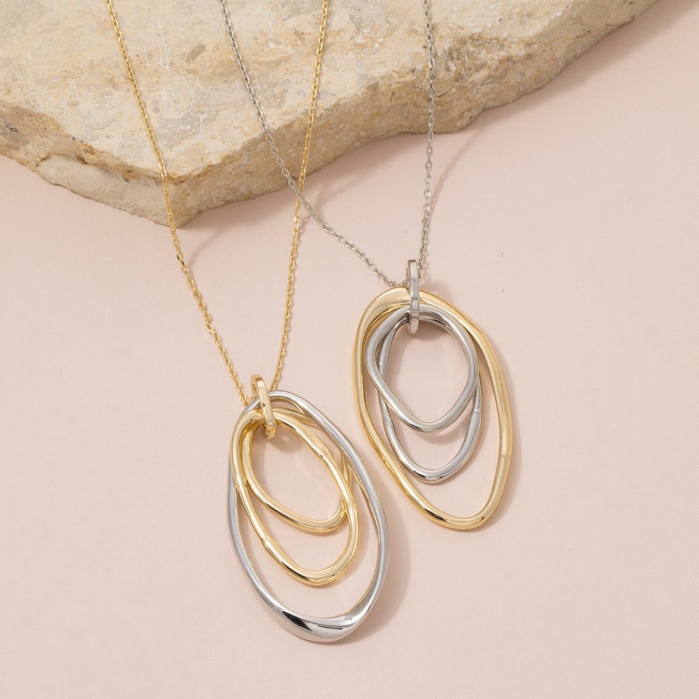 This piece is designed to make a statement, this long necklace carries a charming two-tone triple oval ring pendant design. Take your style to the next level by incorporating this versatile long necklace, a key element in achieving a polished look. This item is sold in packs of 12.