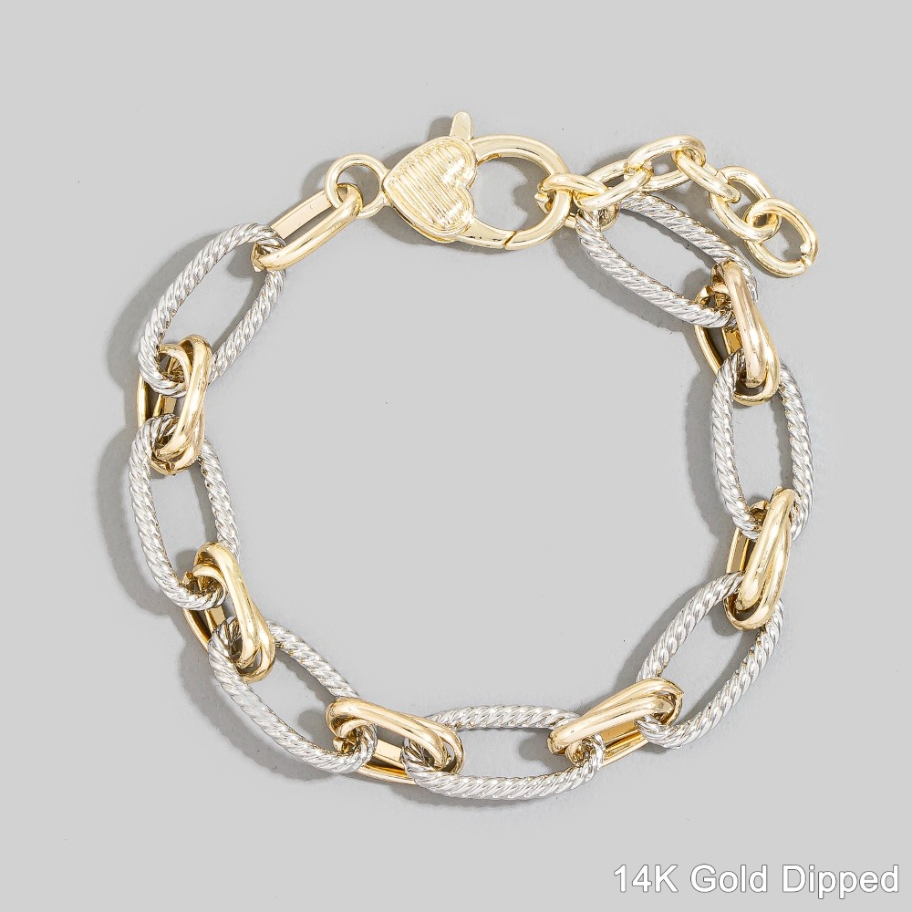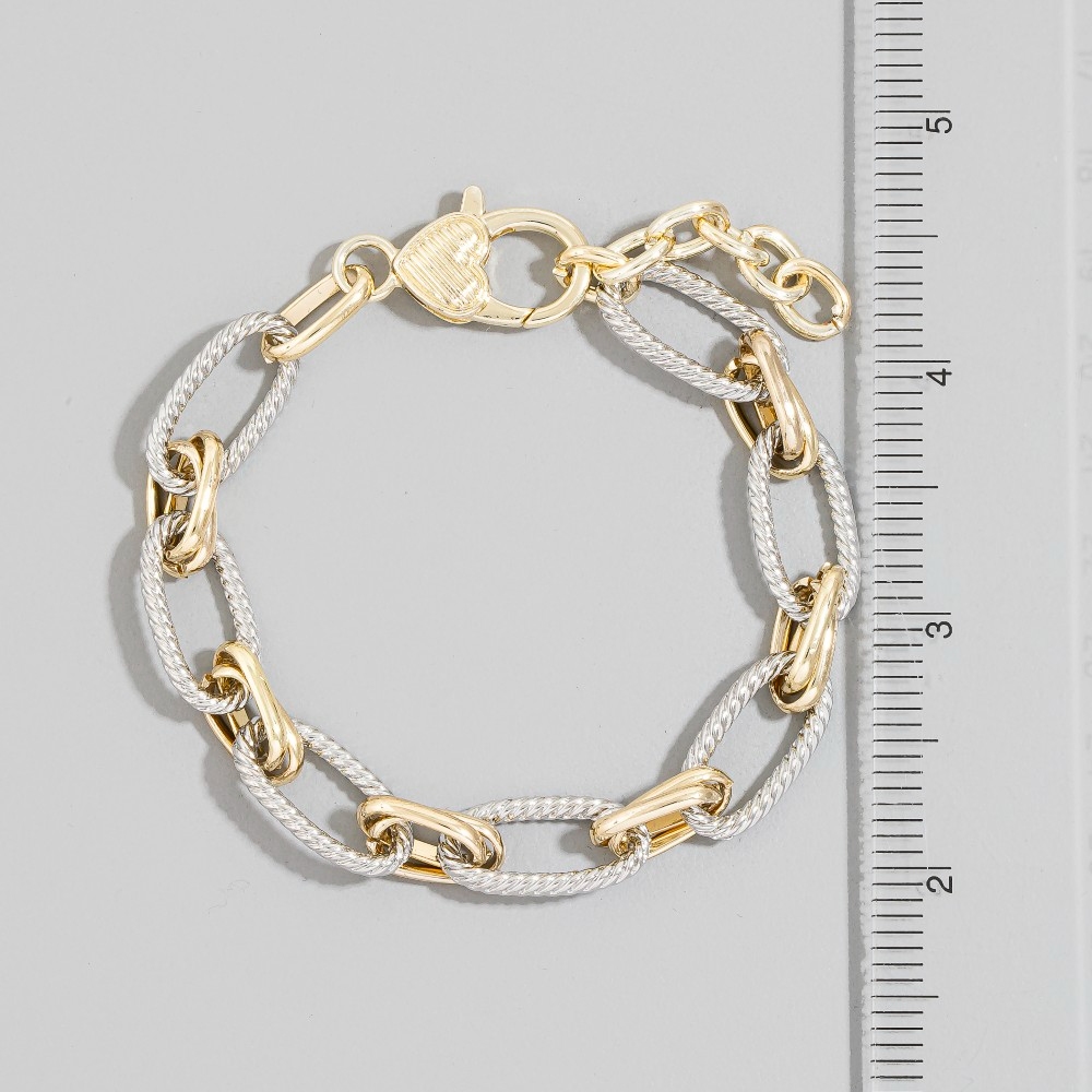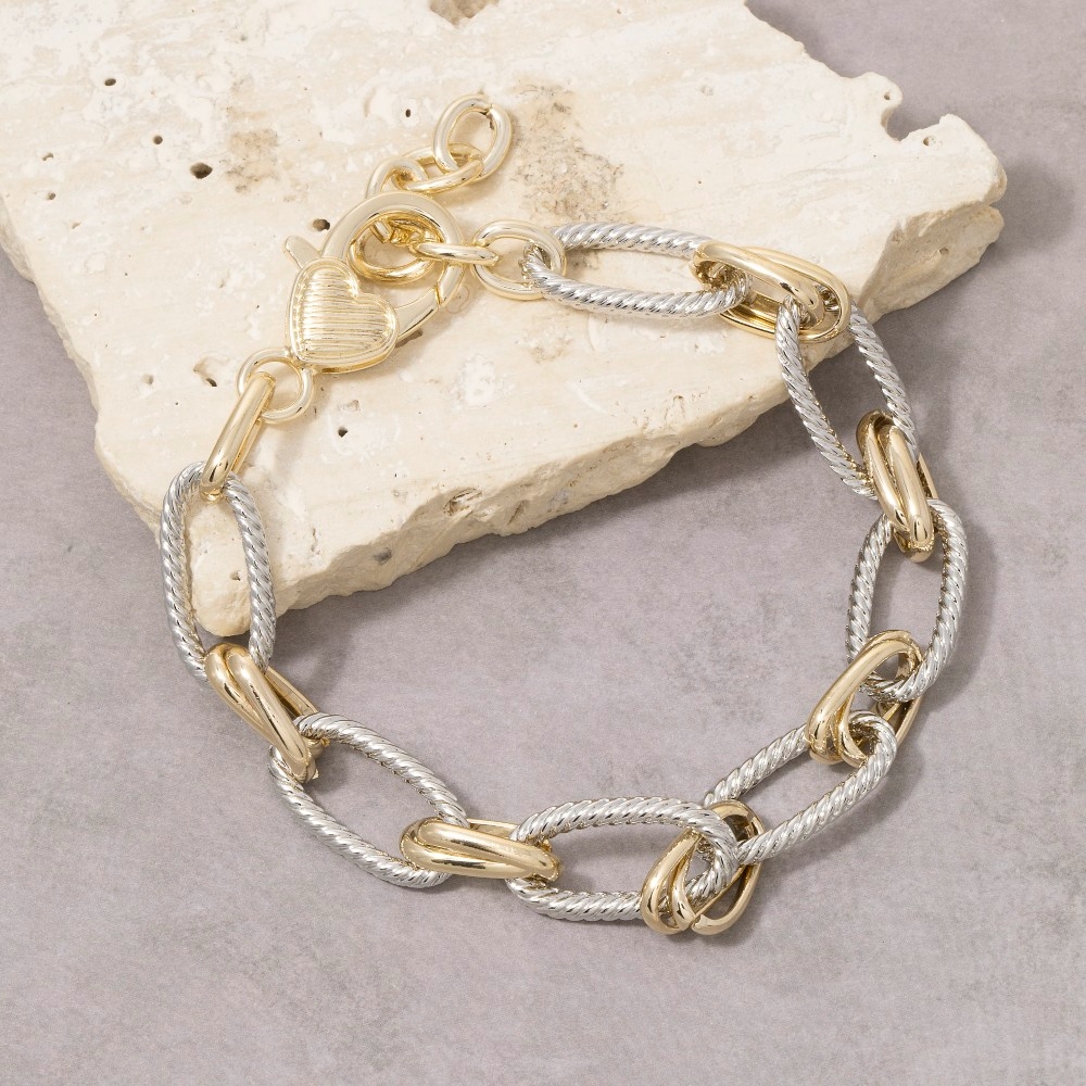 Unleash your inner fashionista, this bracelet features an exceptional two-tone twisted rope oval link design. This bracelet is the perfect way to add a touch of elegance to any outfit. This item is sold in packs of 1.