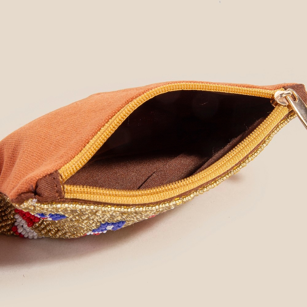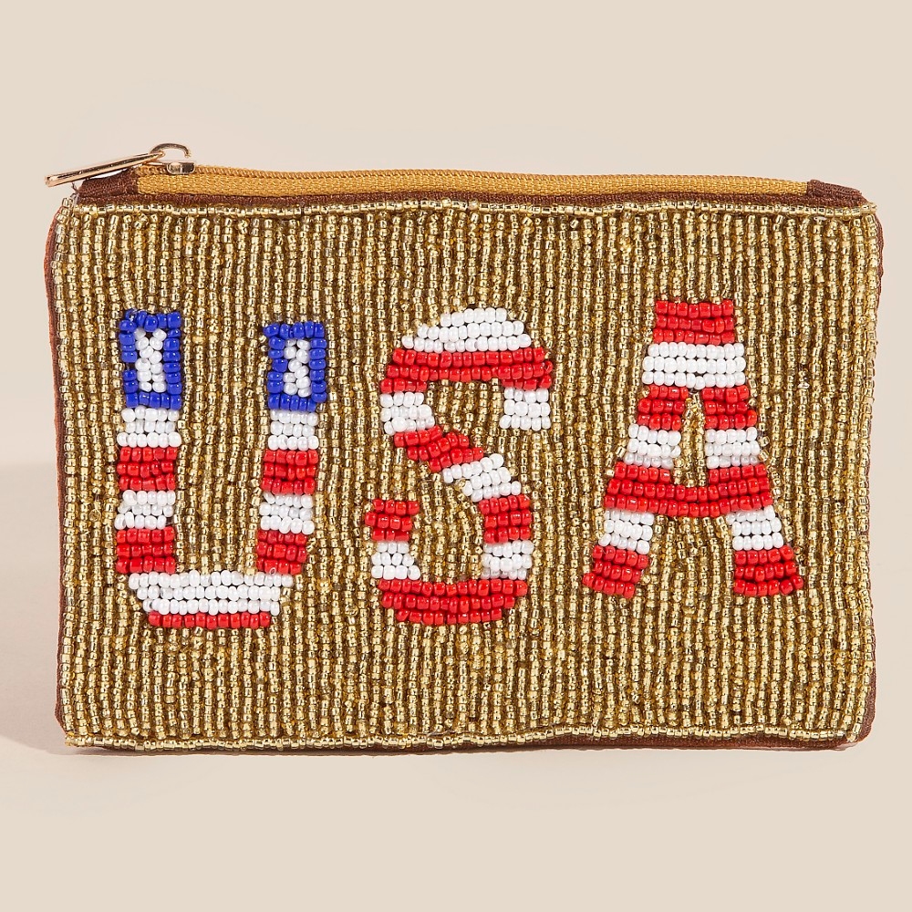 This coin purse introduces a unique usa theme golden seed beaded style. Experience refined sophistication with this understated yet stylish piece., , MADE IN INDIA, , This coin purse is featured in our Beaded, Patriotic and Beaded Bags Collection., , $0.25 FREIGHT DIMENSIONAL WEIGHT SURCHARGE INCLUDED, , 60% Beads 40% Polyester
