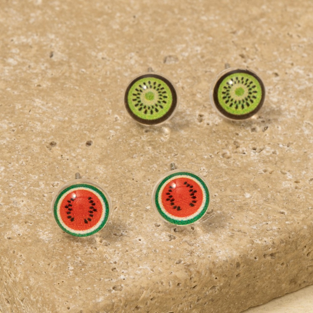 Bold and daring, this pair of stud earrings shows off a distinctive watermelon and kiwi acrylic set design. This pair of stud earrings is a great way to add some flair to your outfit without going over the top. This item is sold in packs of 1.