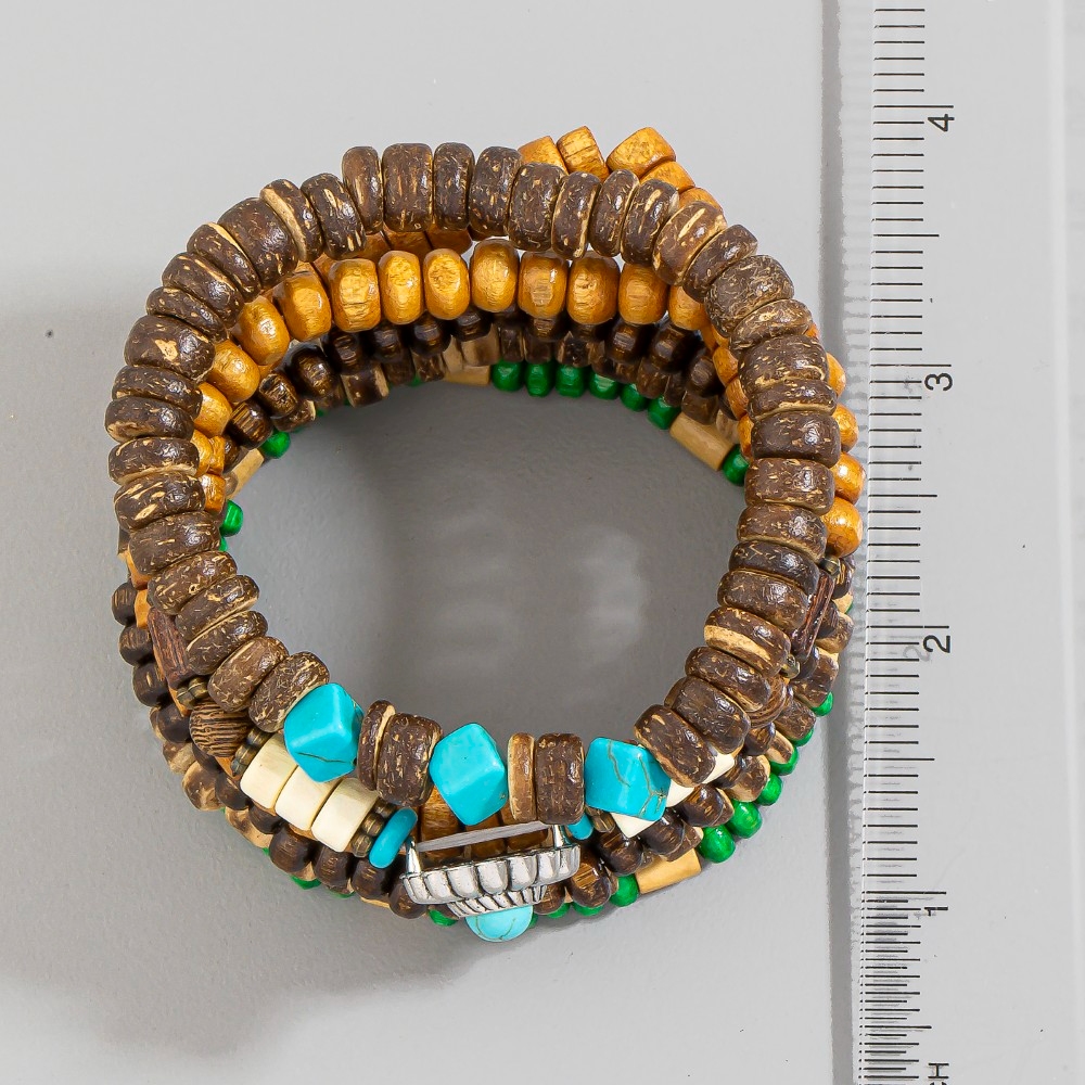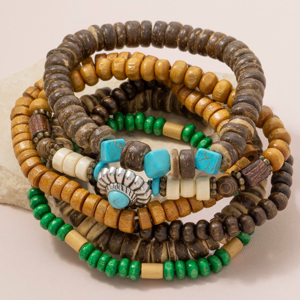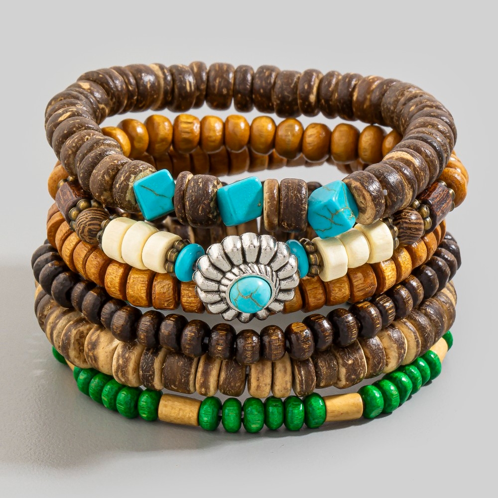 - A timeless piece that you'll wear for years to come, this stackable bracelet reveals an intricate western wooden beads set design. Take your style to the next level by incorporating this versatile stackable bracelet, a key element in achieving a polished look. This item is sold in packs of 1.