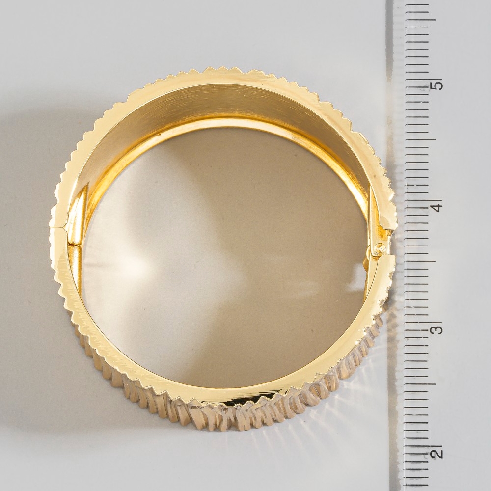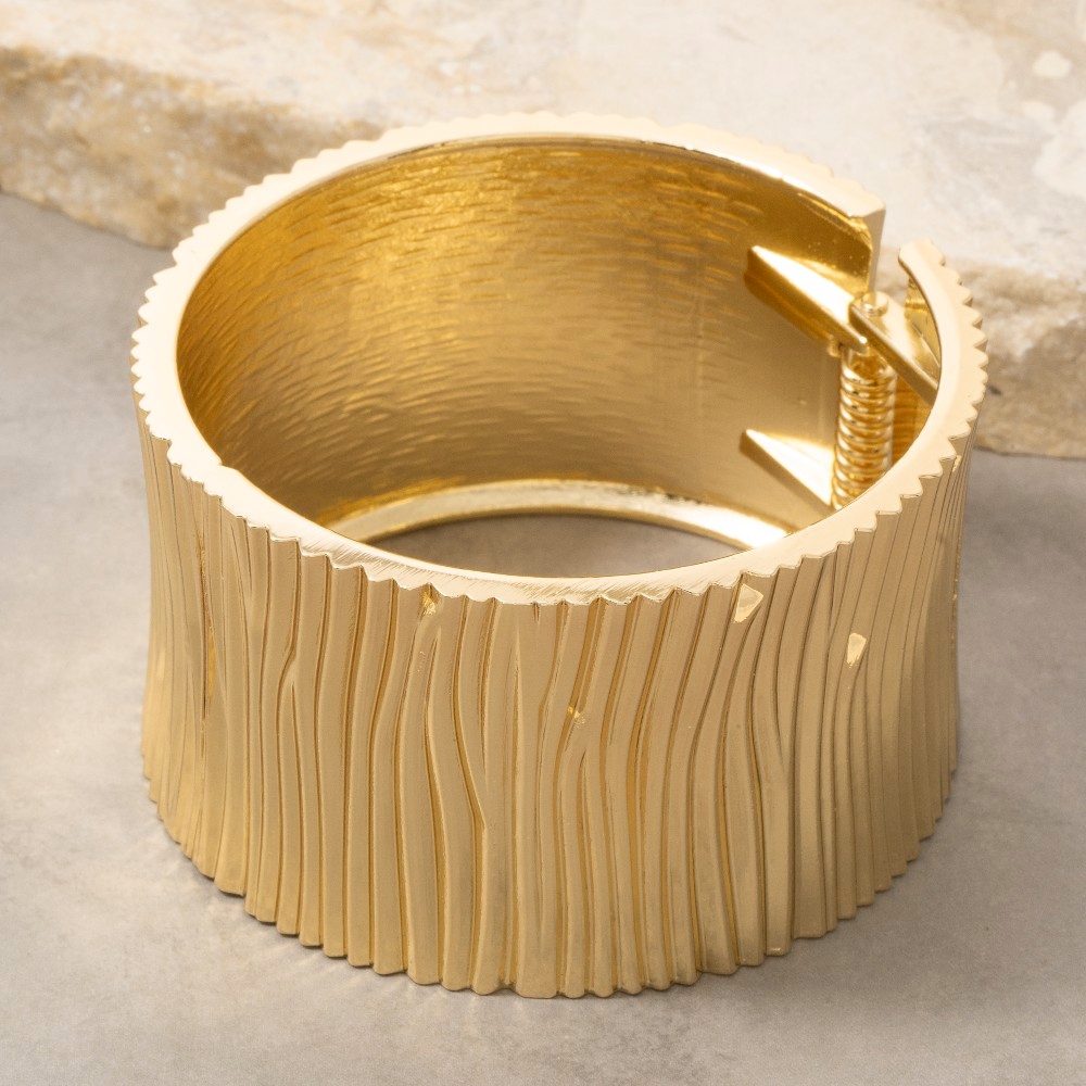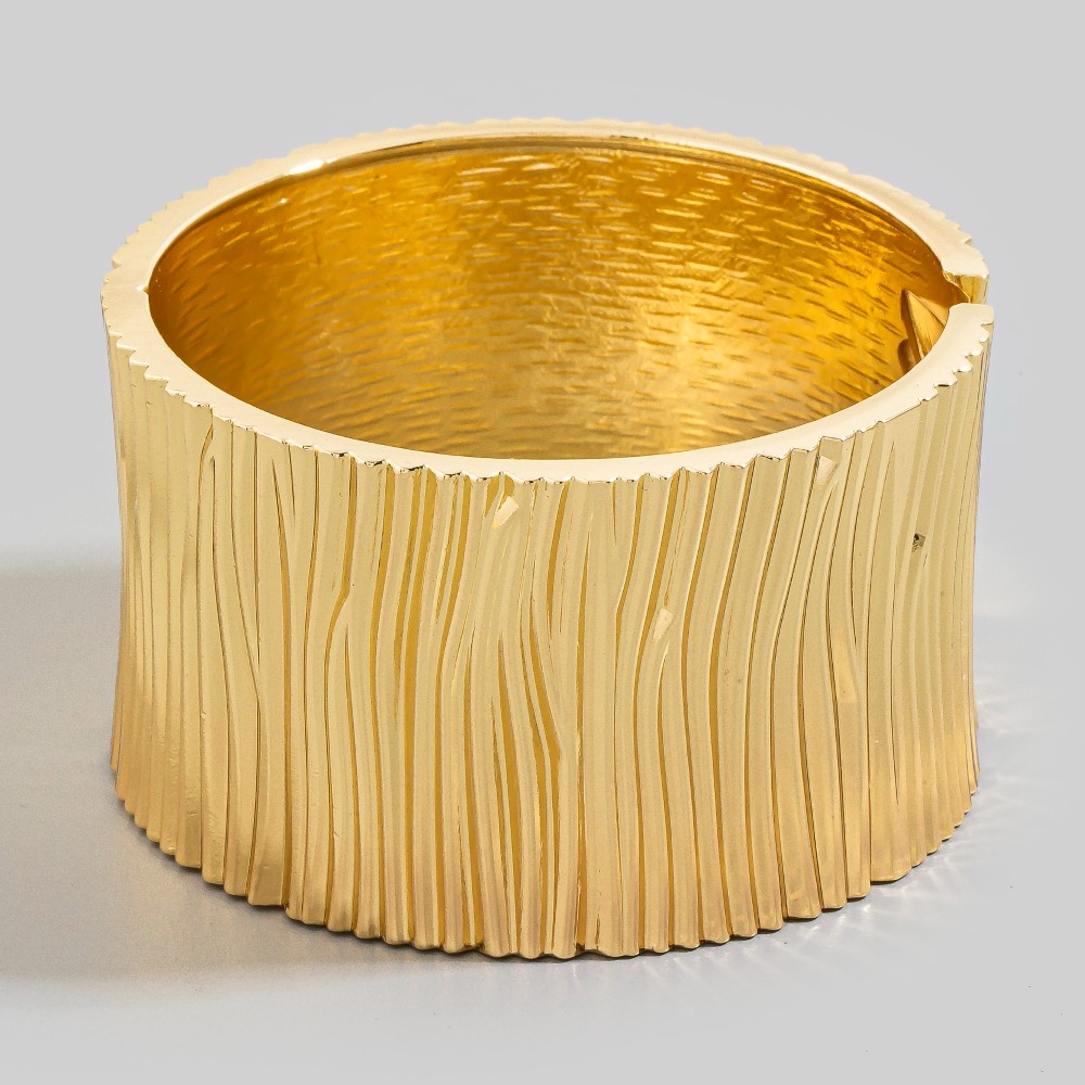 This season's must-have bangle bracelet, this bangle bracelet presents a striking wide ribbed stripe hinged design. The perfect way to complete any outfit, whether you're dressing up or keeping it casual. Available in GD. This item is sold in packs of 1.
