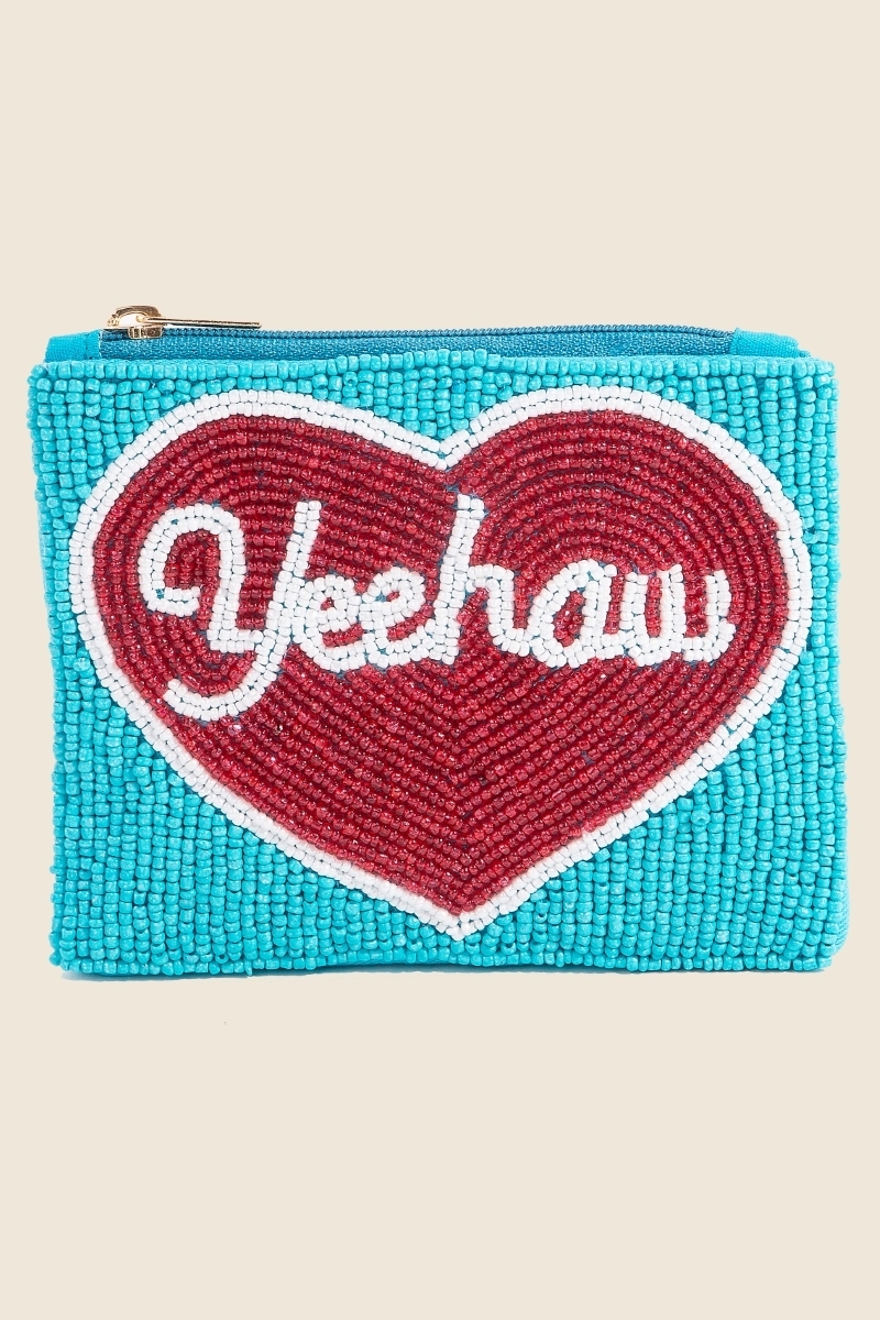 This bag showcases a timeless yeehaw heart seed beaded coin purse style. Celebrate individuality with this bag that effortlessly expresses your unique sense of style.