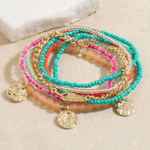 Beaded Stone Stretch Bracelet Set With Gold Heart & Coin Charms