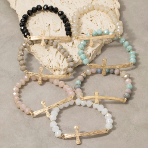 Faceted Crystal Bead Stretch Bracelet With Gold Sideways Cross