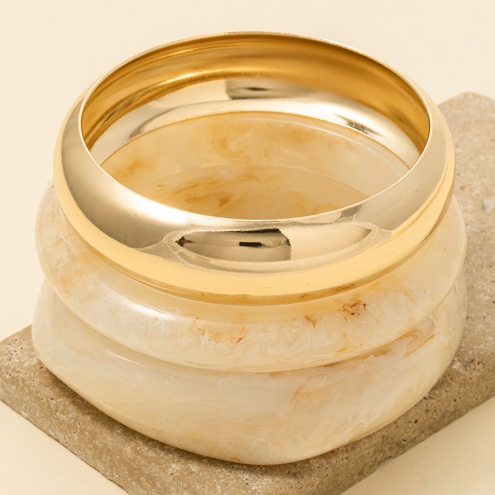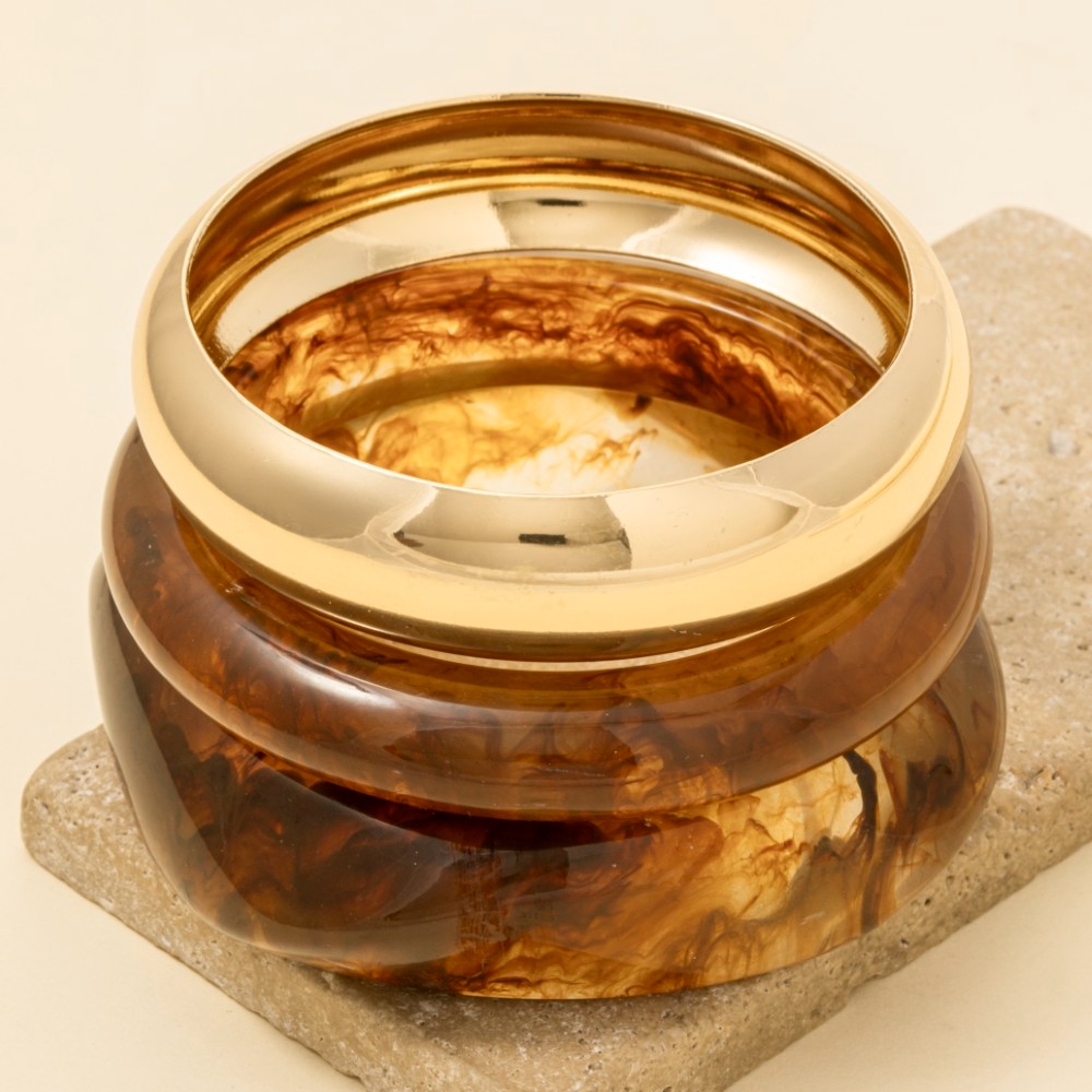 - Perfect for any fashion-forward individual, this bangle bracelet emanates an elegant 3 piece metallic and marble resin set design. Elevate your fashion statement with this versatile bangle bracelet, adding a touch of glamour to your everyday look. Available in BR, IV and KA. This item is sold in packs of 12.