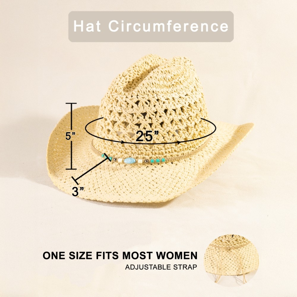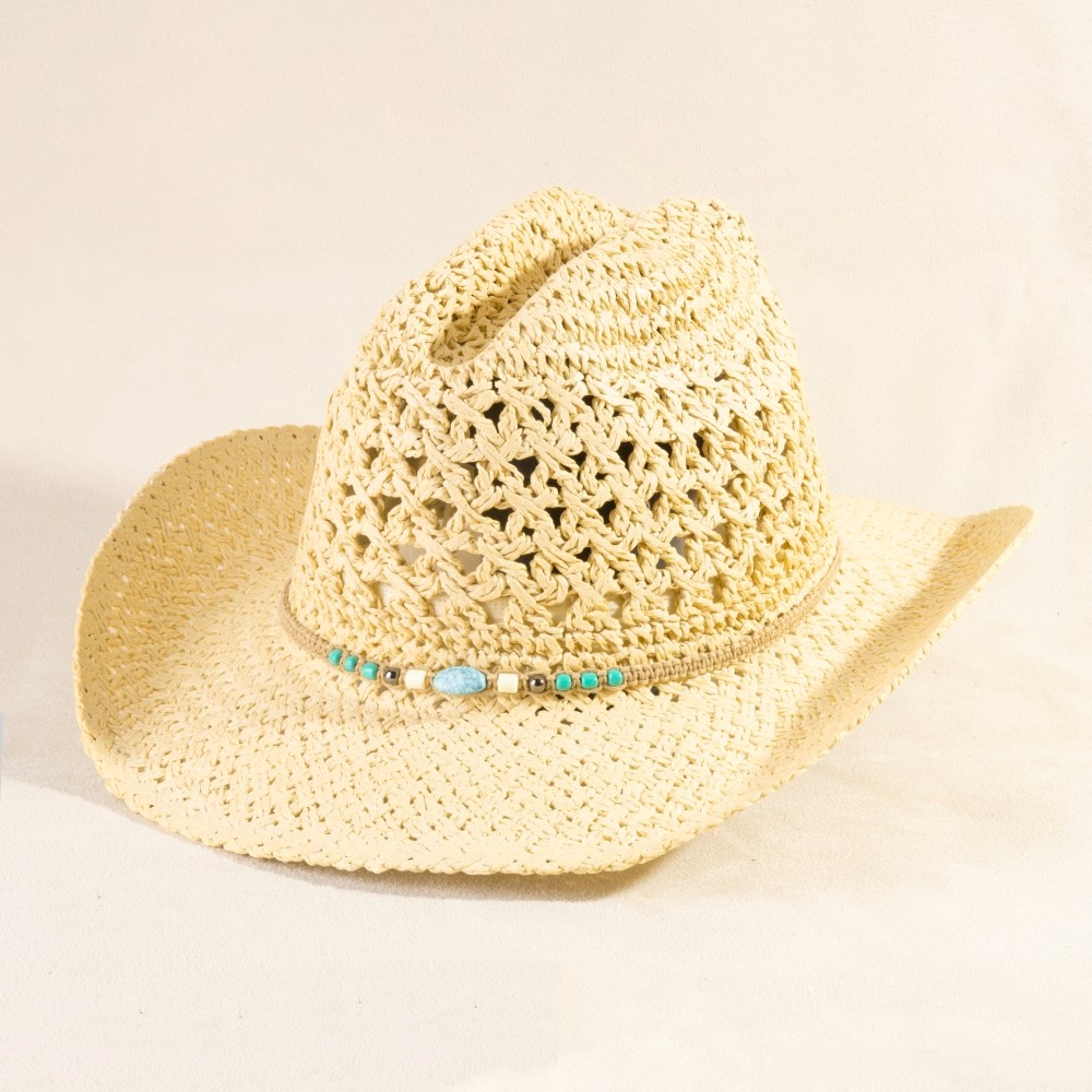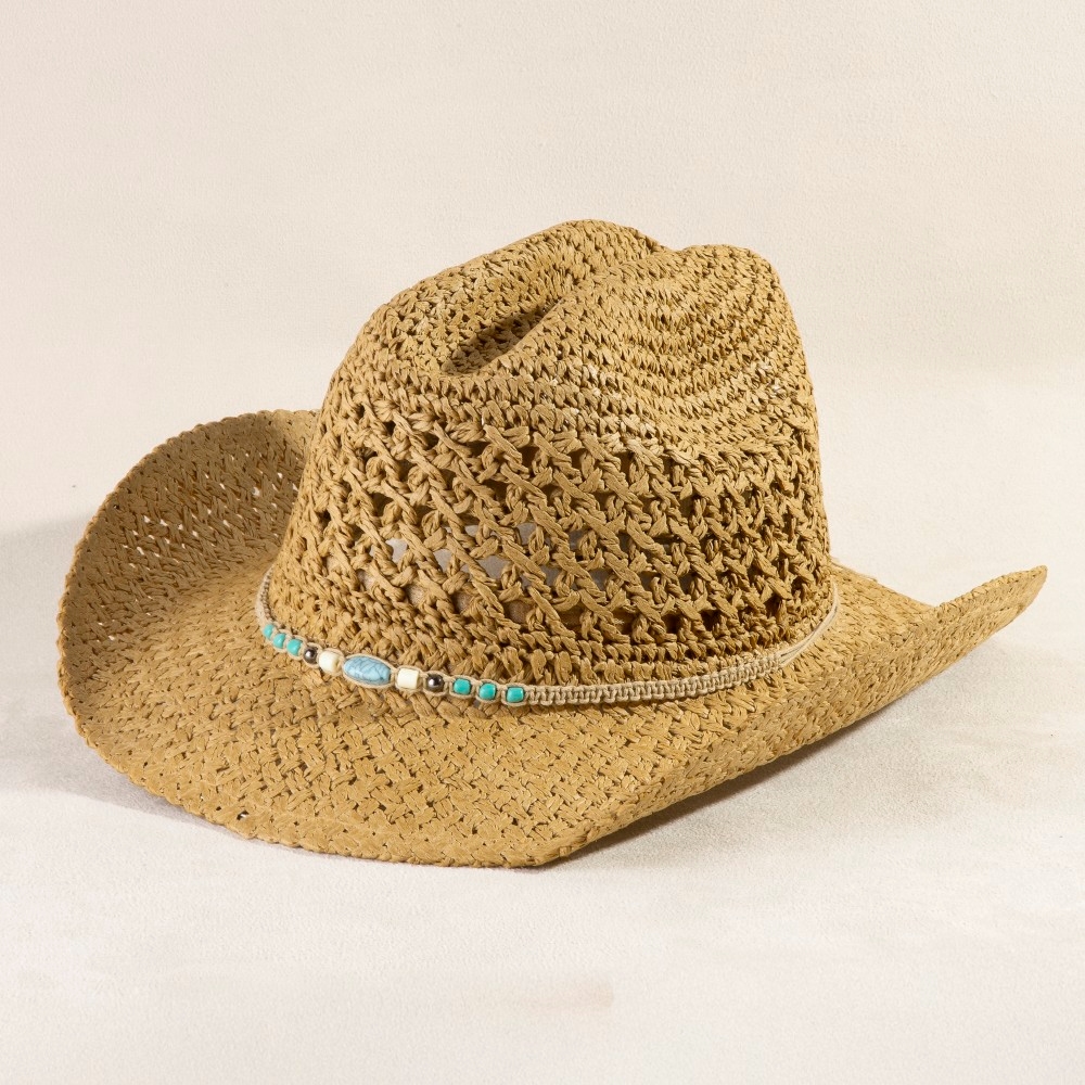 A versatile and stylish addition to any wardrobe, this cowboy hat incorporates a remarkable braided beads straw design. A chic and sophisticated cowboy hat that's perfect for dressing up or down. This item is sold in packs of 12.