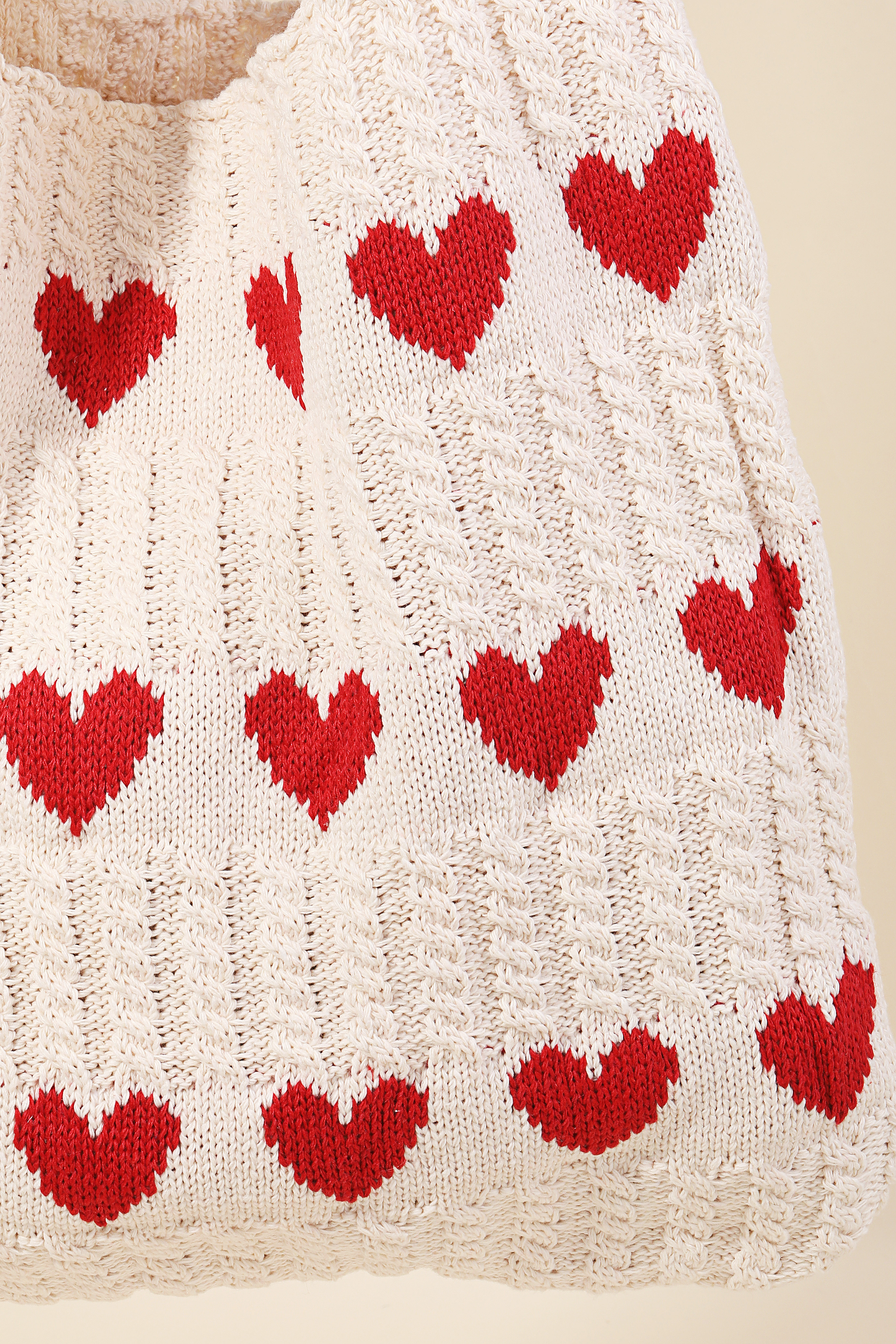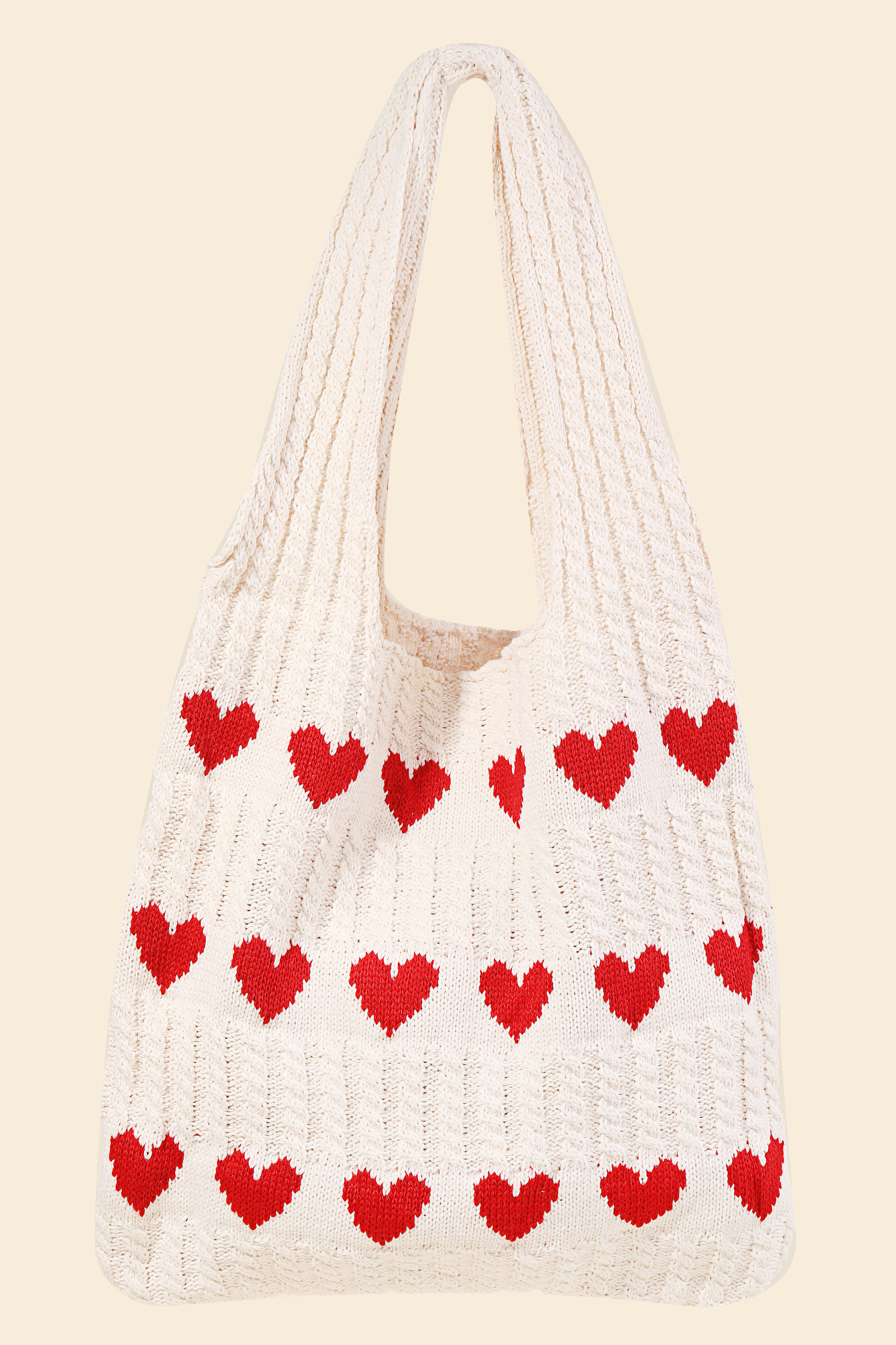 Effortlessly chic and always on-trend, this tote bag contains a special crochet knit hearts design. This item adds the perfect finishing touch to any outfit, making it stand out from the crowd. Available in Iv and Ka. This item is sold in packs of 12.
