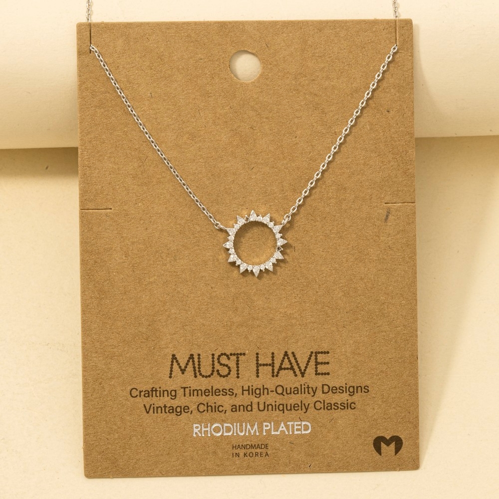 This piece is both timeless and contemporary, this trending necklace features an exceptional gold dipped pave circle sun pendant necklace design. Infuse elegance into your daily wardrobe with the versatile charm of this must-have trending necklace. Available in G, R and S. This item is sold in packs of 12.