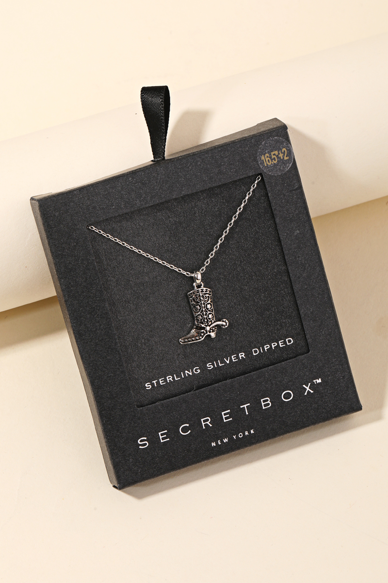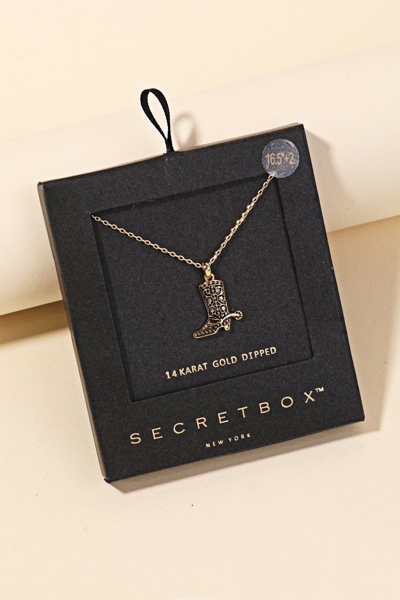 A stunning piece that is sure to turn heads, this necklace displays a unique secret box western cowboy boot pendant design. Perfect for any occasion, this versatile necklace will enhance any outfit you wear. This item is sold in packs of 12.