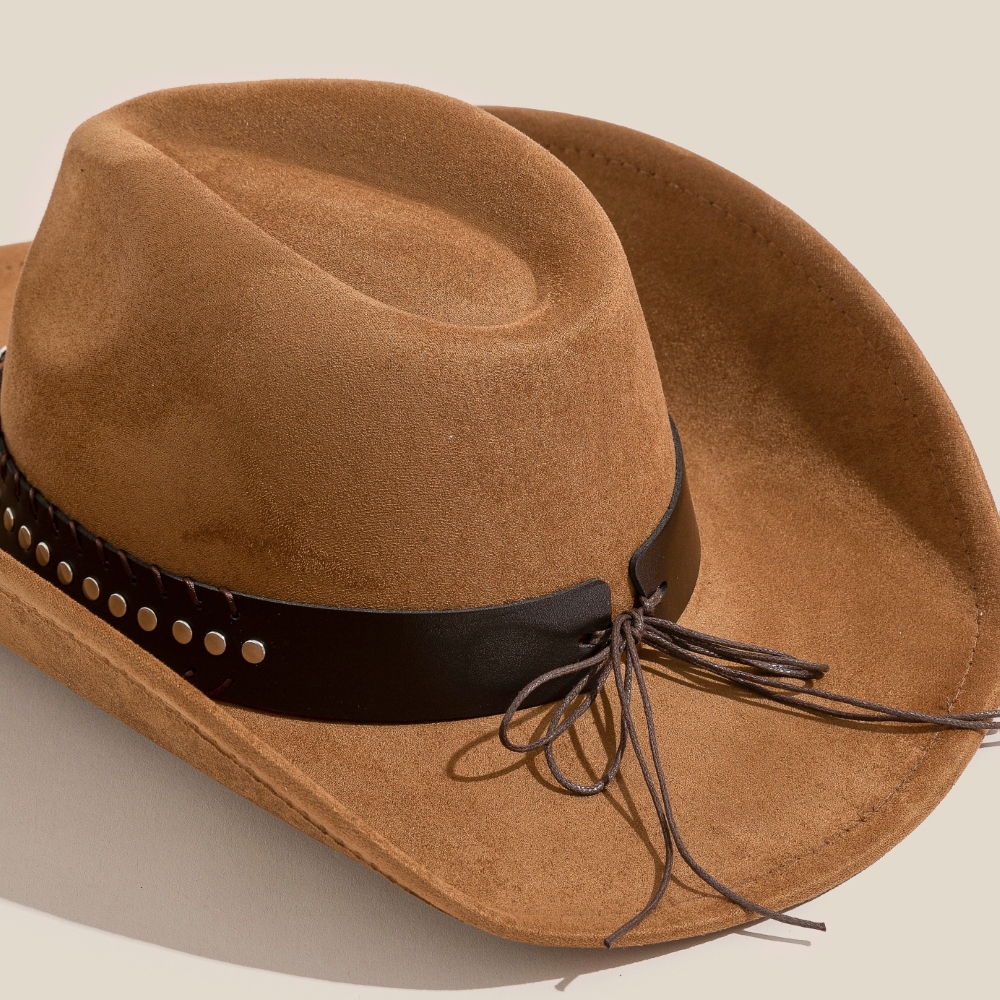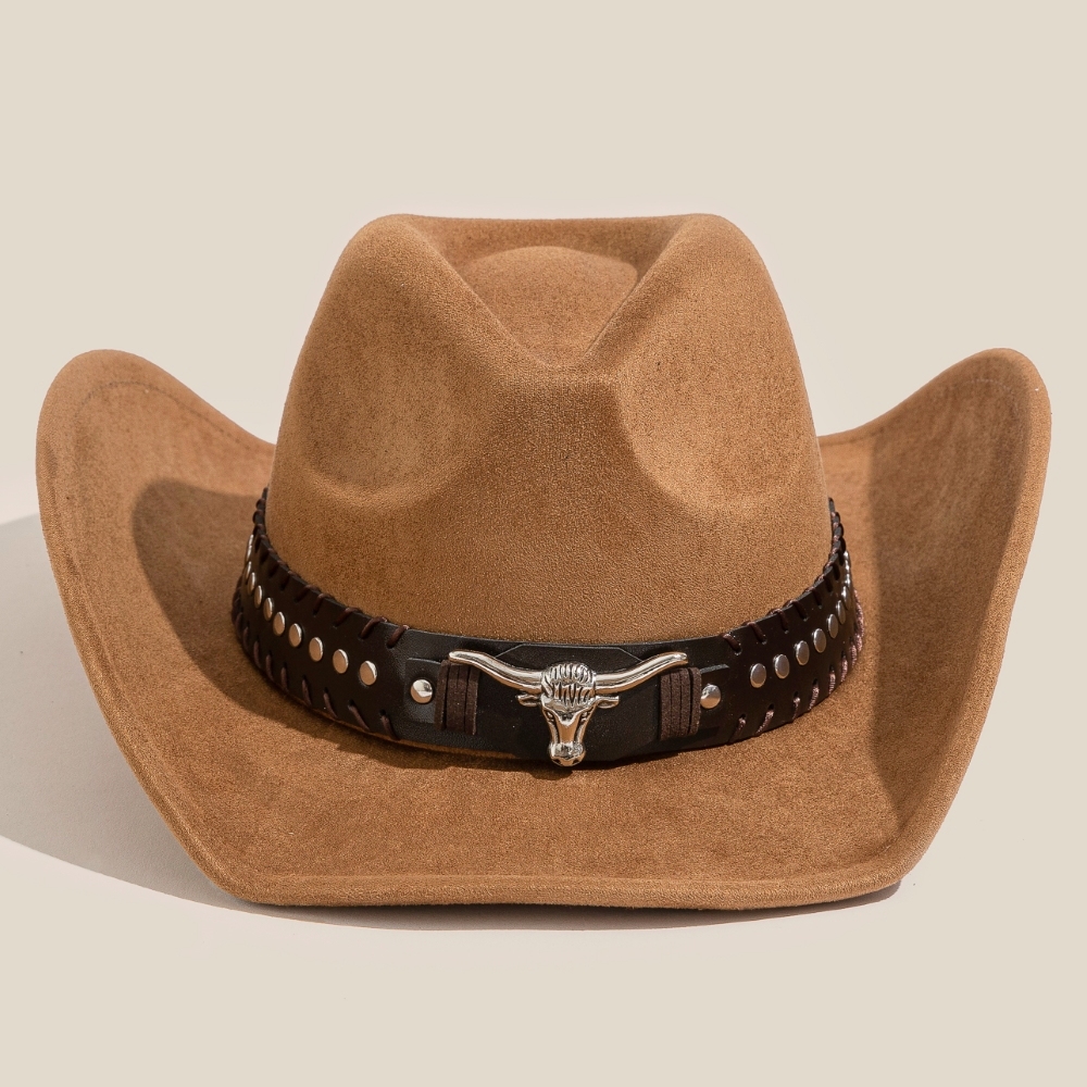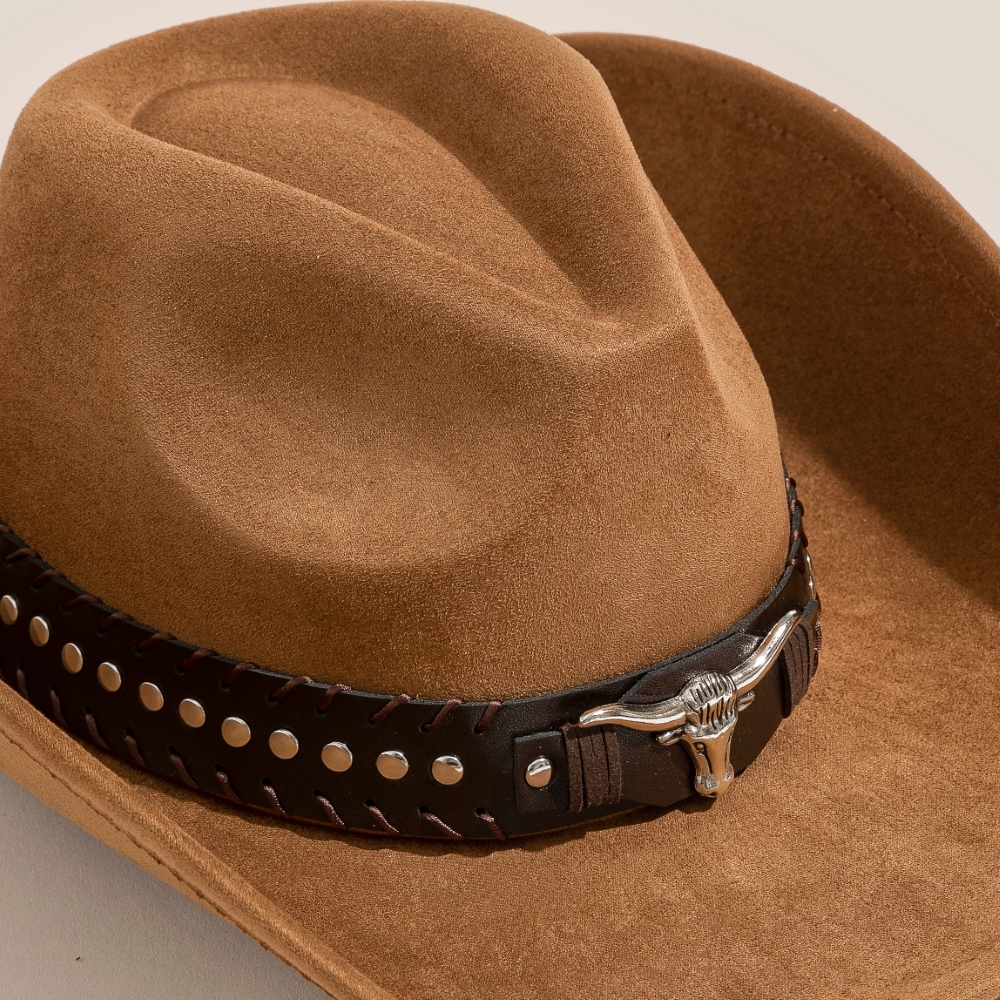 - Effortlessly elevate your style, this cowboy hat exudes a refined studded western bull head strap design. Add some personality to your outfit with this stylish cowboy hat. Available in BK, DBR, IV. This item is sold in packs of 12.