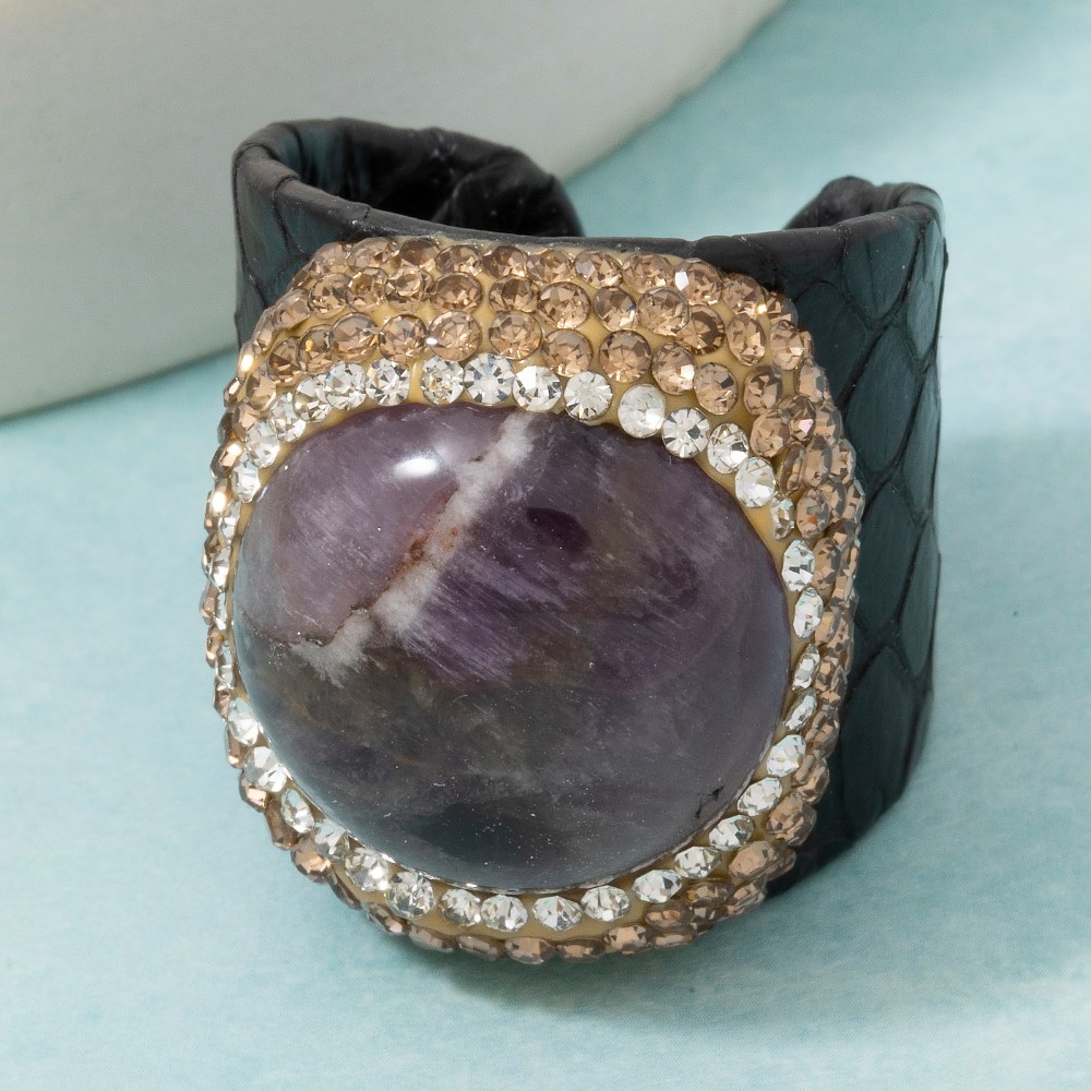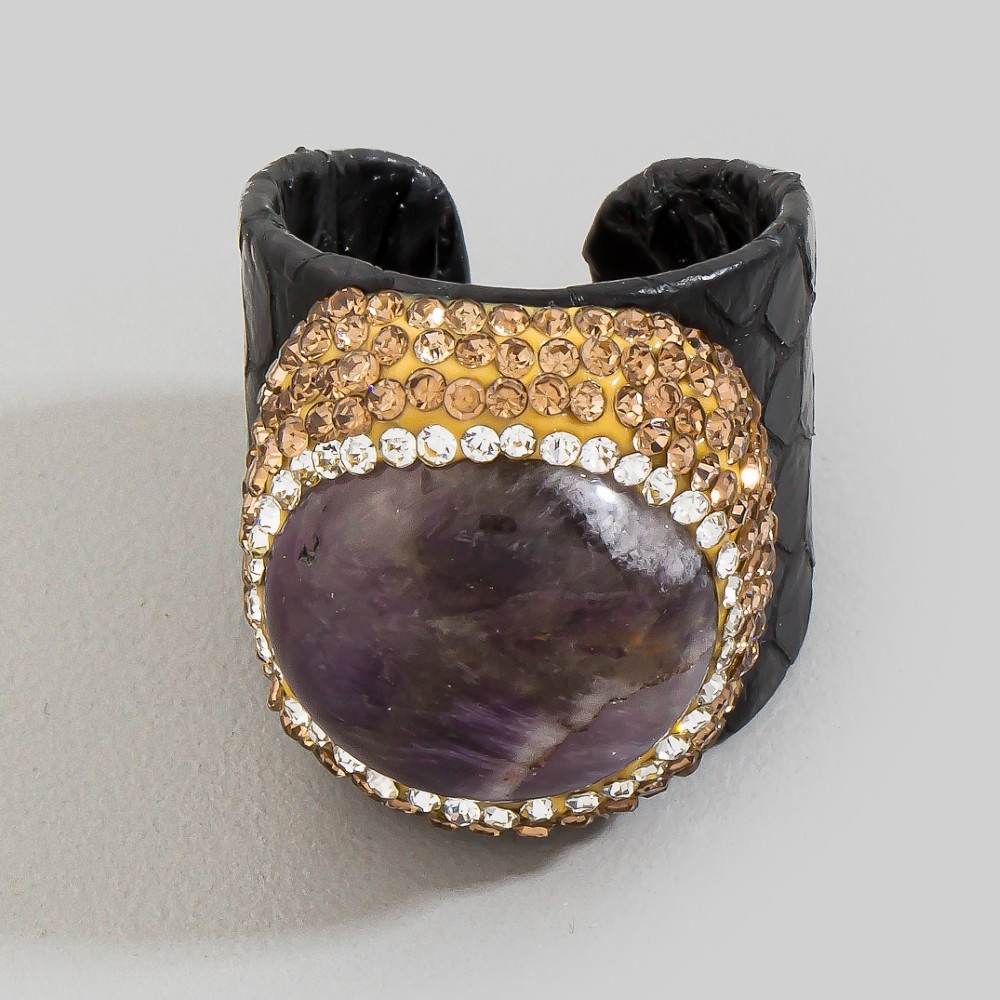 A bold and daring choice that is sure to impress, this ring brings a one-of-a-kind amethyst stone pave leather band design. Perfect for dressing up or down, this versatile ring adds a touch of sophistication to any look. This item is sold in packs of 1.