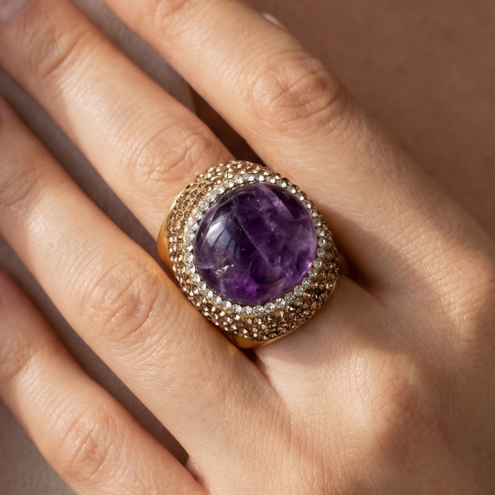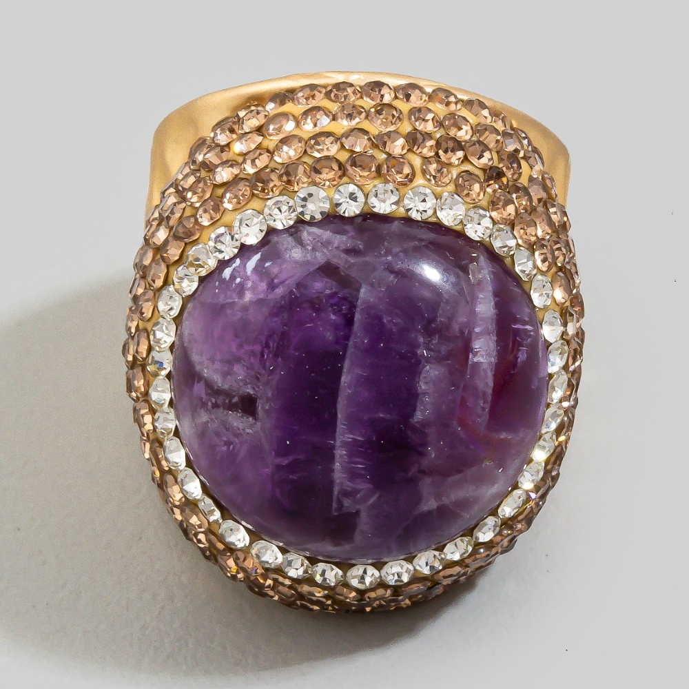 • Effortlessly elevate your style, this ring incorporates a remarkable amethyst stone pave statement design. This item is the perfect finishing touch to any outfit, adding a touch of glamour and sophistication. Available in BK, GD. This item is sold in packs of 1.