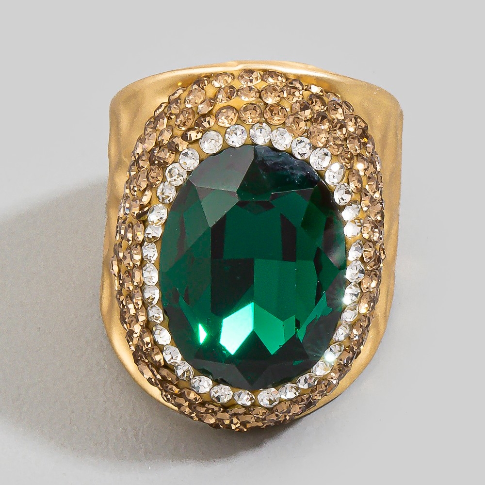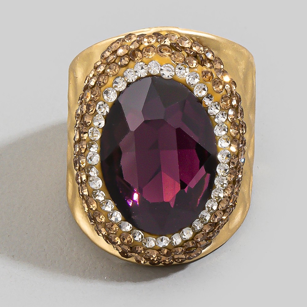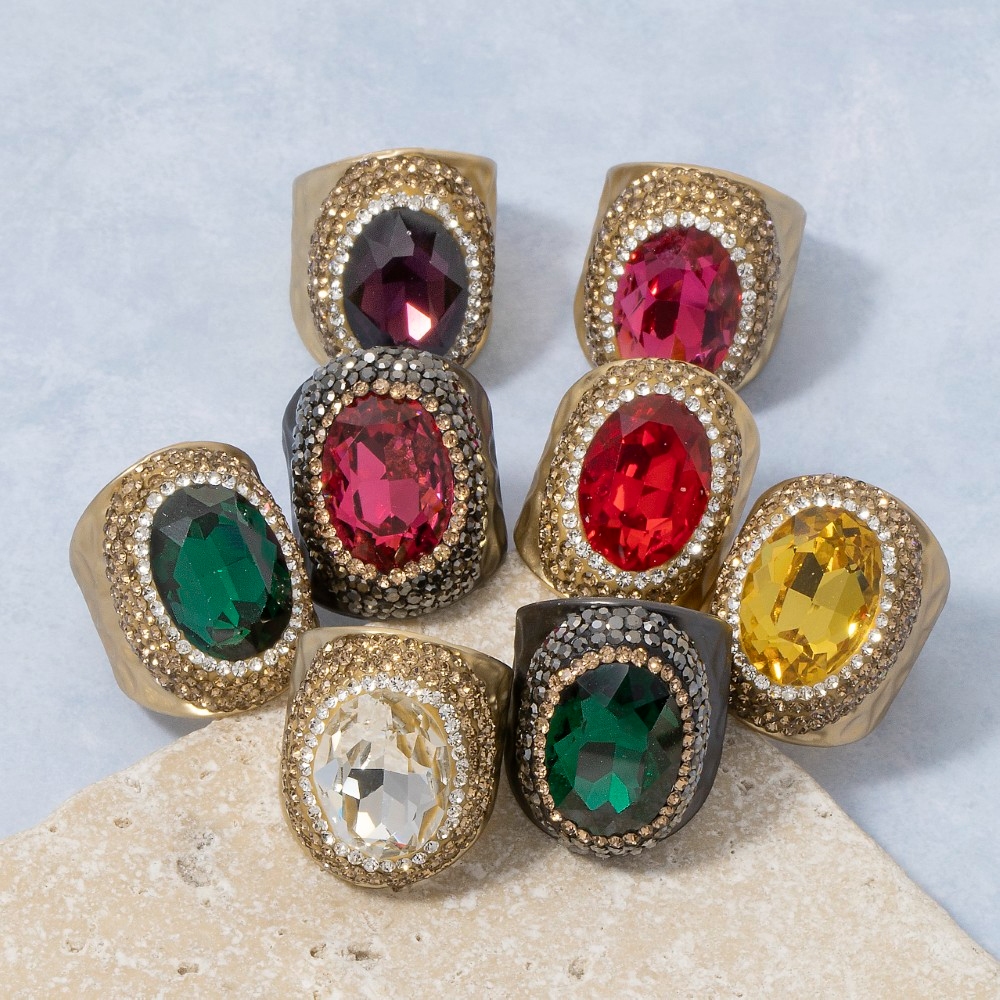 - This season's hottest ring, this ring presents a striking colorful faceted stone pave statement design. Add a dash of sophistication to your look with this versatile ring, a must-have for fashion enthusiasts. Available in BKGR, BKRR, GDGR, GDPU, GDRD, GDRR, GDWH, GDYW. This item is sold in packs of 1.