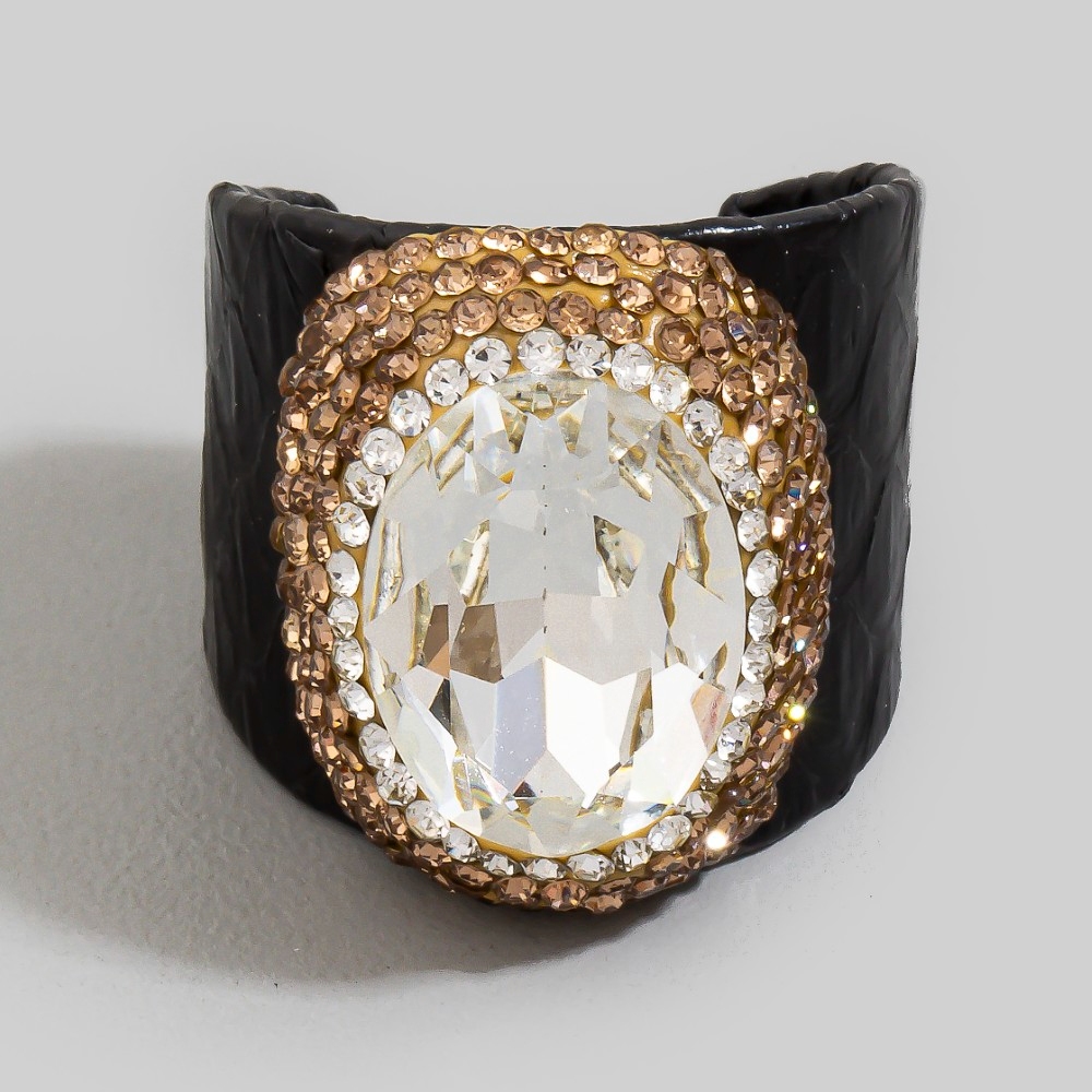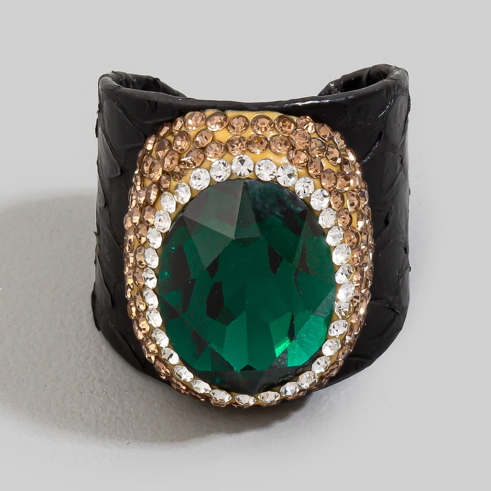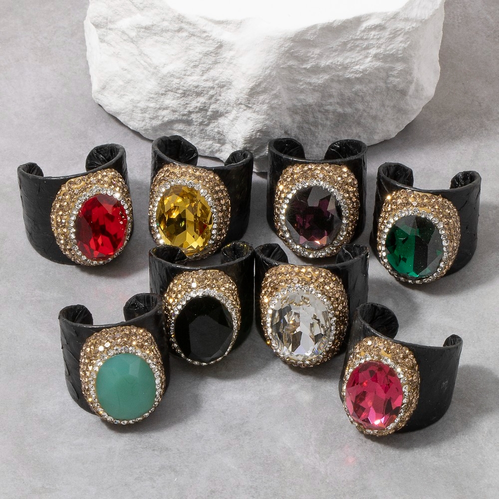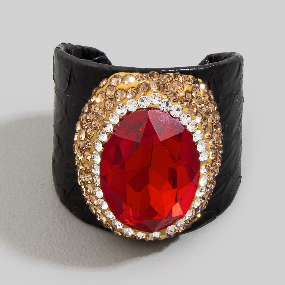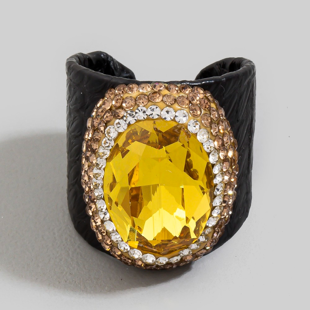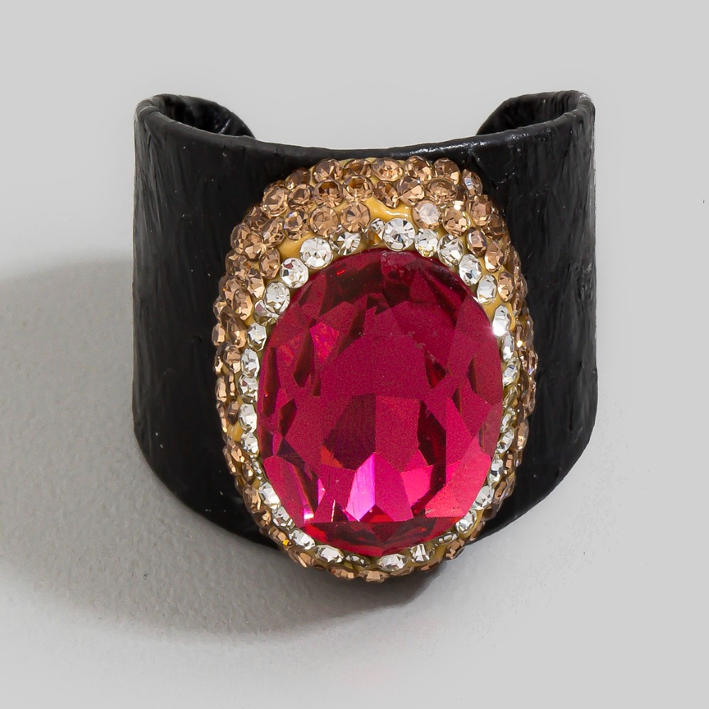 Pave Faceted Crystal Stone Leather Band Statement Ring