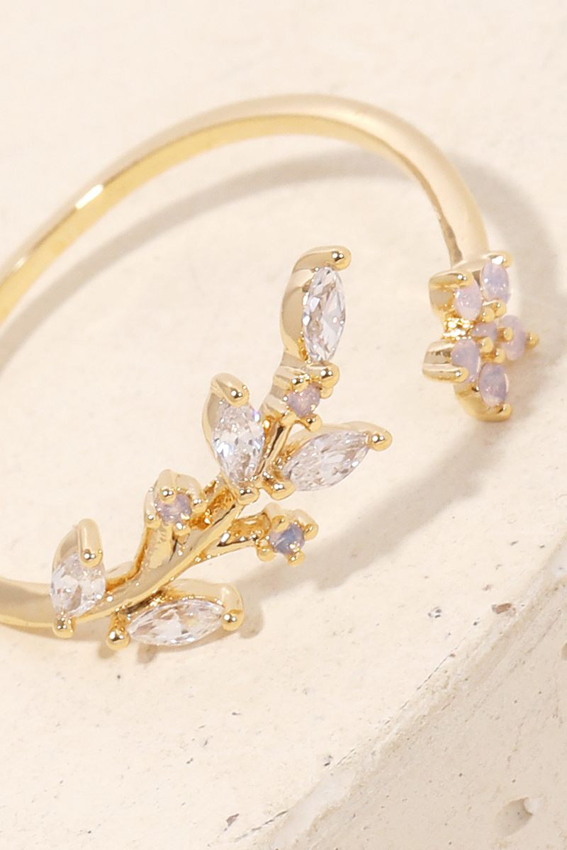 - A bold and daring choice, perfect for those who want to stand out from the crowd, this ring embodies a sophisticated gold dipped dainty rhinestone leaf flower open design. Infuse elegance into your daily wardrobe with the versatile charm of this must-have ring. Available in G, R and S. This item is sold in packs of 1.