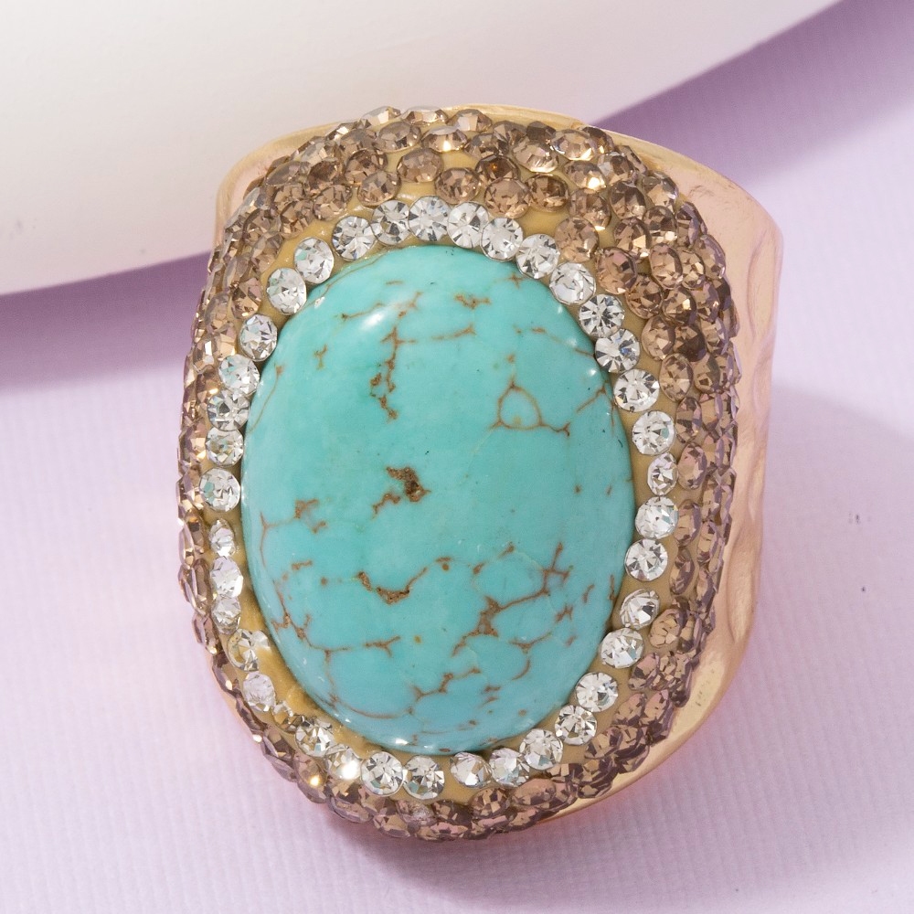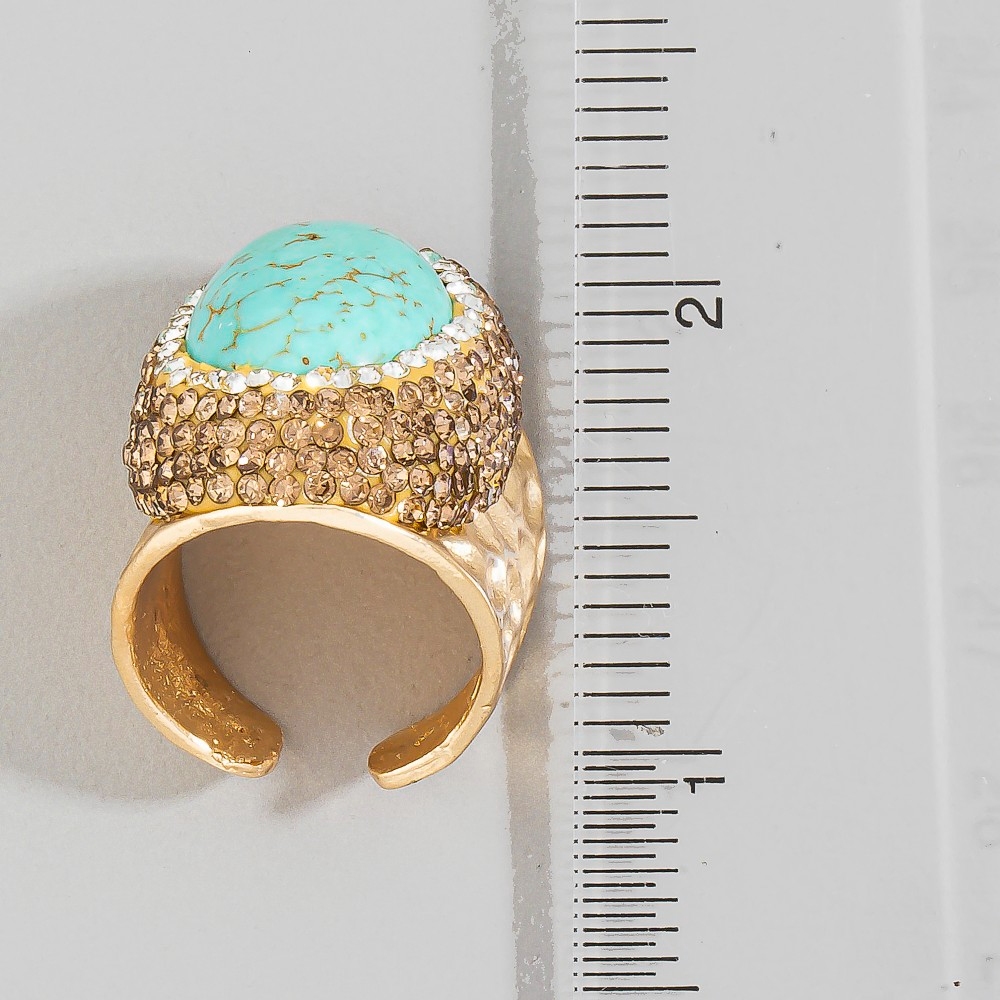 A classic design with a modern twist, this ring exudes a refined gold pave turquoise stone statement design. A must-have ring that adds a unique flair to any look. This item is sold in packs of 1.