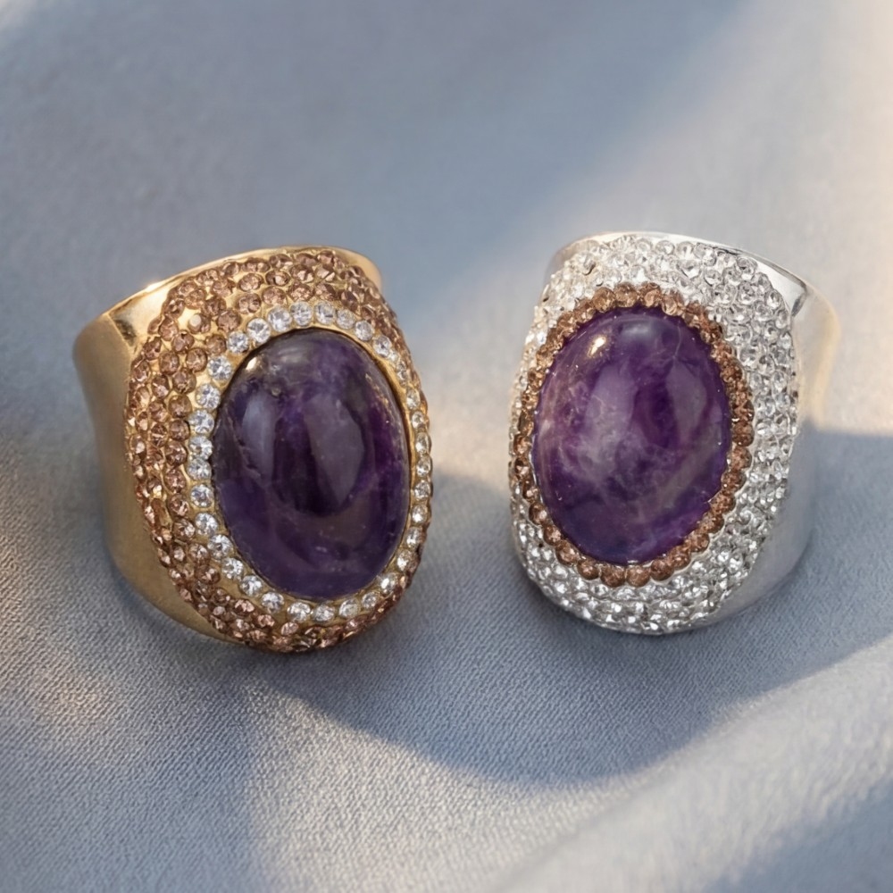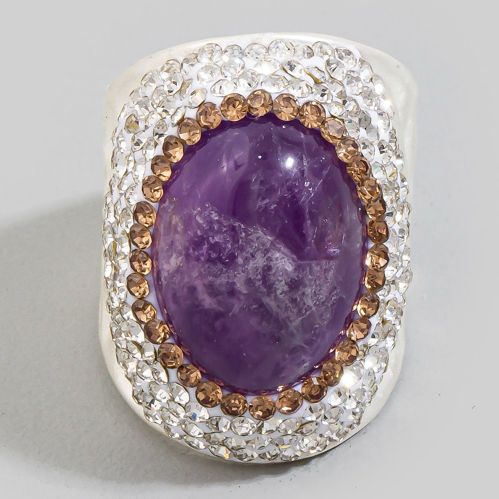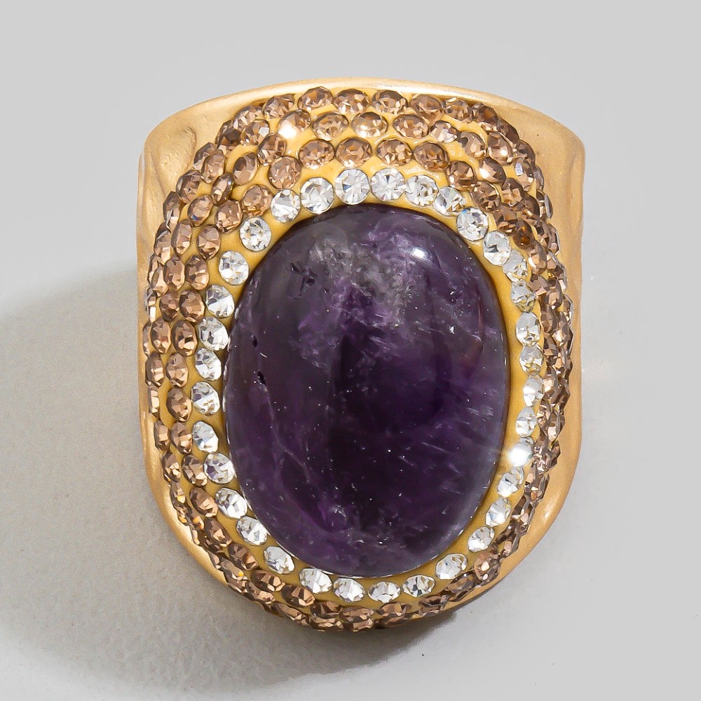 • Stay on-trend and stand out from the crowd, this ring evokes a captivating oval amethyst stone pave statement design. Redefine your fashion identity with this versatile ring, a timeless piece that complements any wardrobe. Available in GD, SL. This item is sold in packs of 1.